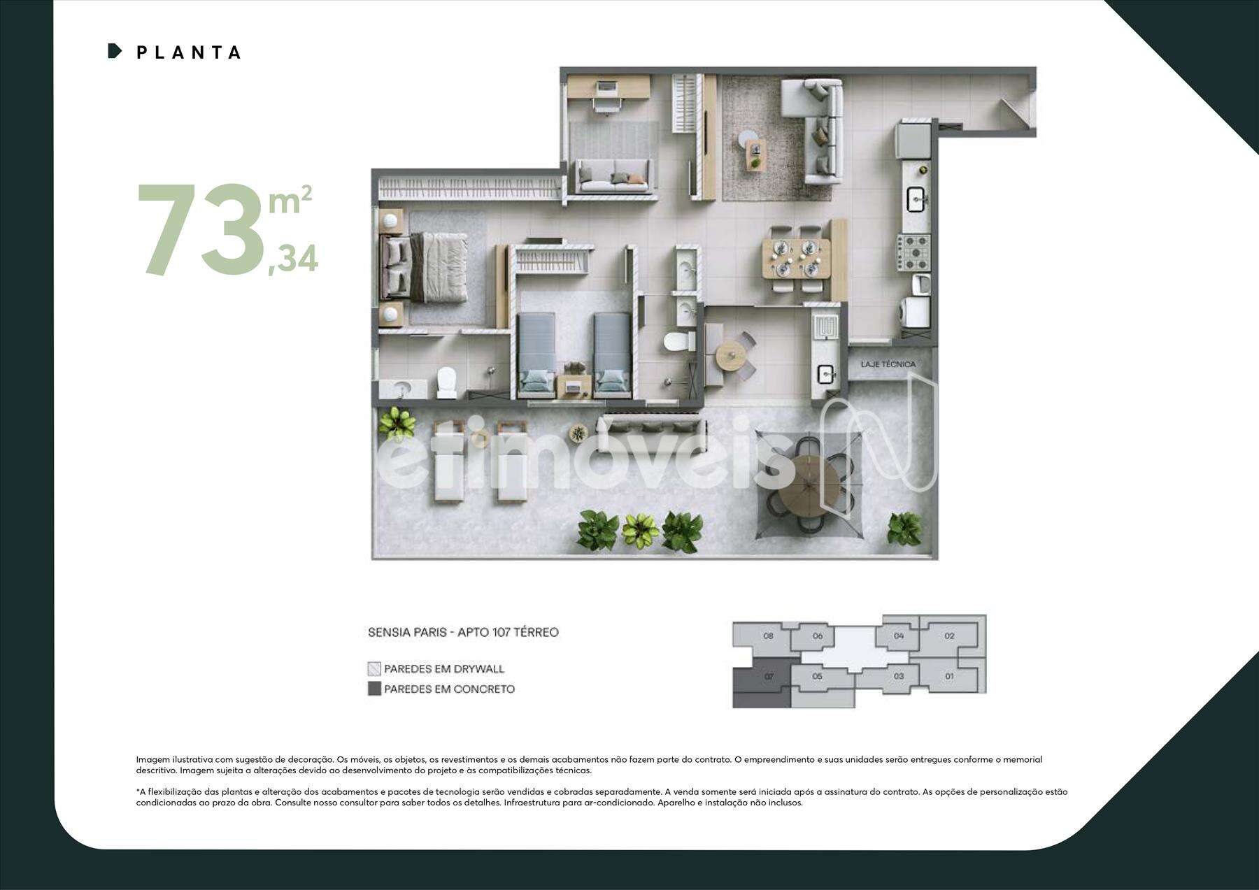 - Unidades de 3 quartos com 73,34m²