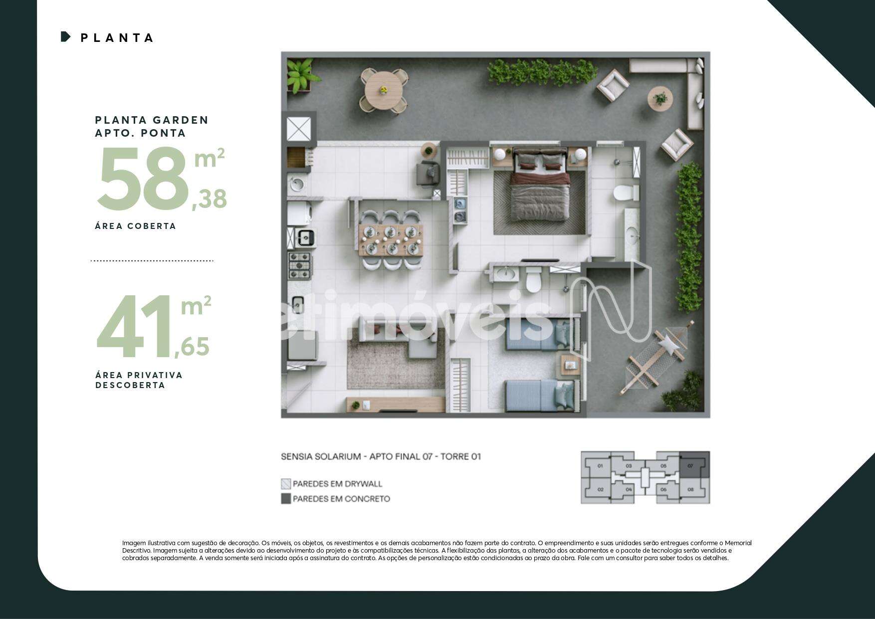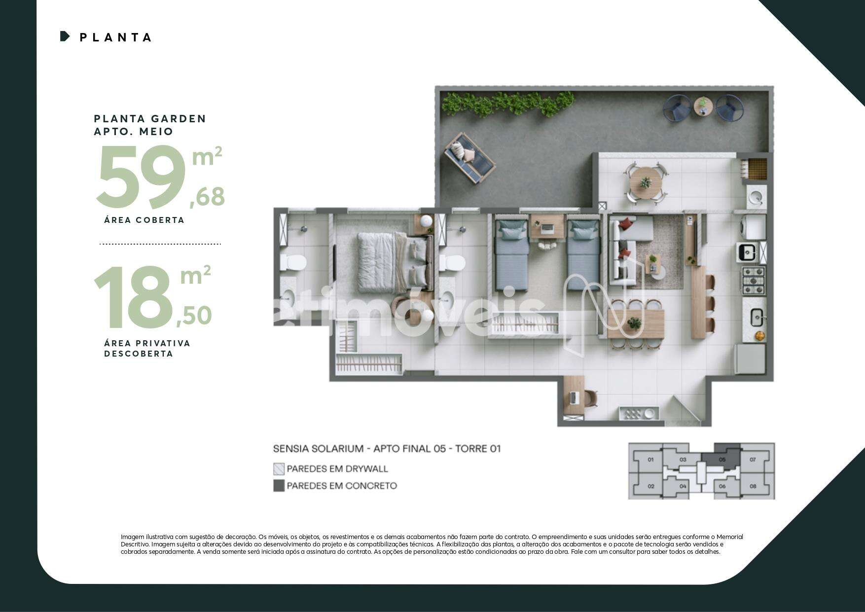 - Unidades garden de 2 quartos com 59,68 m² interno + 41,65 m² externo.