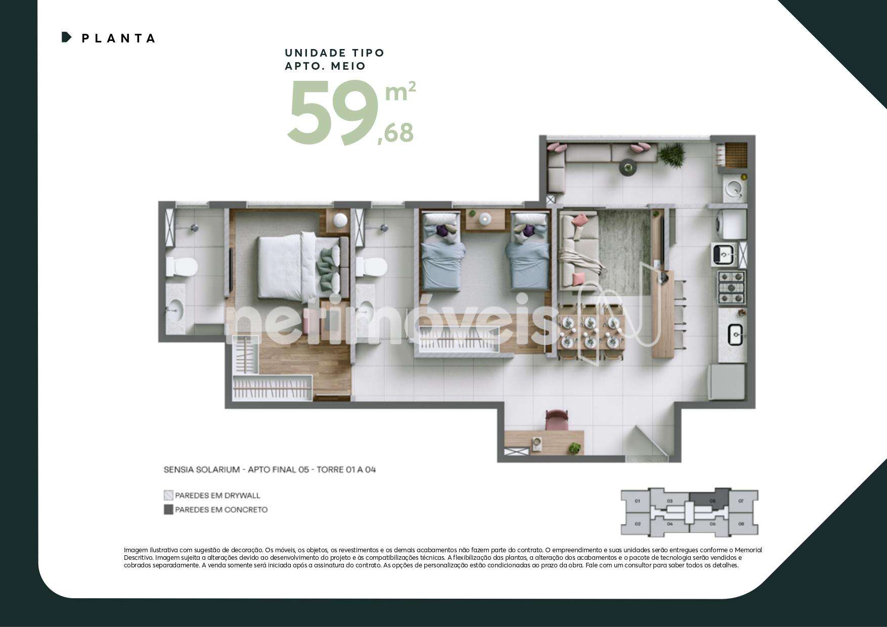 - Unidades tipo de 2 quartos com 58,38 m² a 59,68 m².