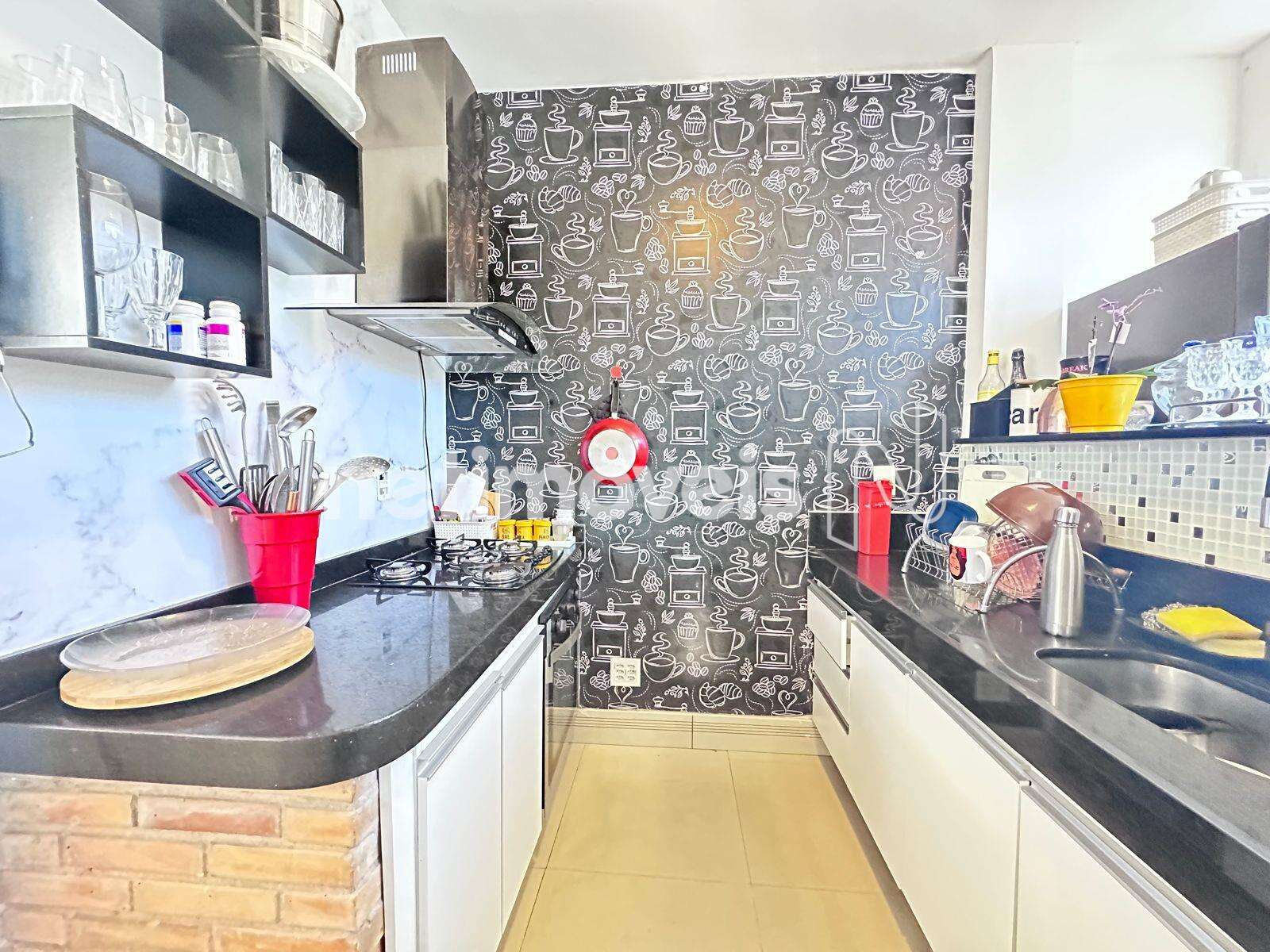 • Cozinha com armários e área de serviço, piso em porcelanato.