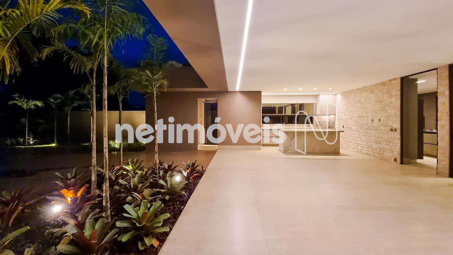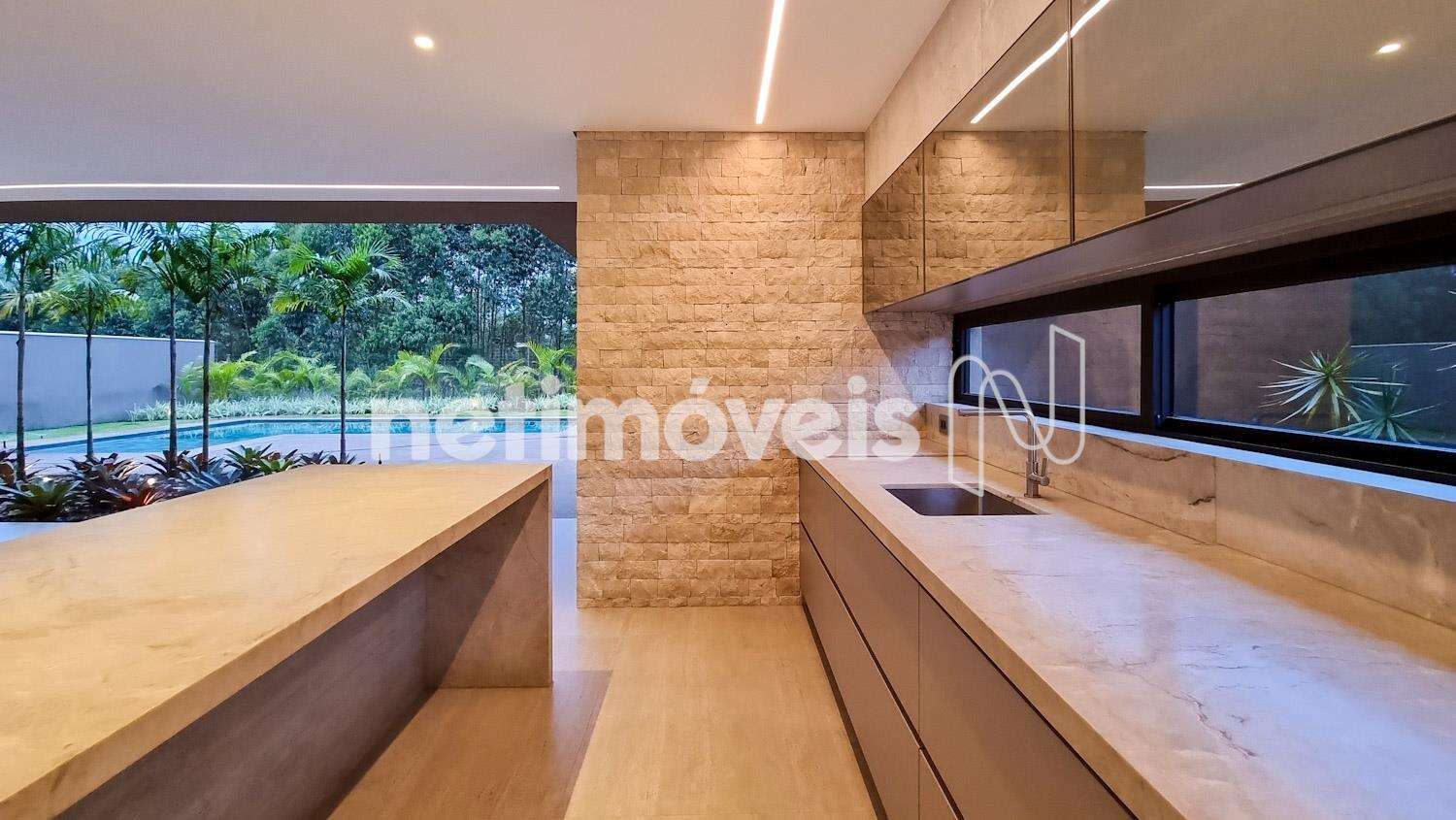 A casa foi projetada para oferecer momentos de lazer ao ar livre, com uma área gourmet e um gramado perfeitos para encontros, bancadas em Quartzito Monalisa e paredes com detalhe em Travertino, lavabo, sauna, piscina com hidromassagem e deck atérmico Solarium.
