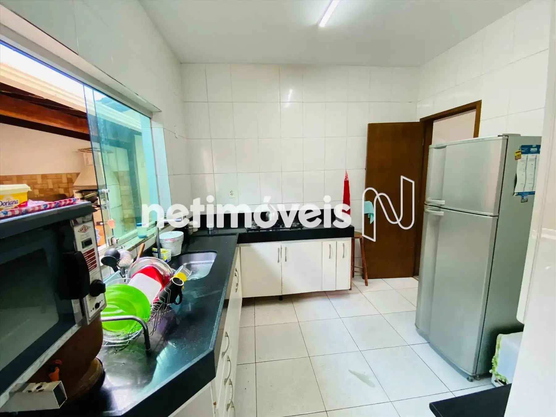 Cozinha ampla com armário e bancada granito.