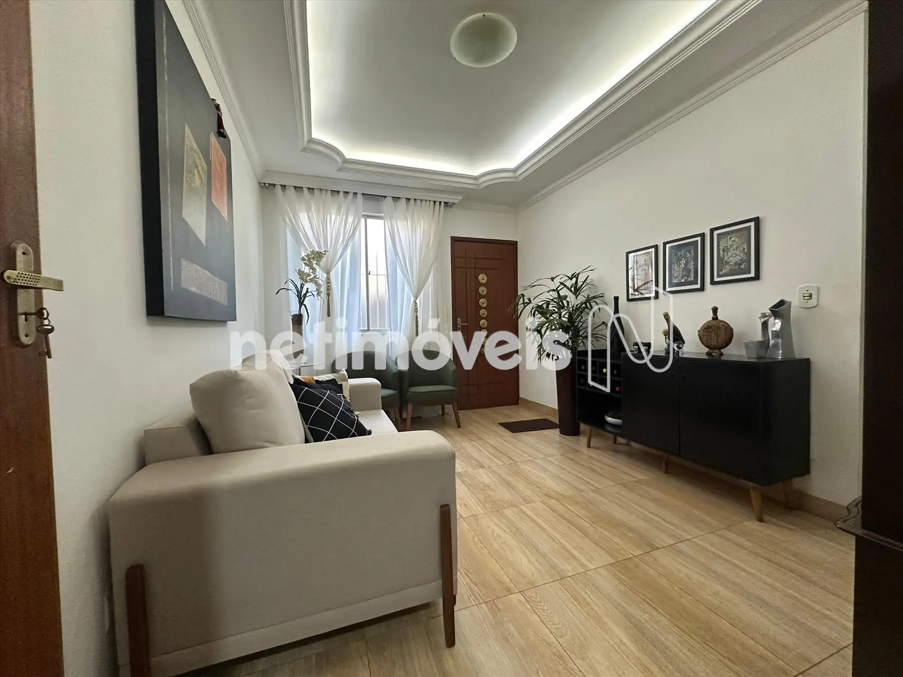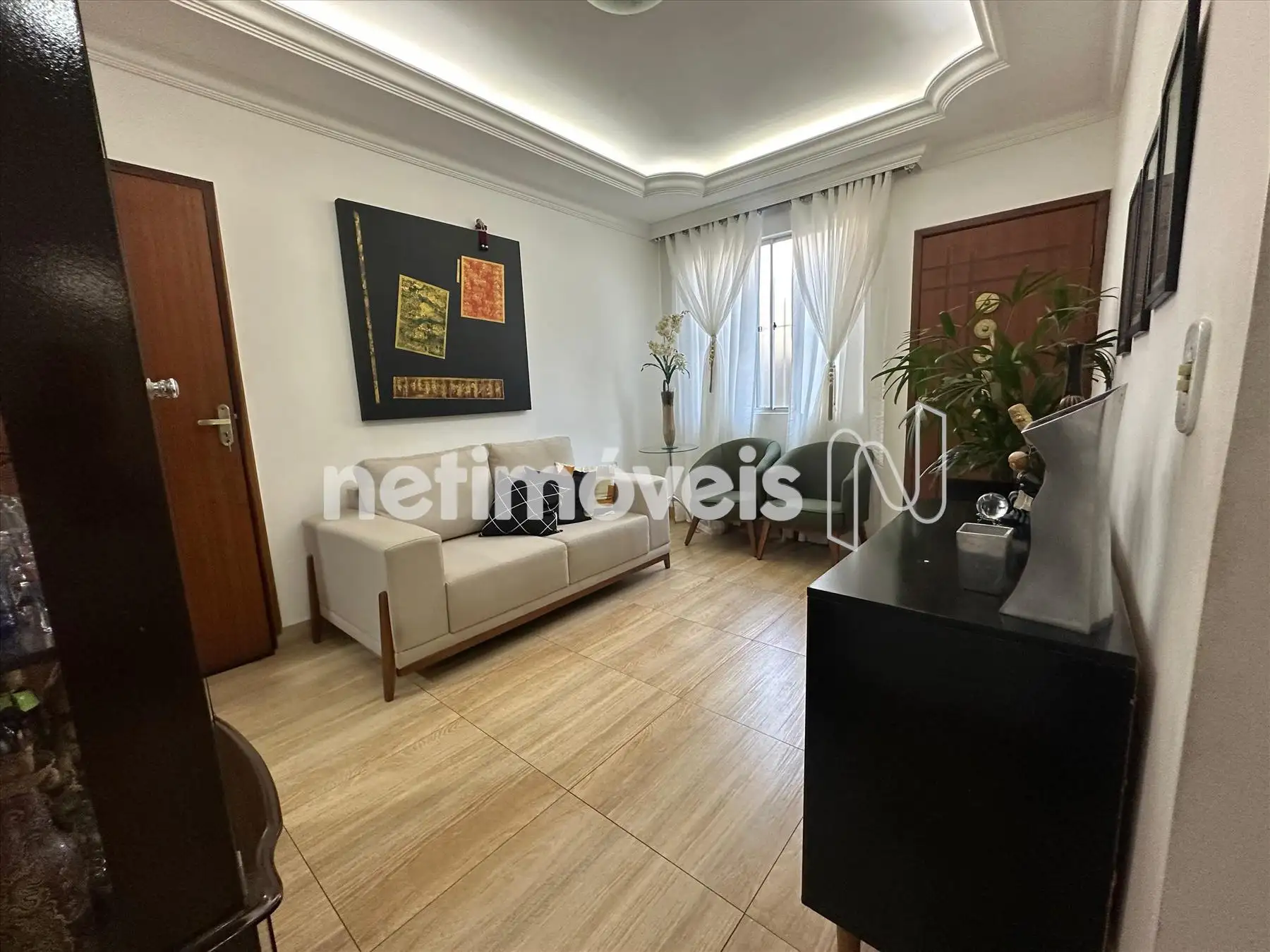 Sala de visitas aconchegante. Com piso em porcelanato e teto rebaixado em gesso, iluminação indireta que traz sofisticação ao ambiente;