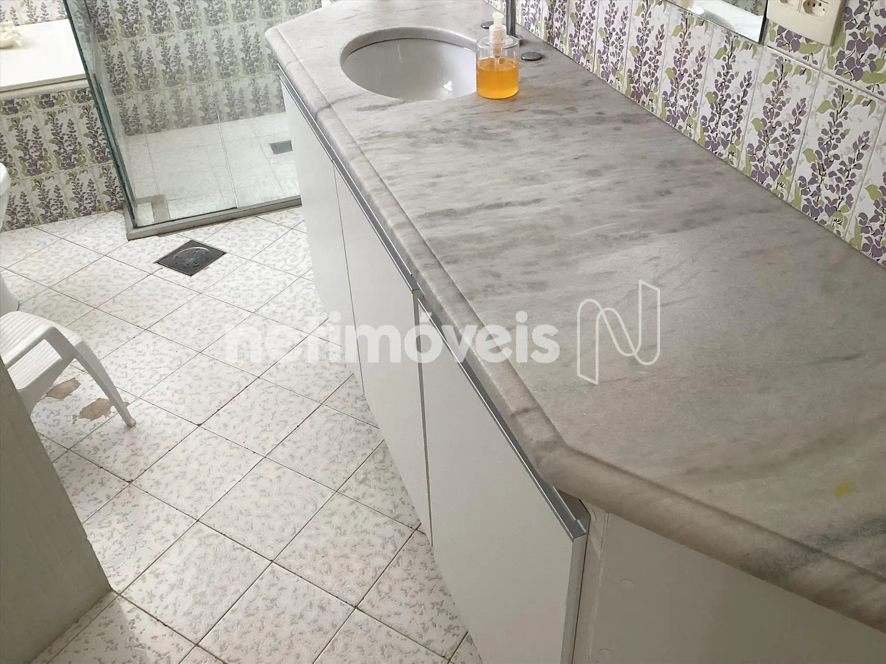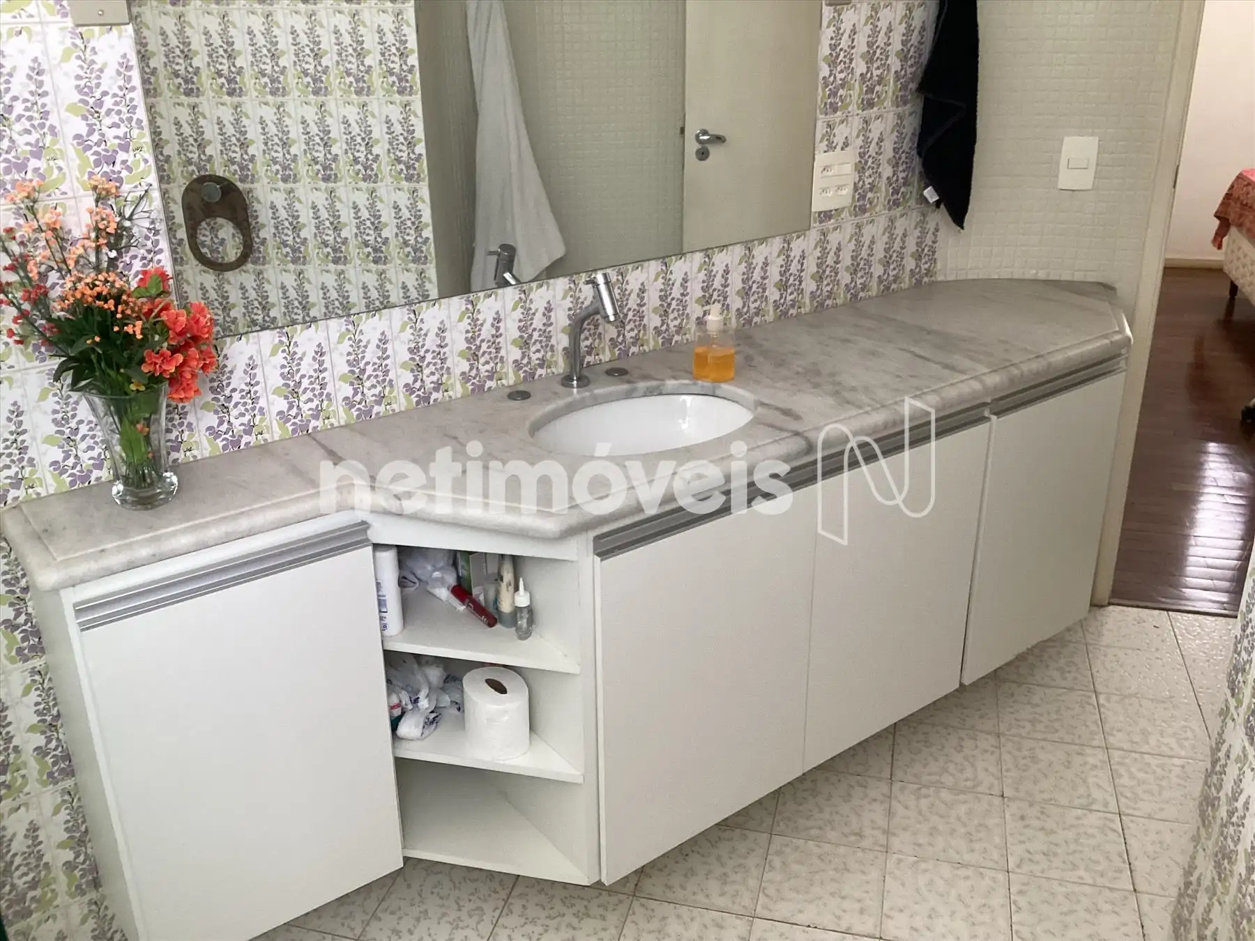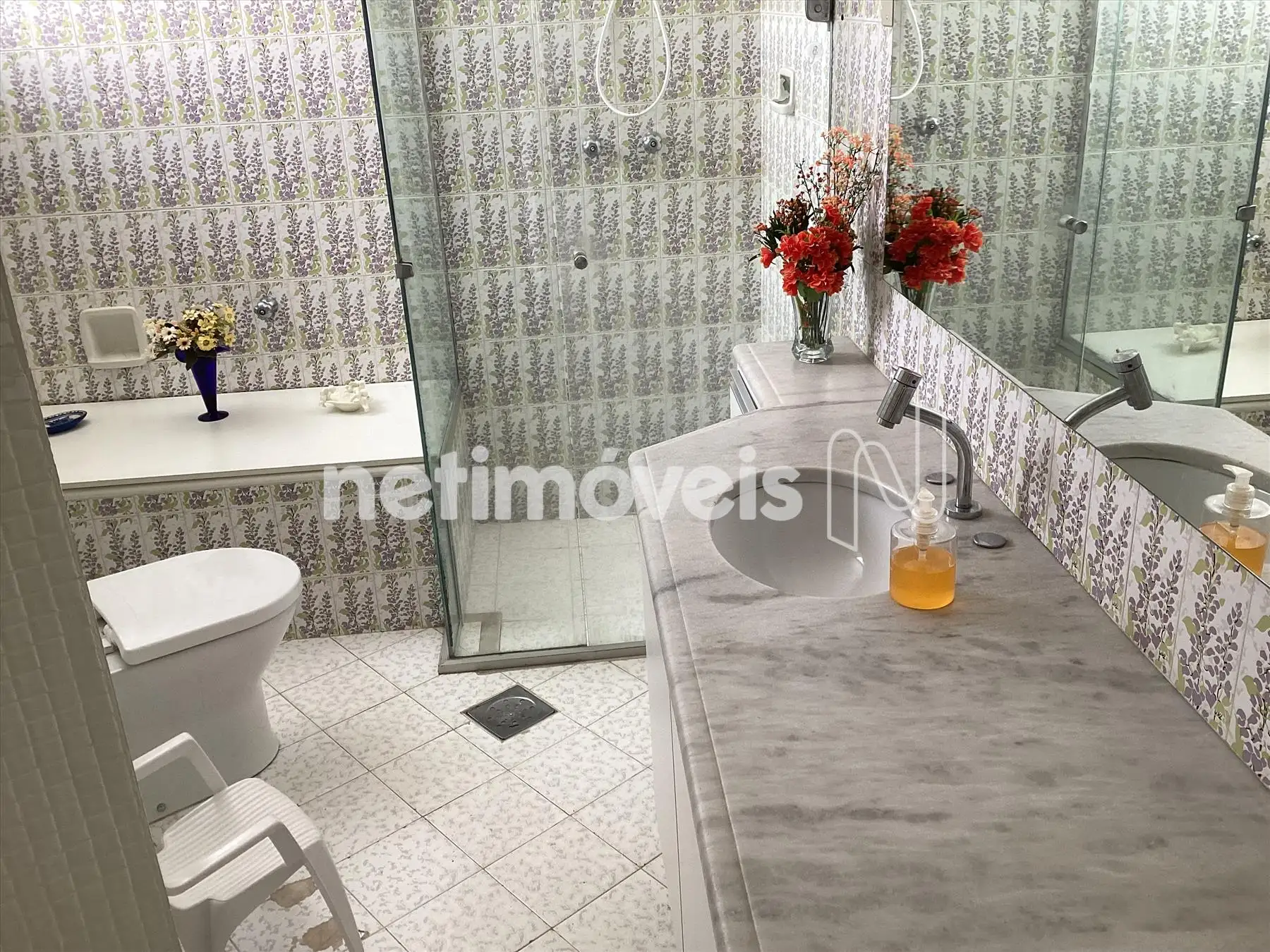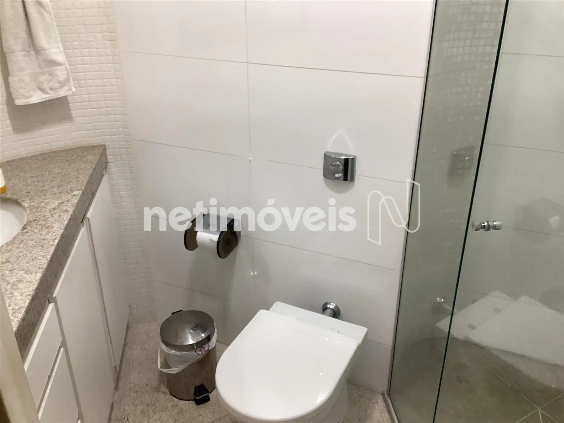 Banheiro social amplo, com armário, bancada em mármore e box blindex.