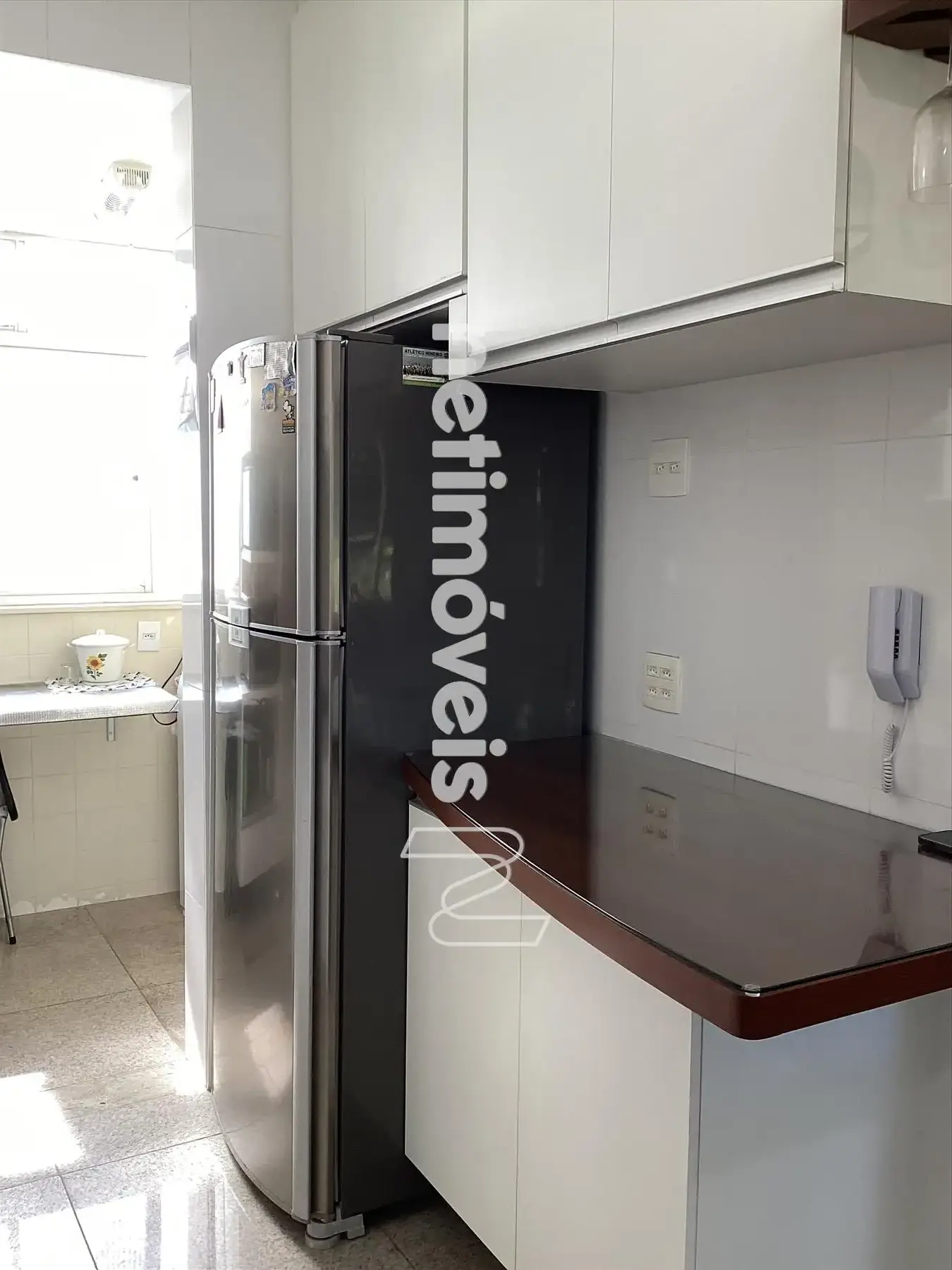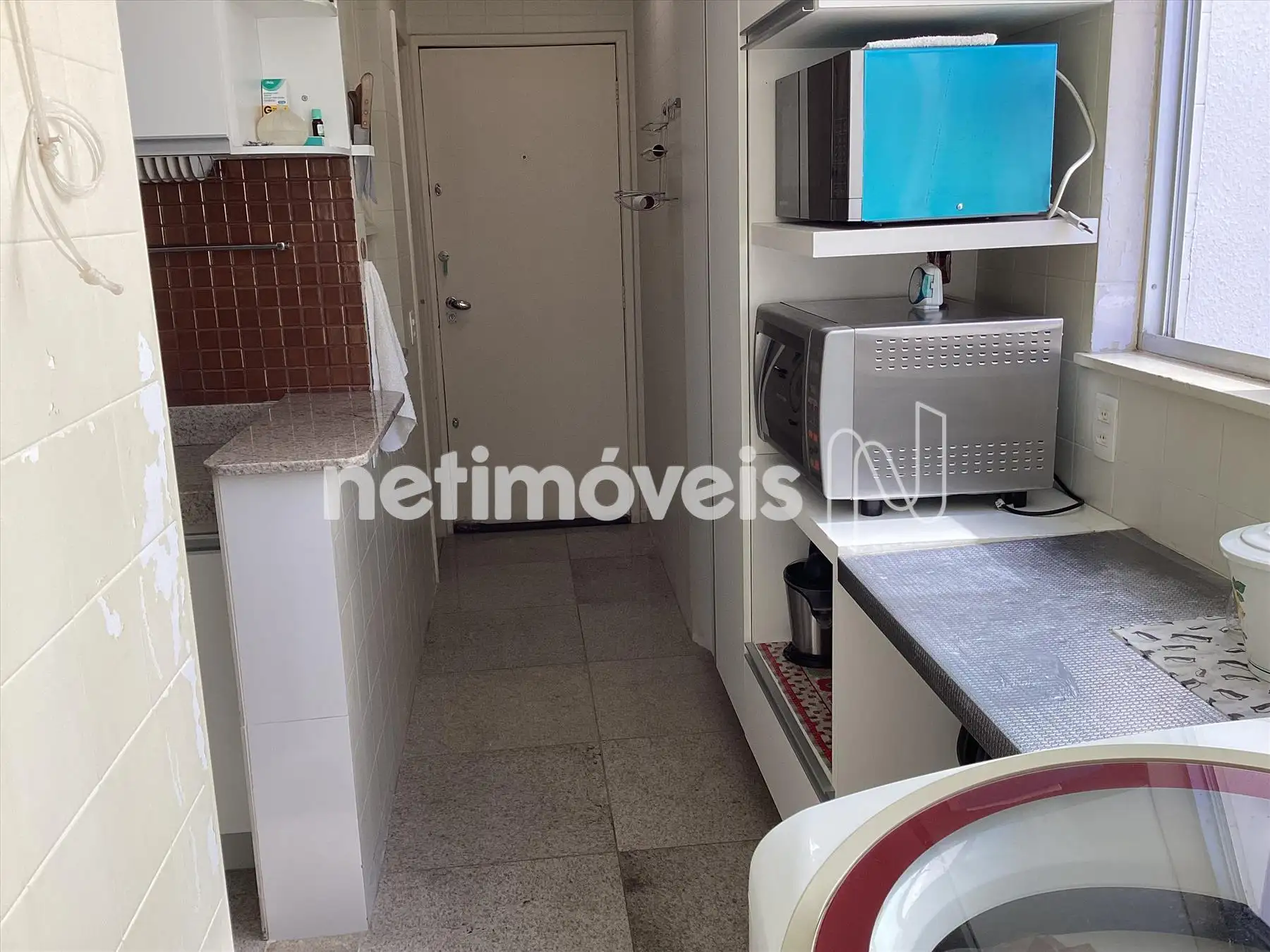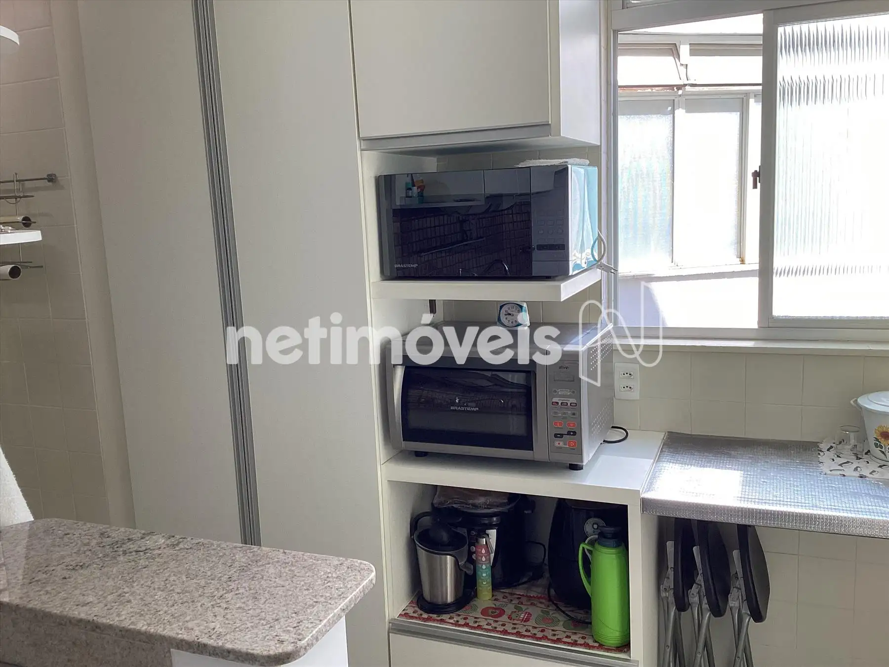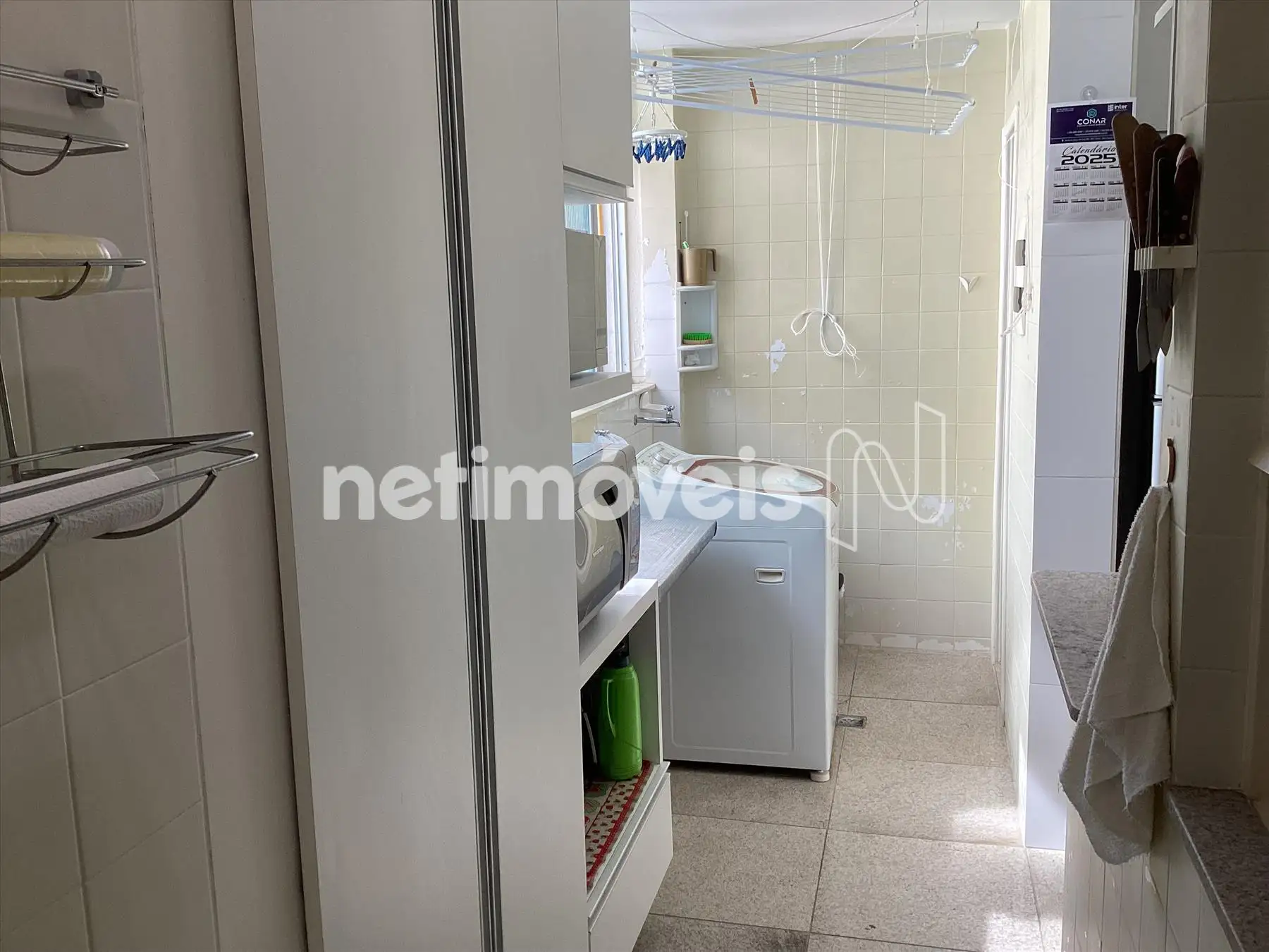 Área de serviço clara e bem arejada com armários, piso em granito.
