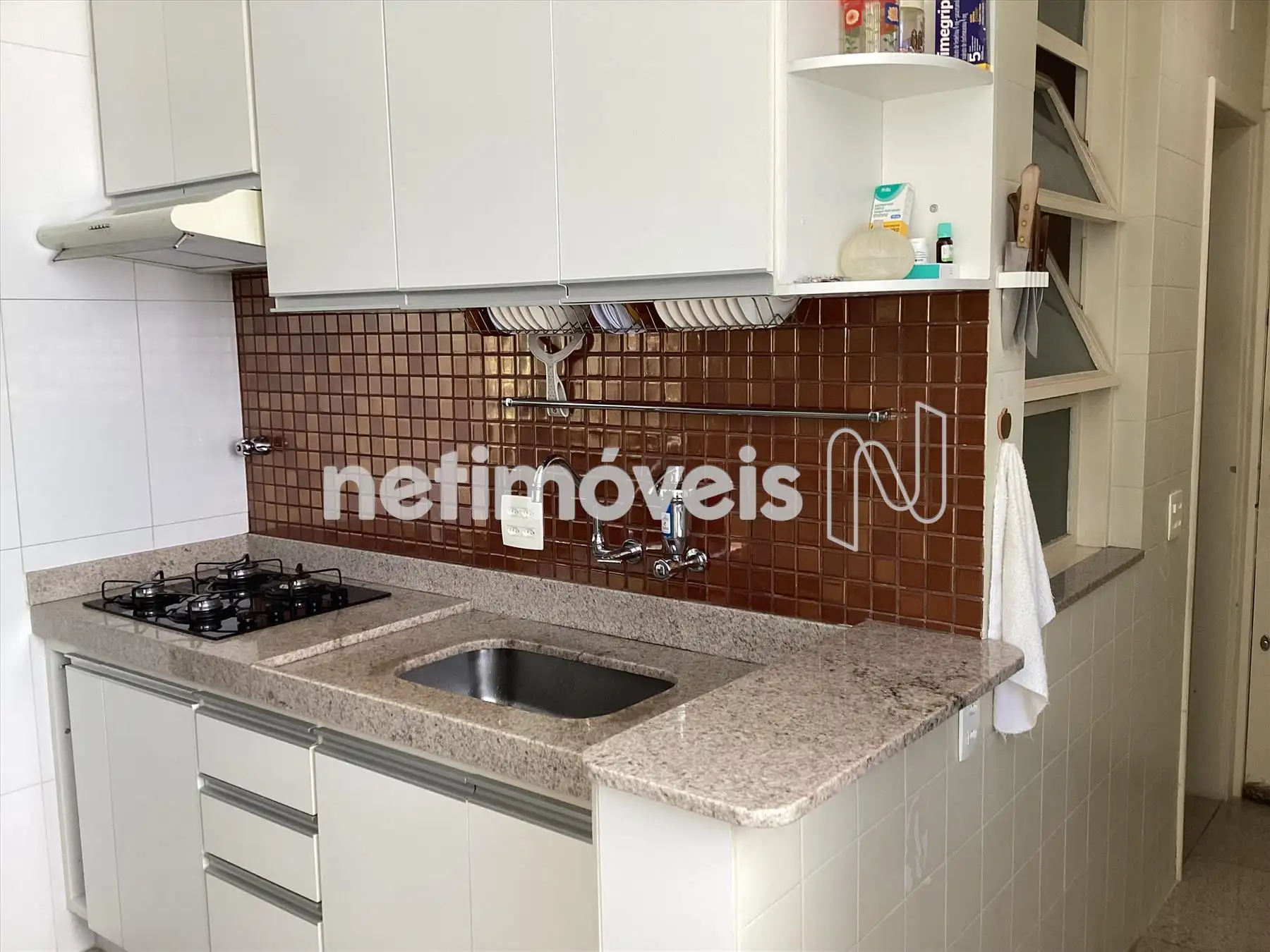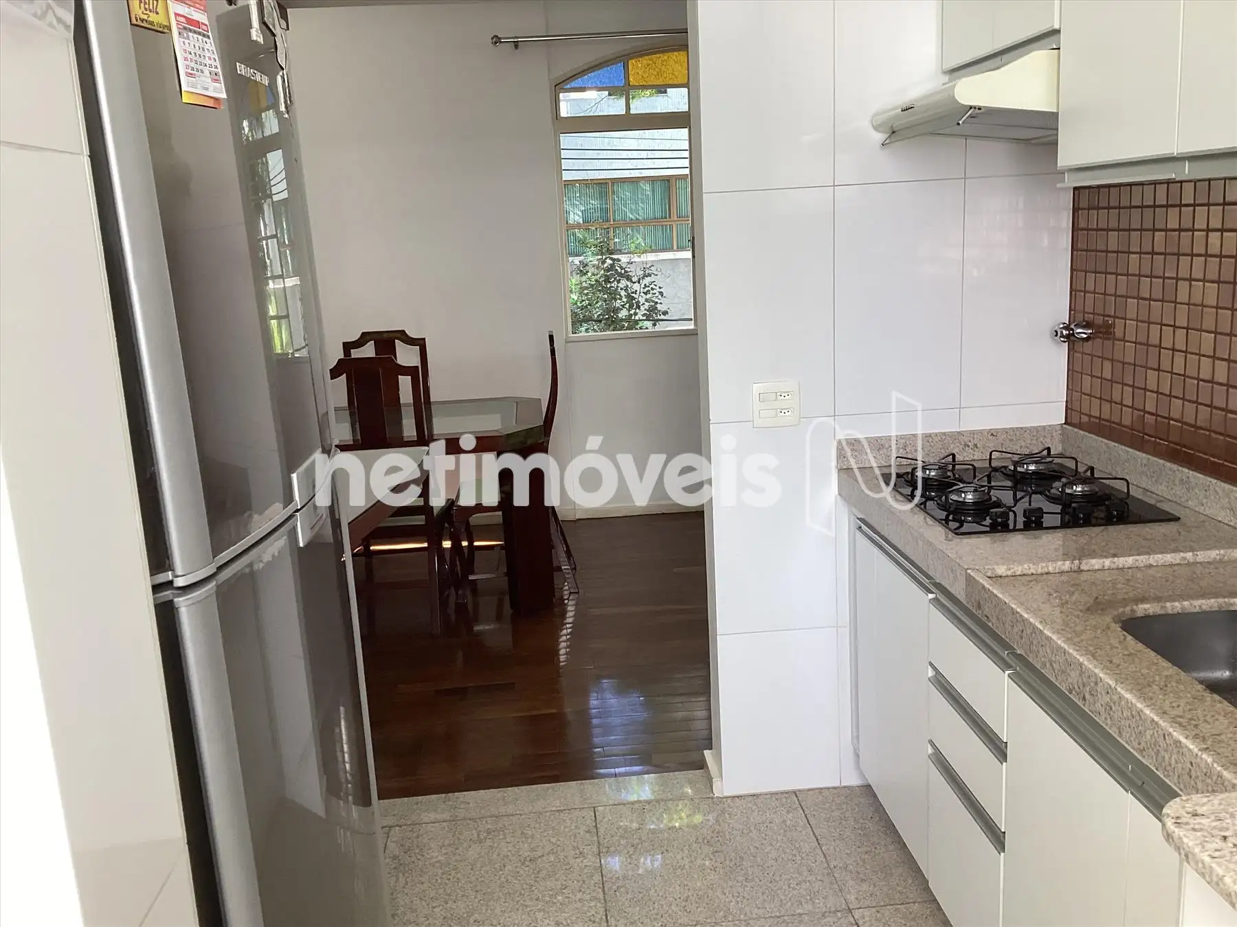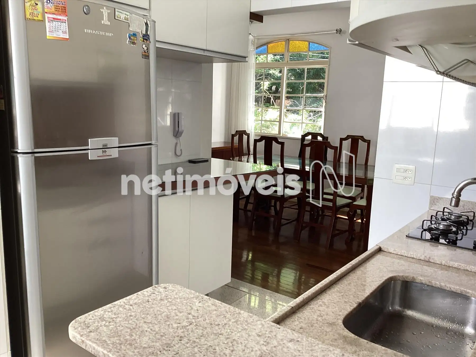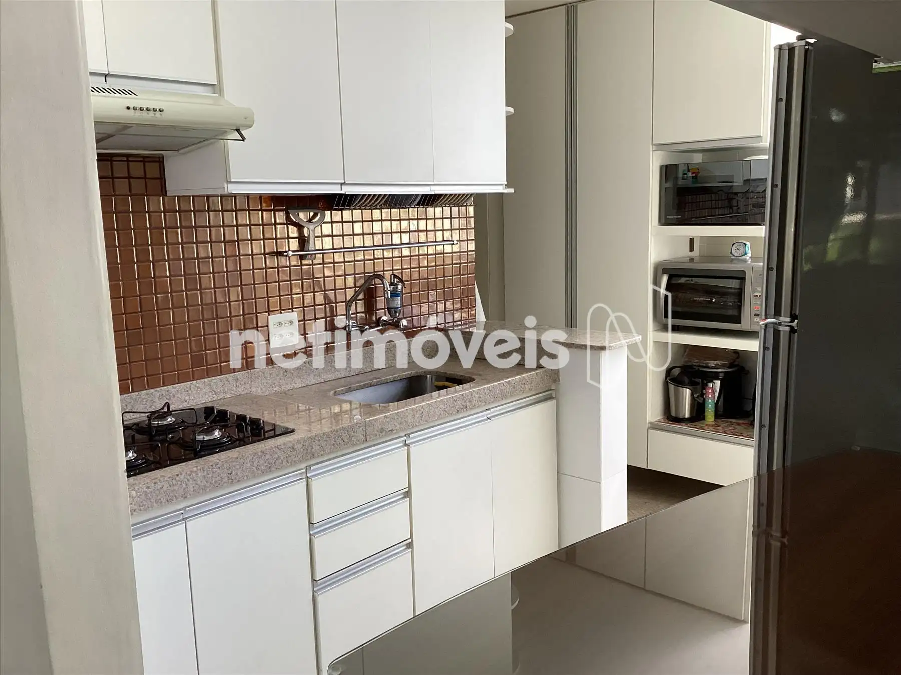 Cozinha toda reformada, com armários, piso e bancada em granito.