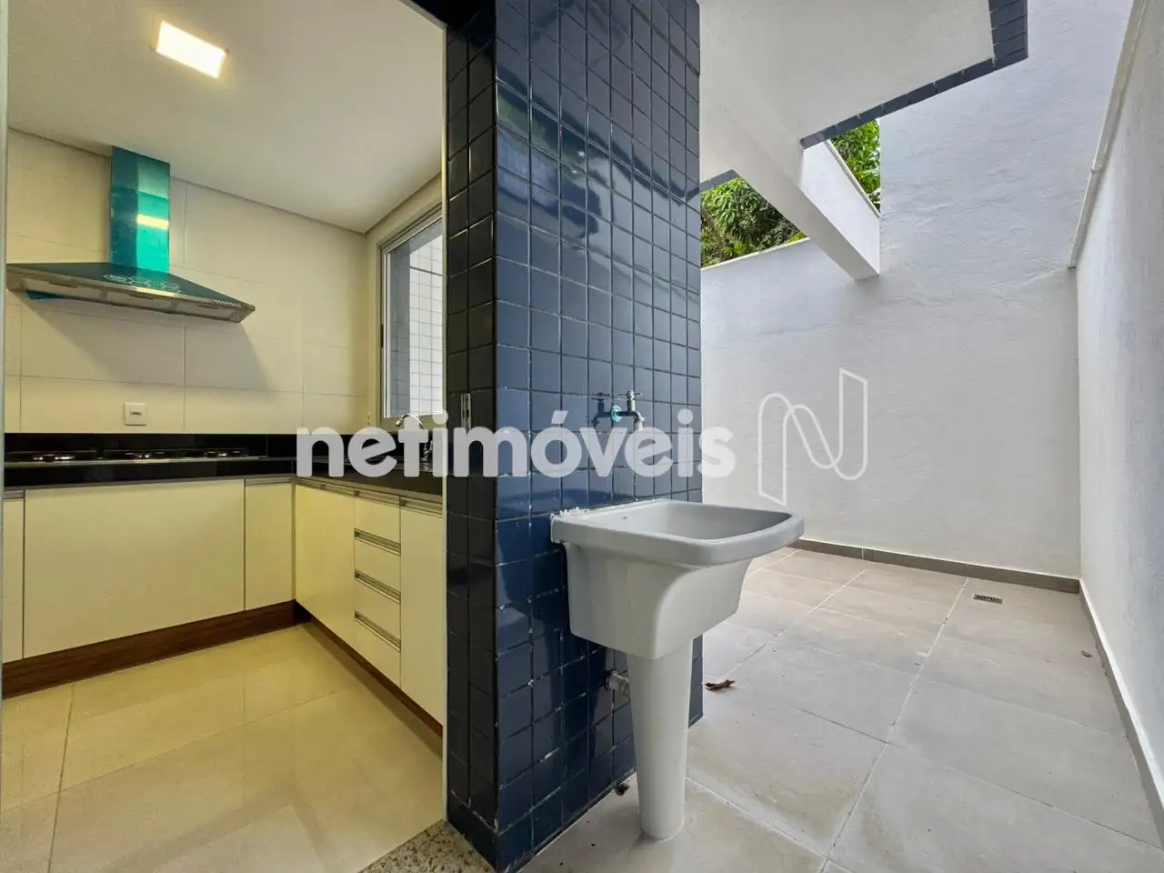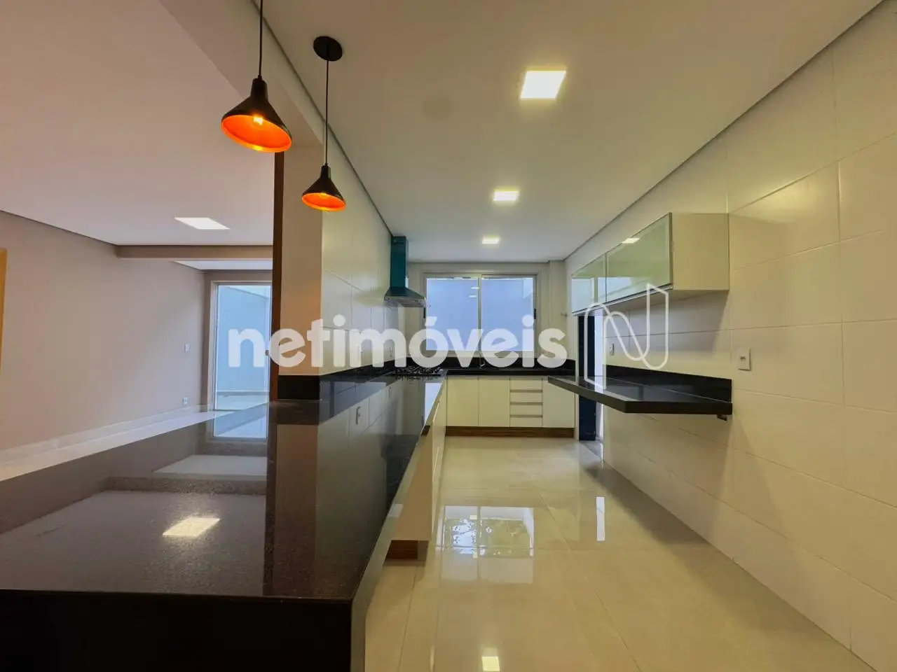 Cozinha estilo americana, com armários novos, coifa, cooktop, bancadas e iluminação; área de serviço.