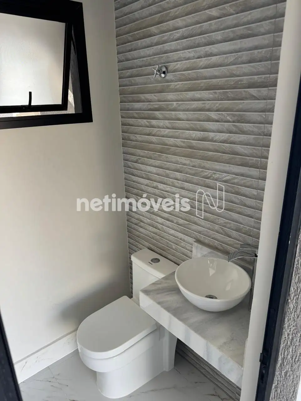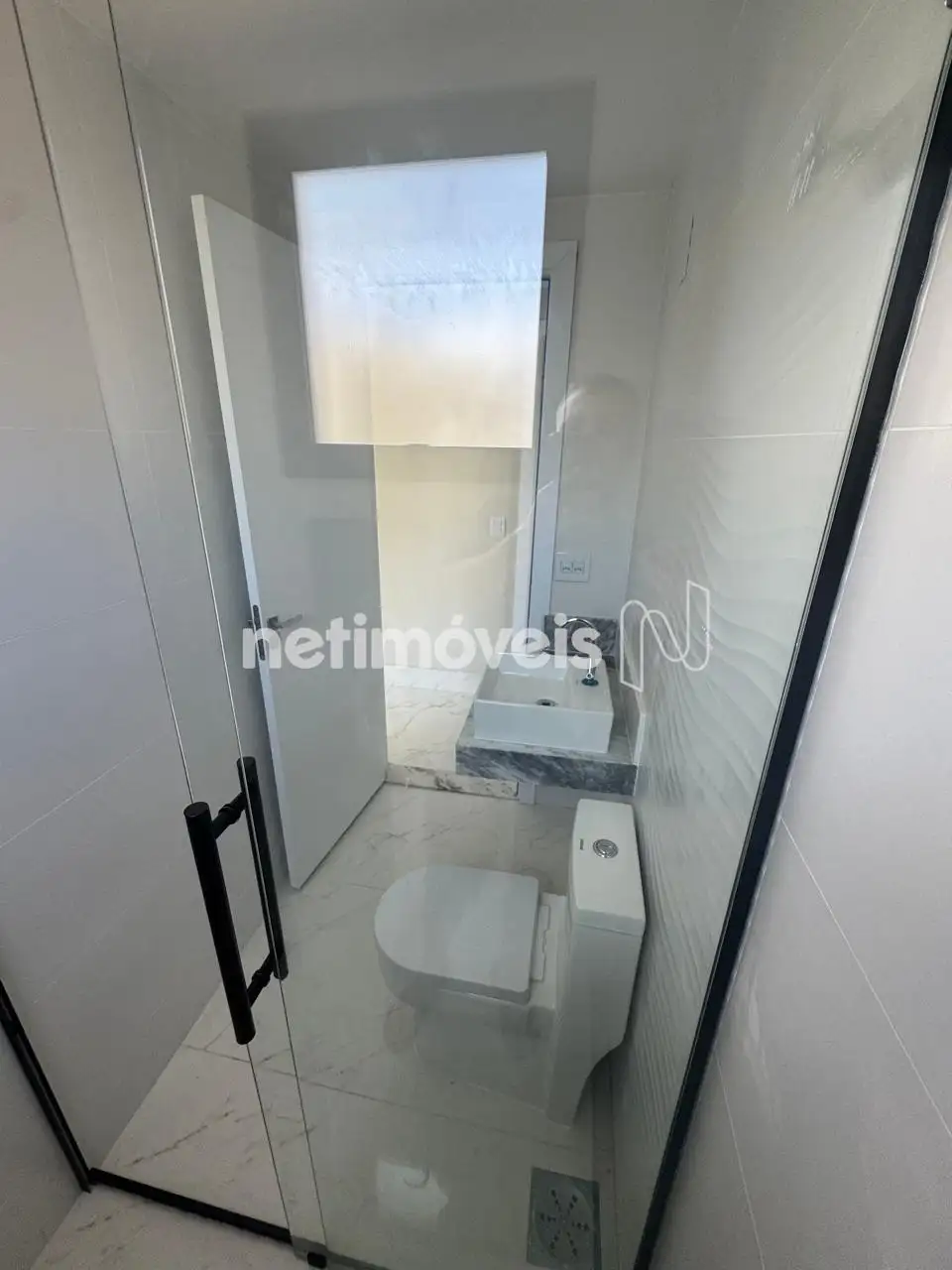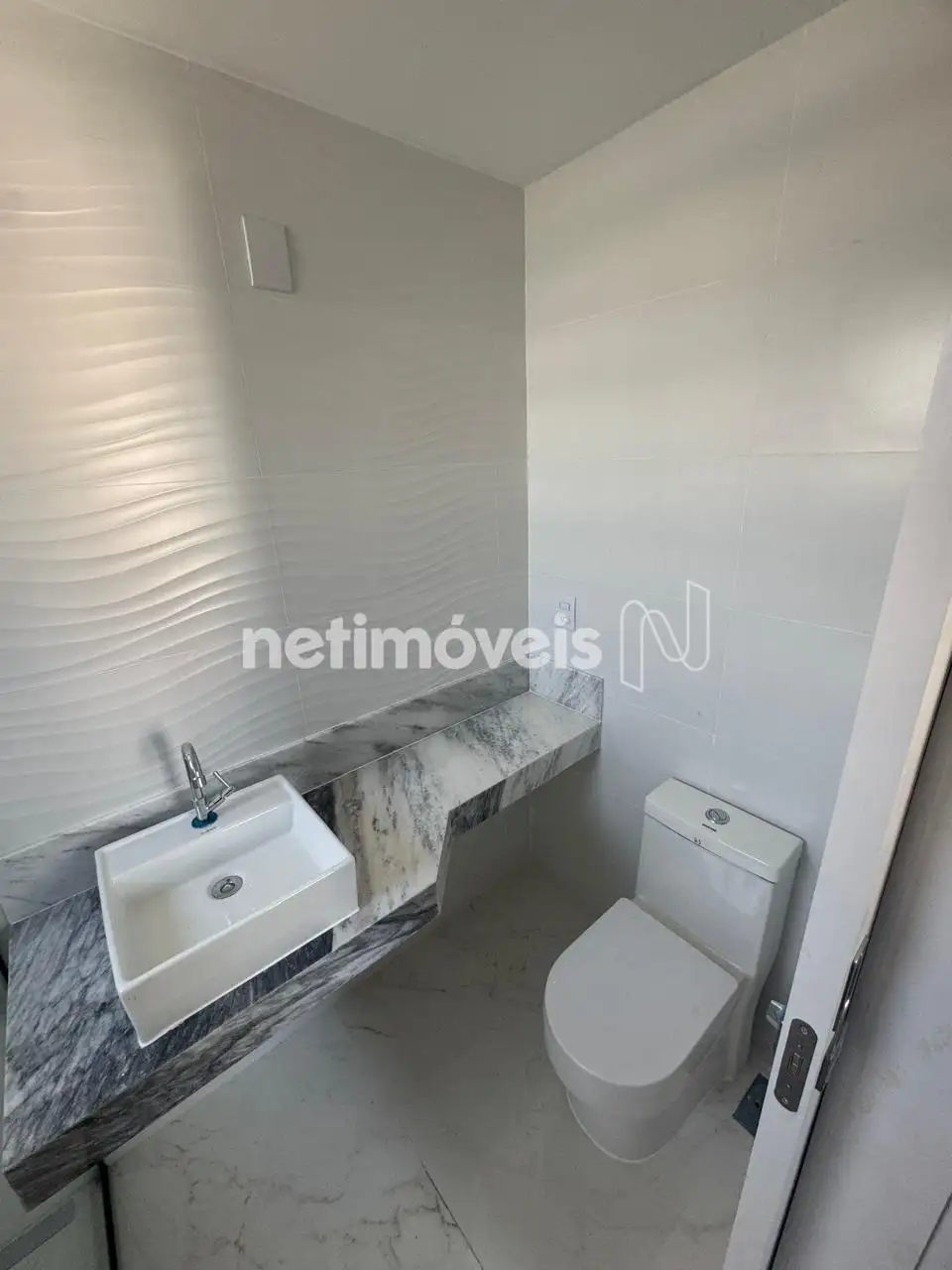 Banho social com piso em porcelanato, bancada em granito,