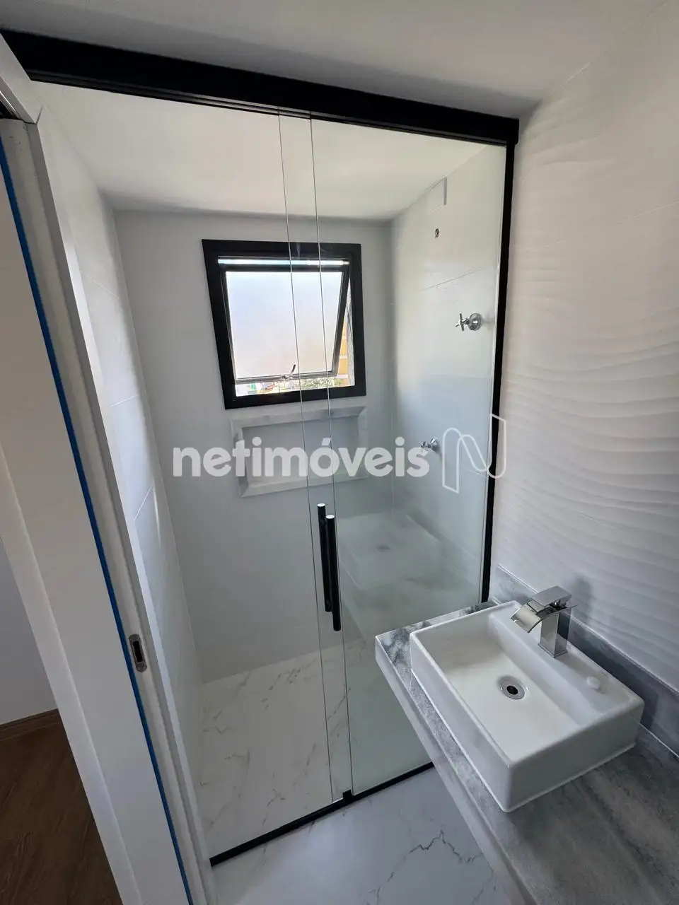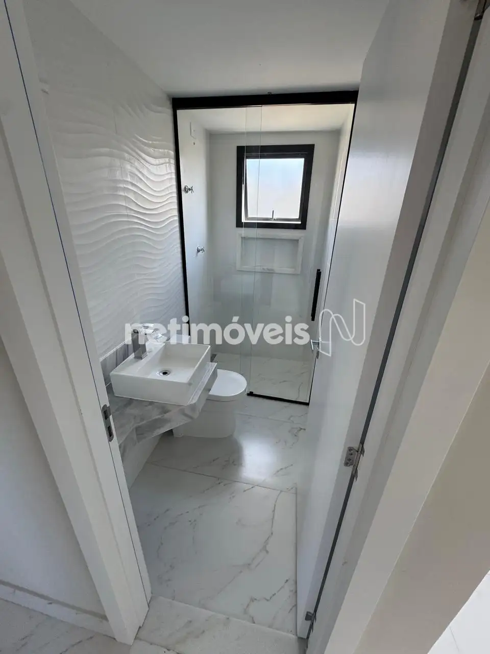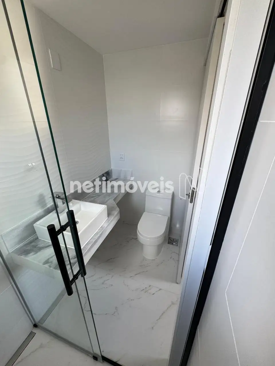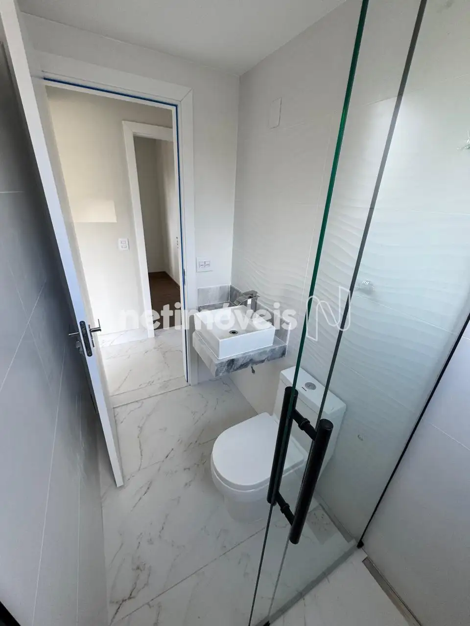 Banho social com piso em porcelanato, bancada em granito,