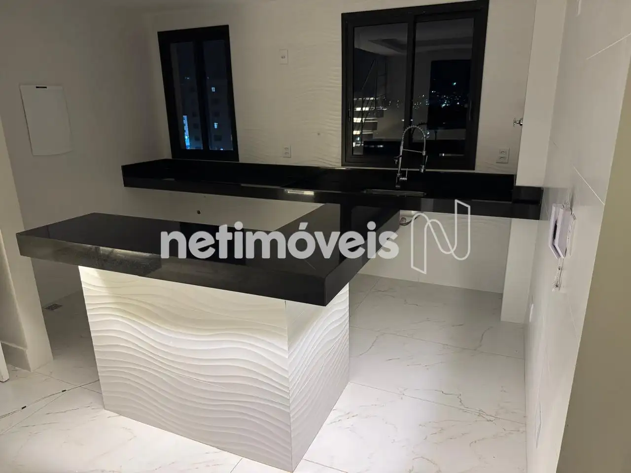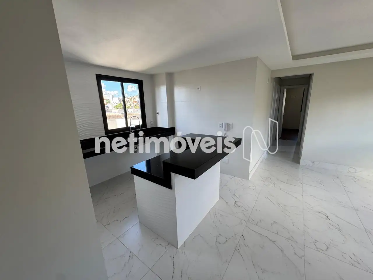 Cozinha americana ampla com piso porcelanato, bancada em granito,