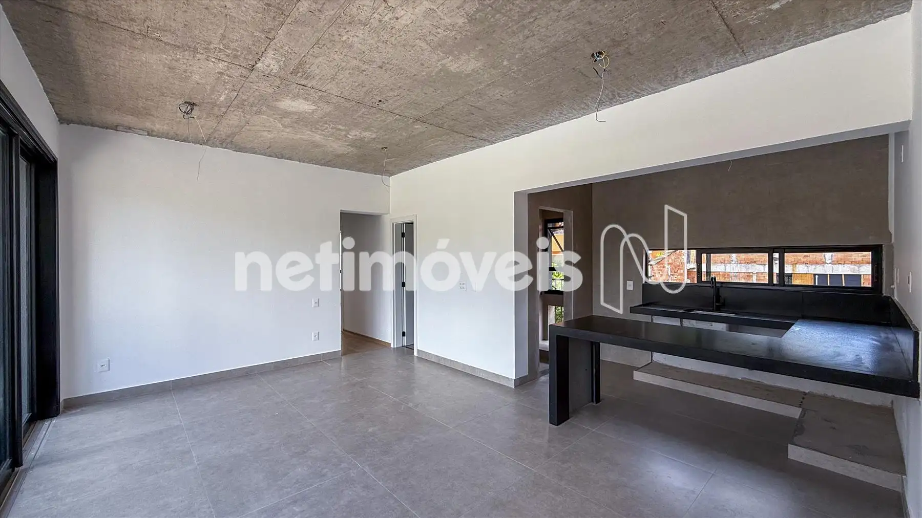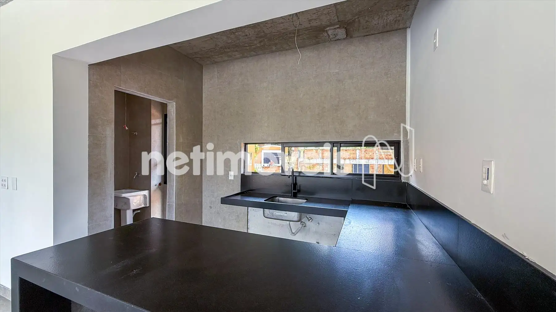 A cozinha é clara, arejada e funcional, equipada com bancada em granito negro, ideal para quem valoriza praticidade sem abrir mão da elegância. Ao lado, a área de serviço oferece organização e praticidade ao dia a dia.