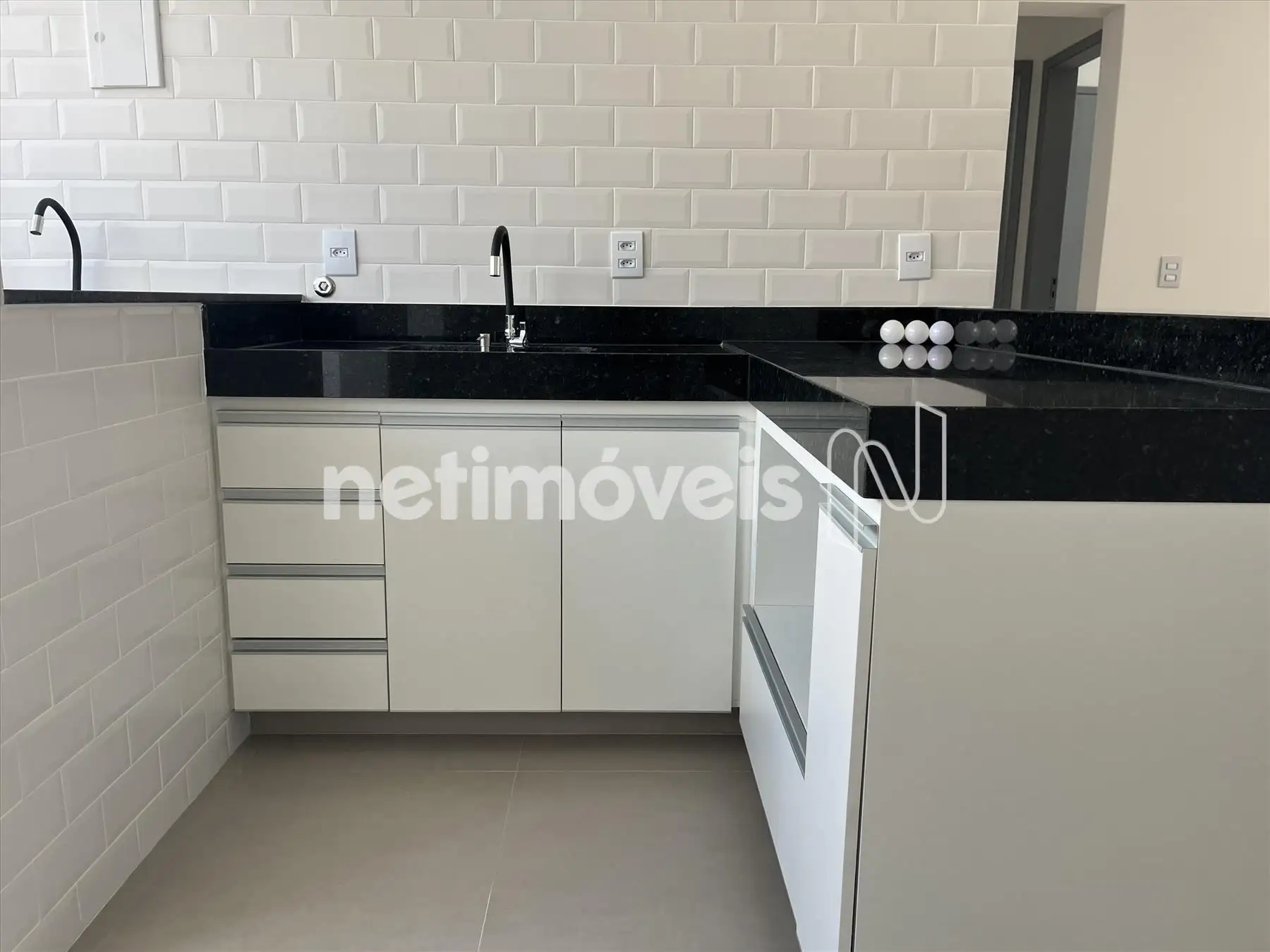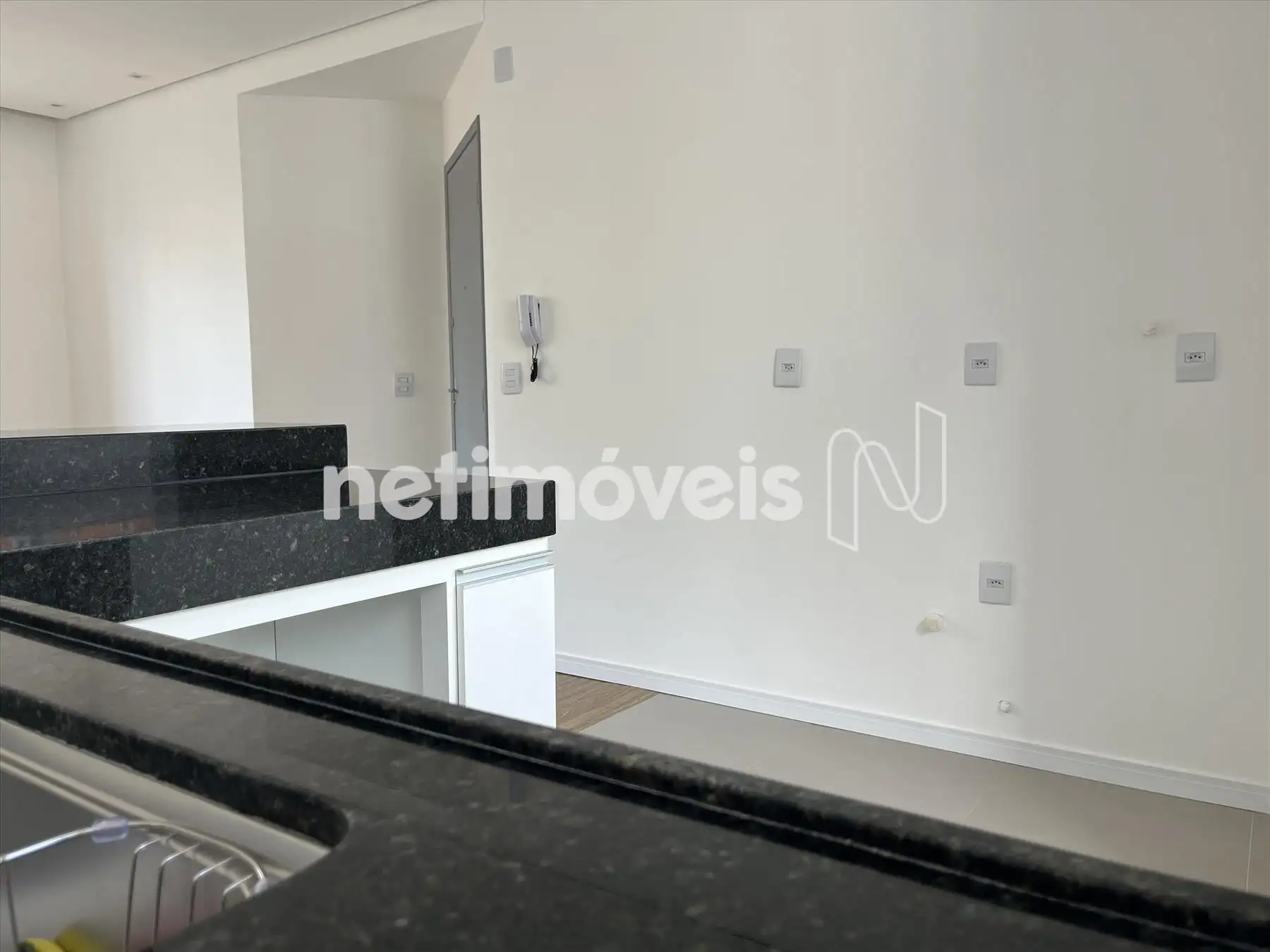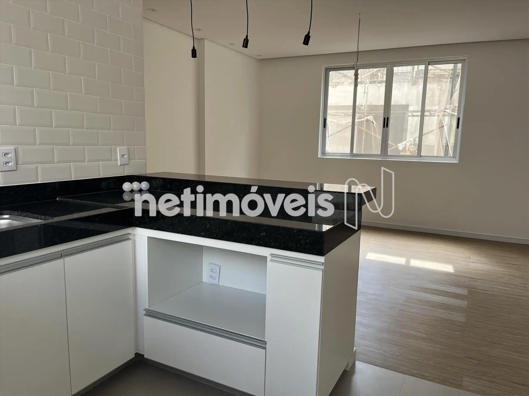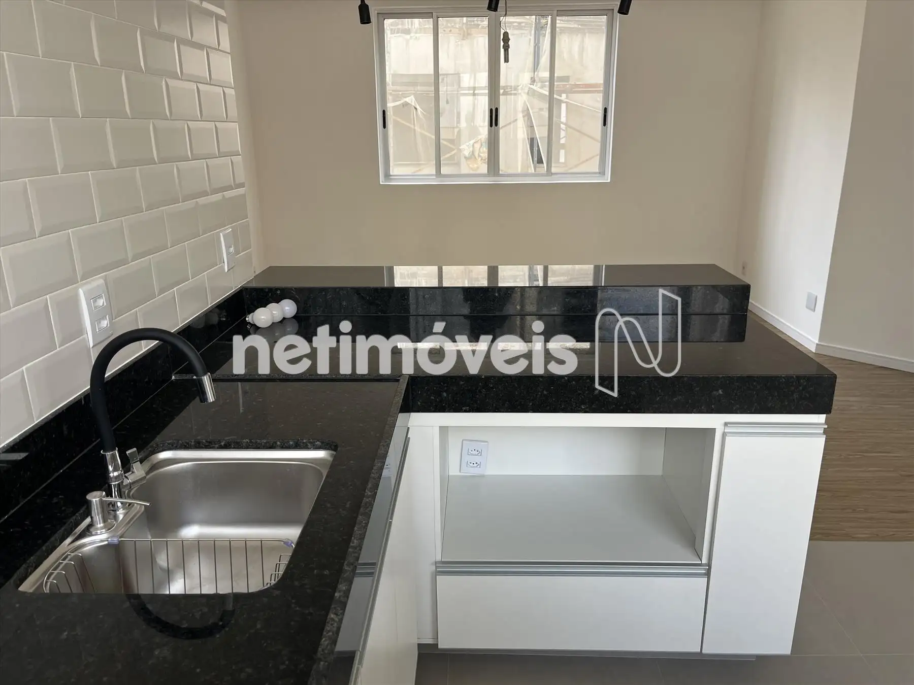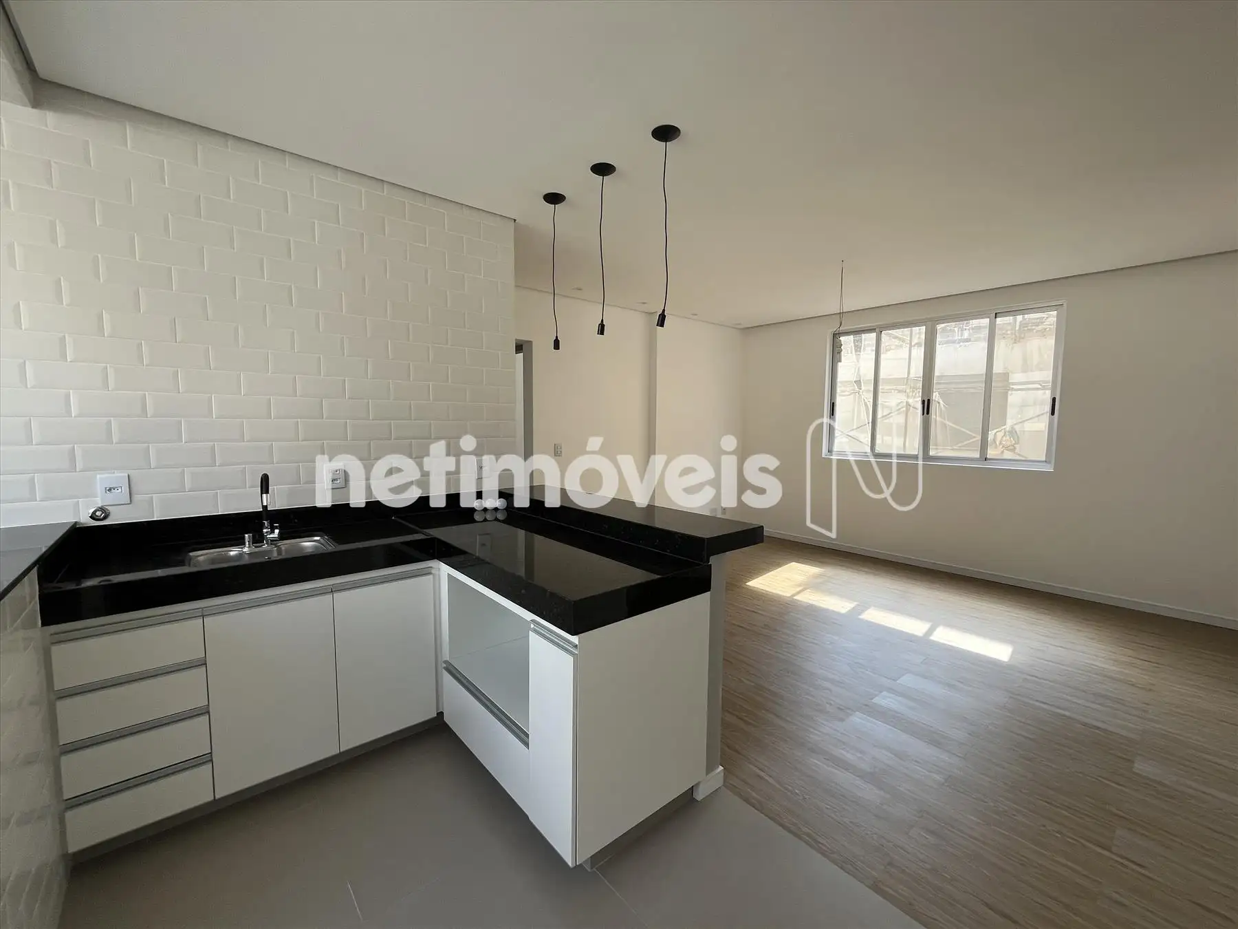 Cozinha americana integrada a sala com bancadas em granito, armários planejados sob as bancadas; amplo espaço e saída d'água para geladeira e para maquina de lavar louças;