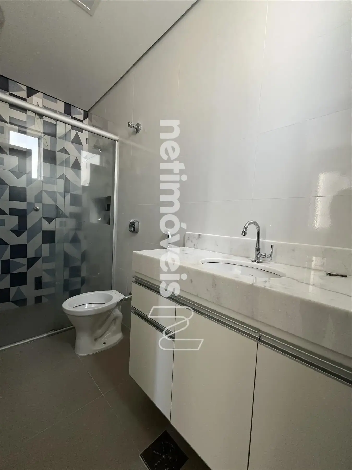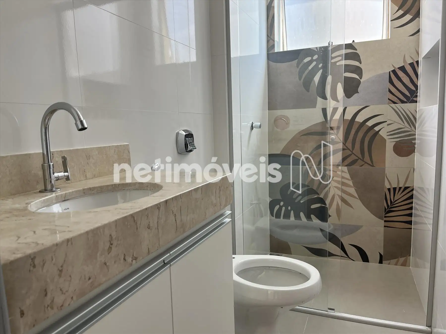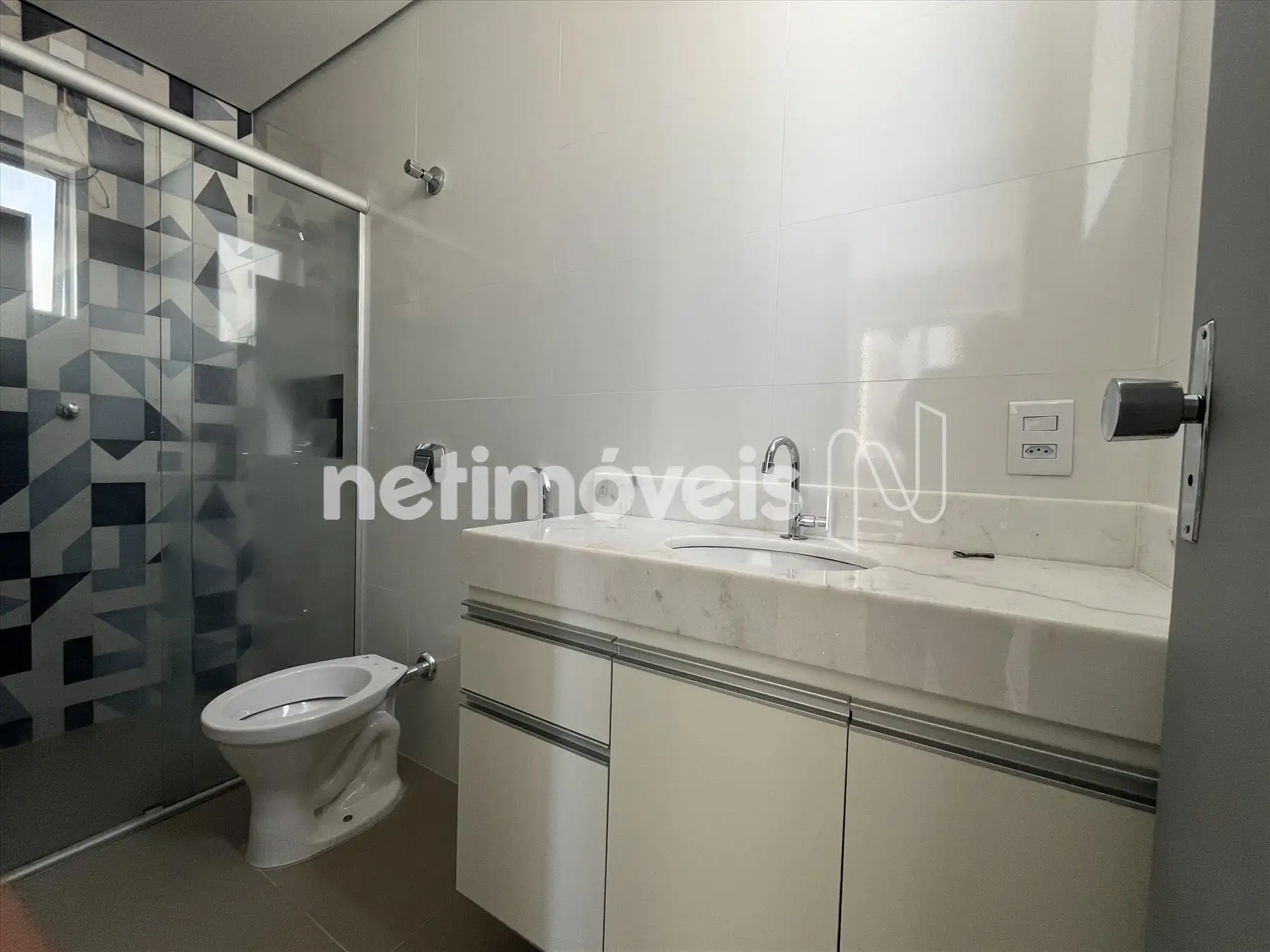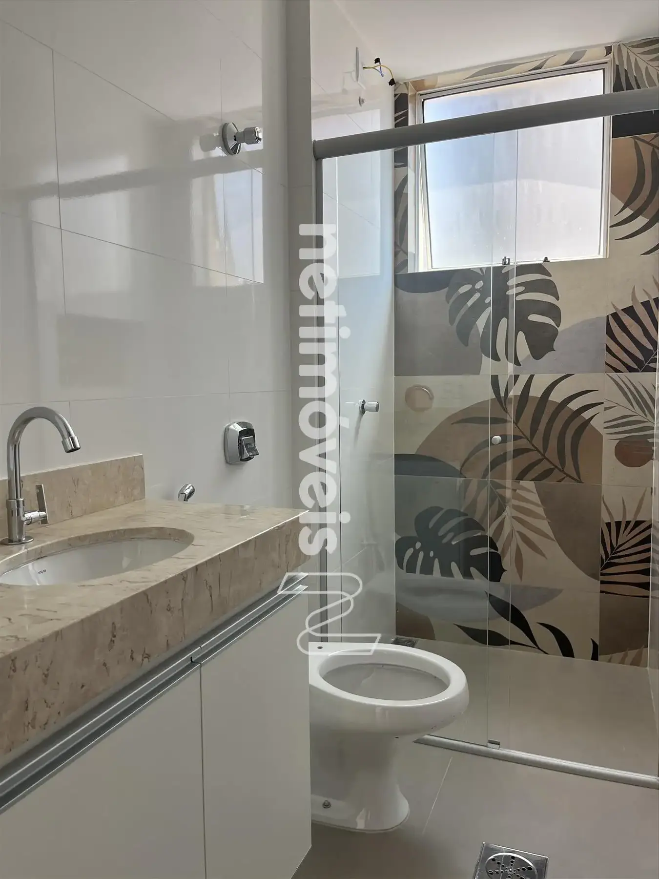 Banhos da suíte e social totalmente reformados com nicho e box tipo blindex, piso em porcelanato, bancada em mármore Marta Rocha e armários sob a bancada;
