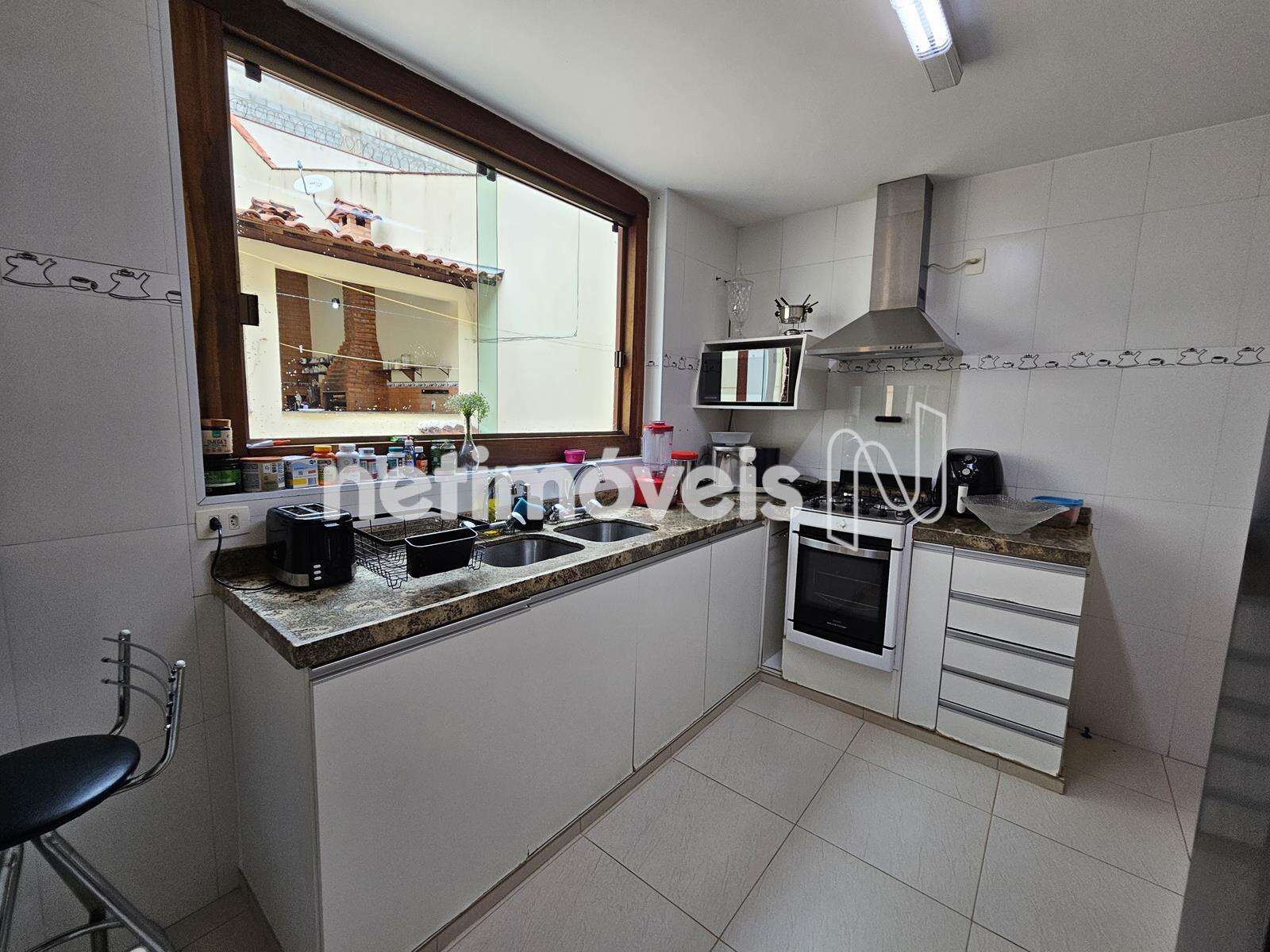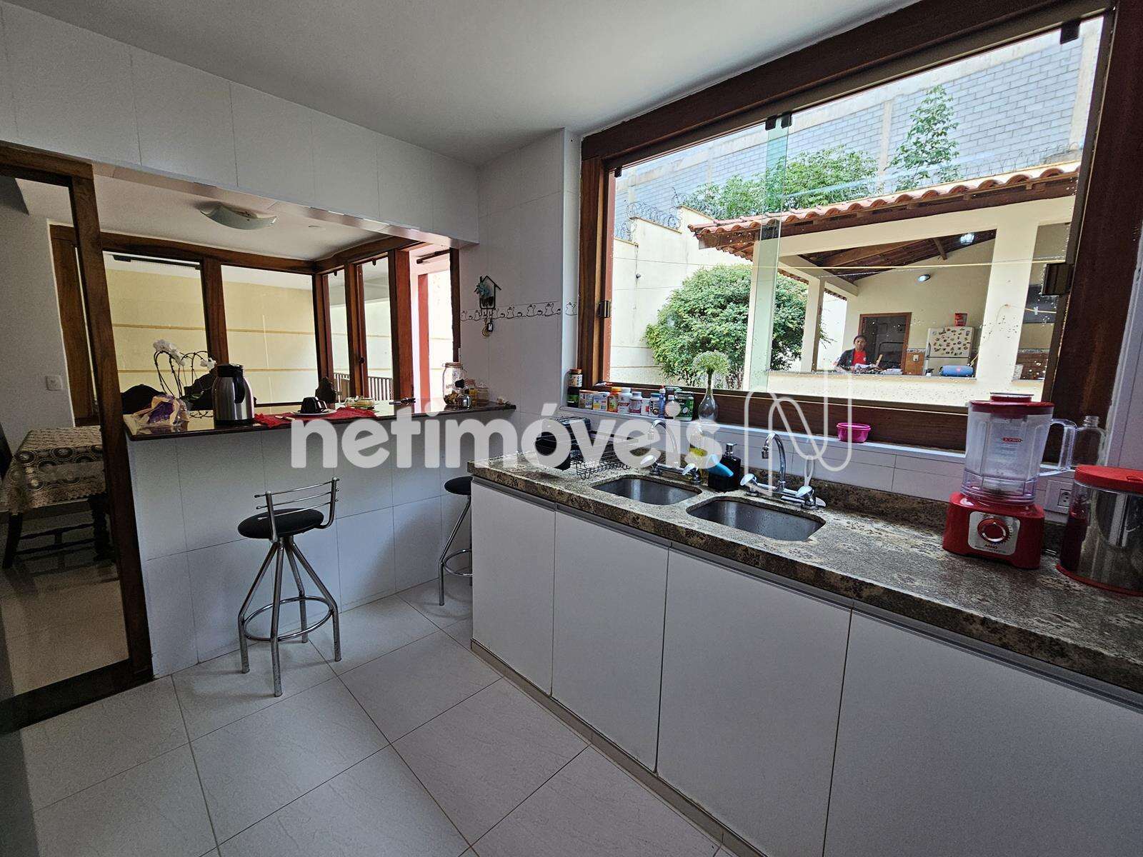 - Cozinha americana com bancada de granito, armários, coifa, piso em cerâmica