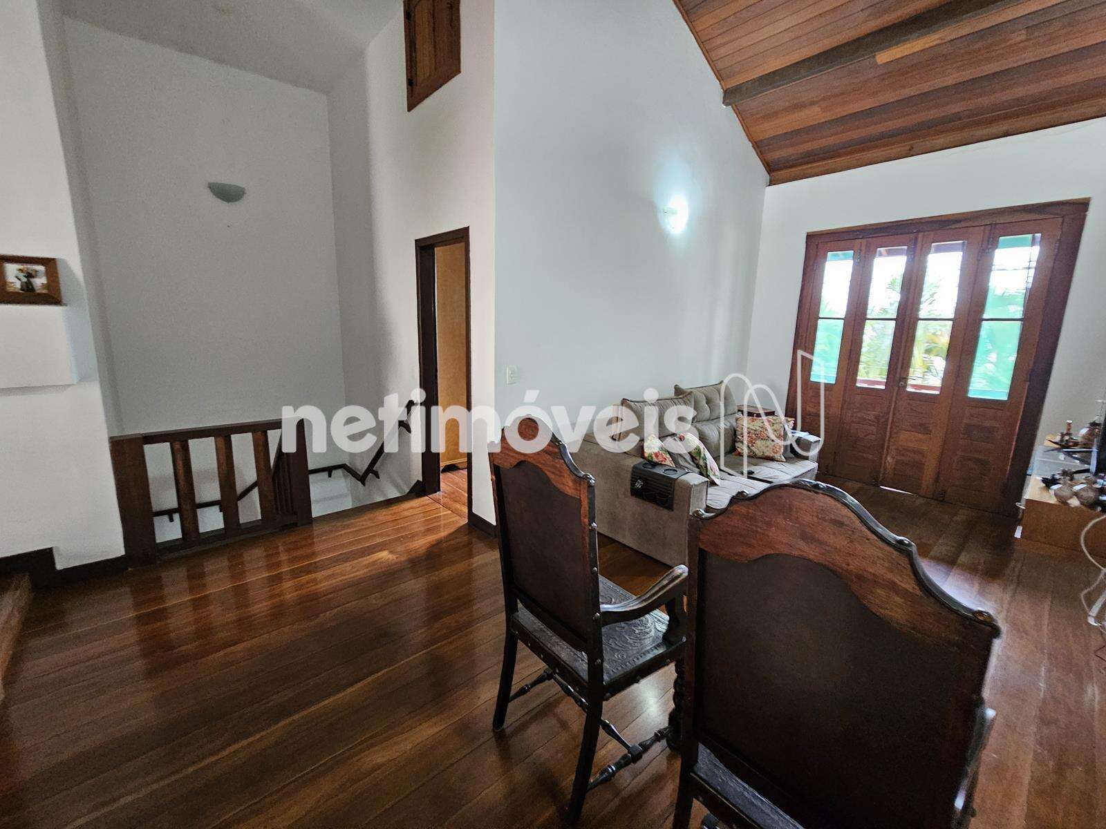- Sala com piso de madeira, varanda