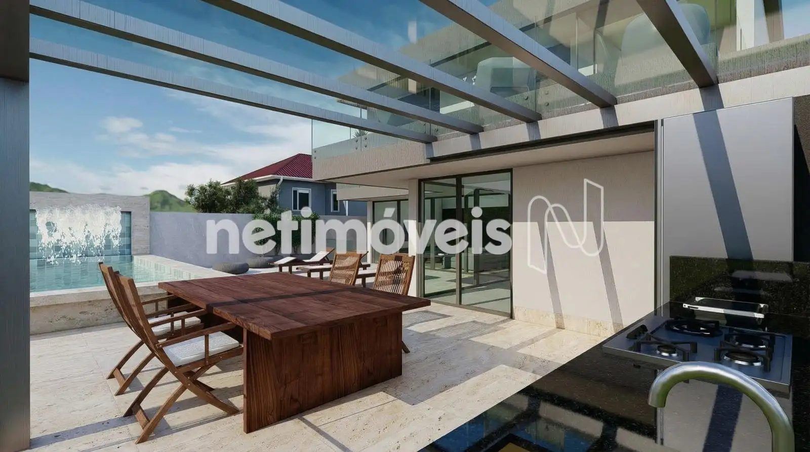 Cozinha com bancadas em granito e Gourmet moderno todo estruturado em granito e pérgola.