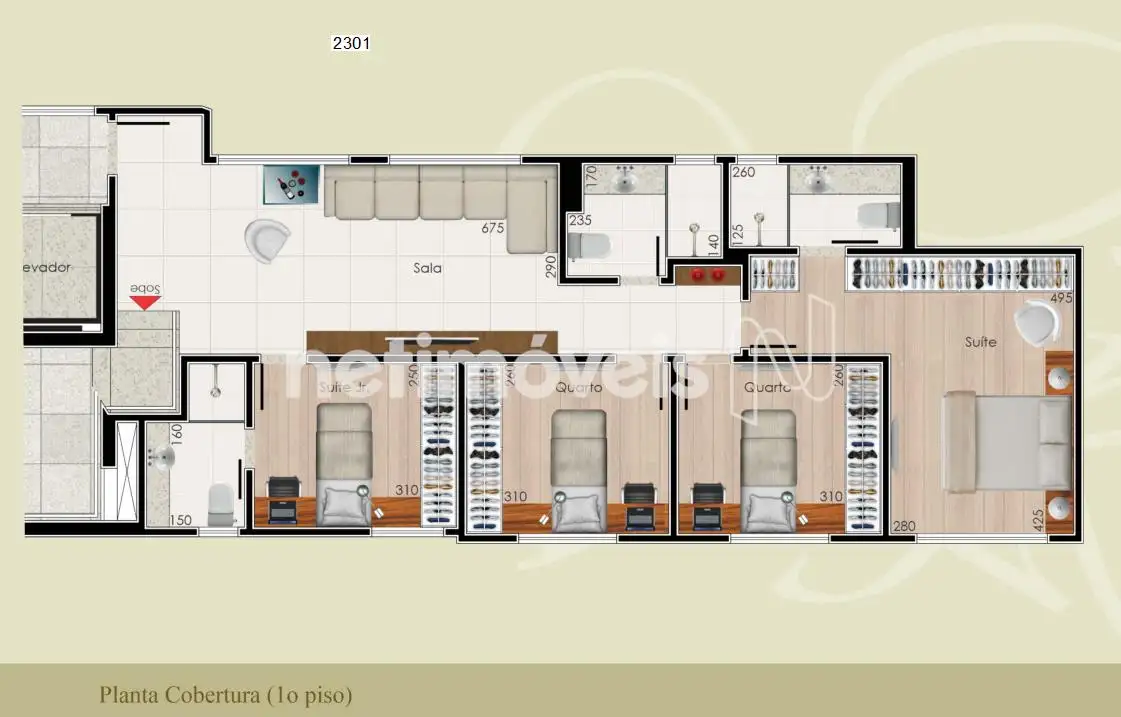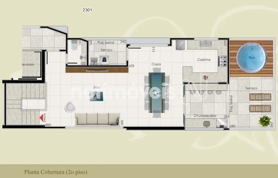 Cobertura: 1º piso: Ampla sala, 04 quartos, sendo 01 suíte, escritório, banho social e cozinha.