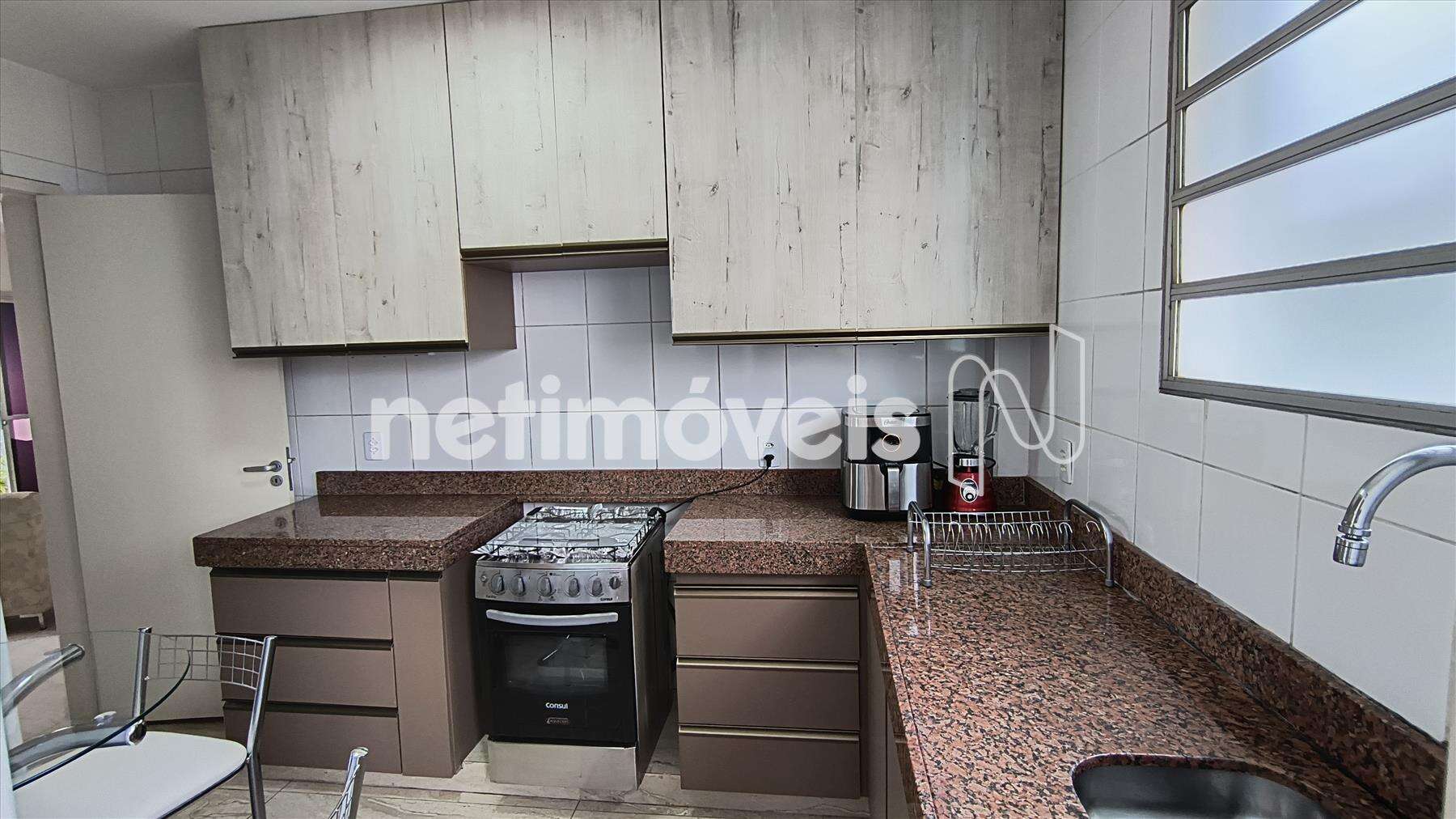 Cozinha com armários planejados, piso porcelanato.