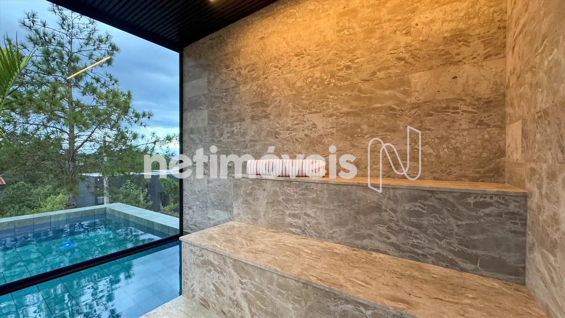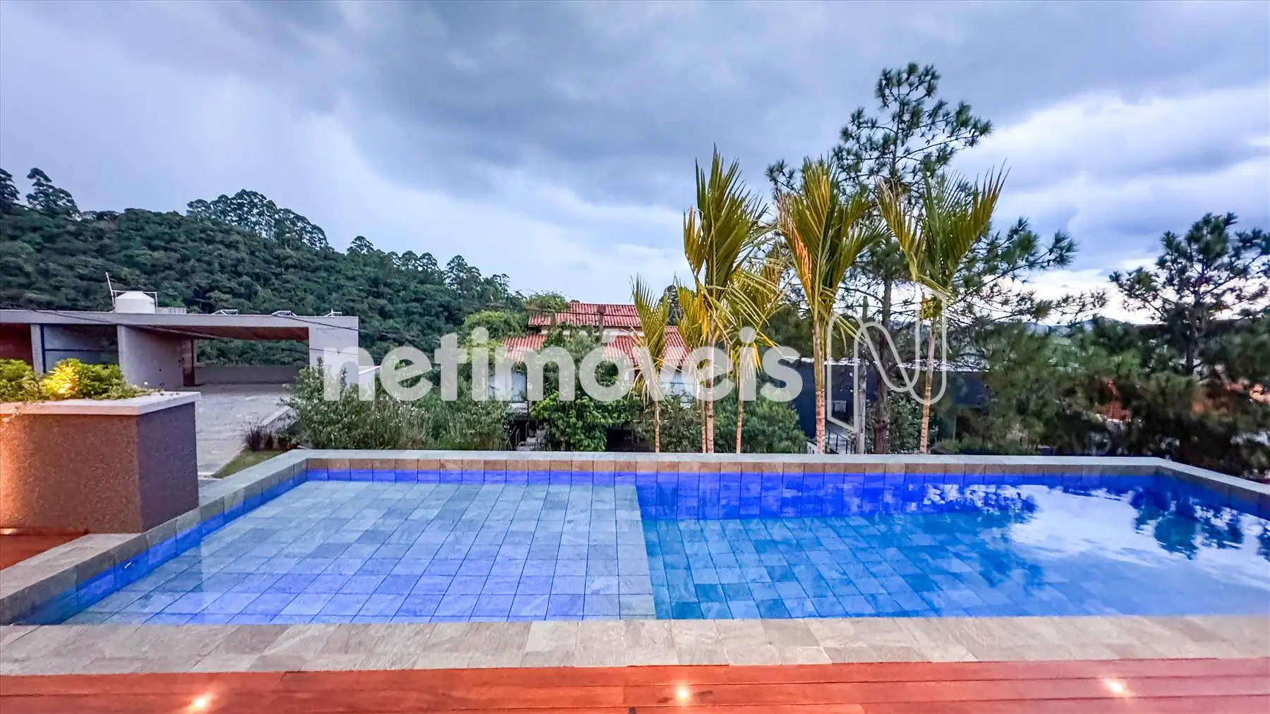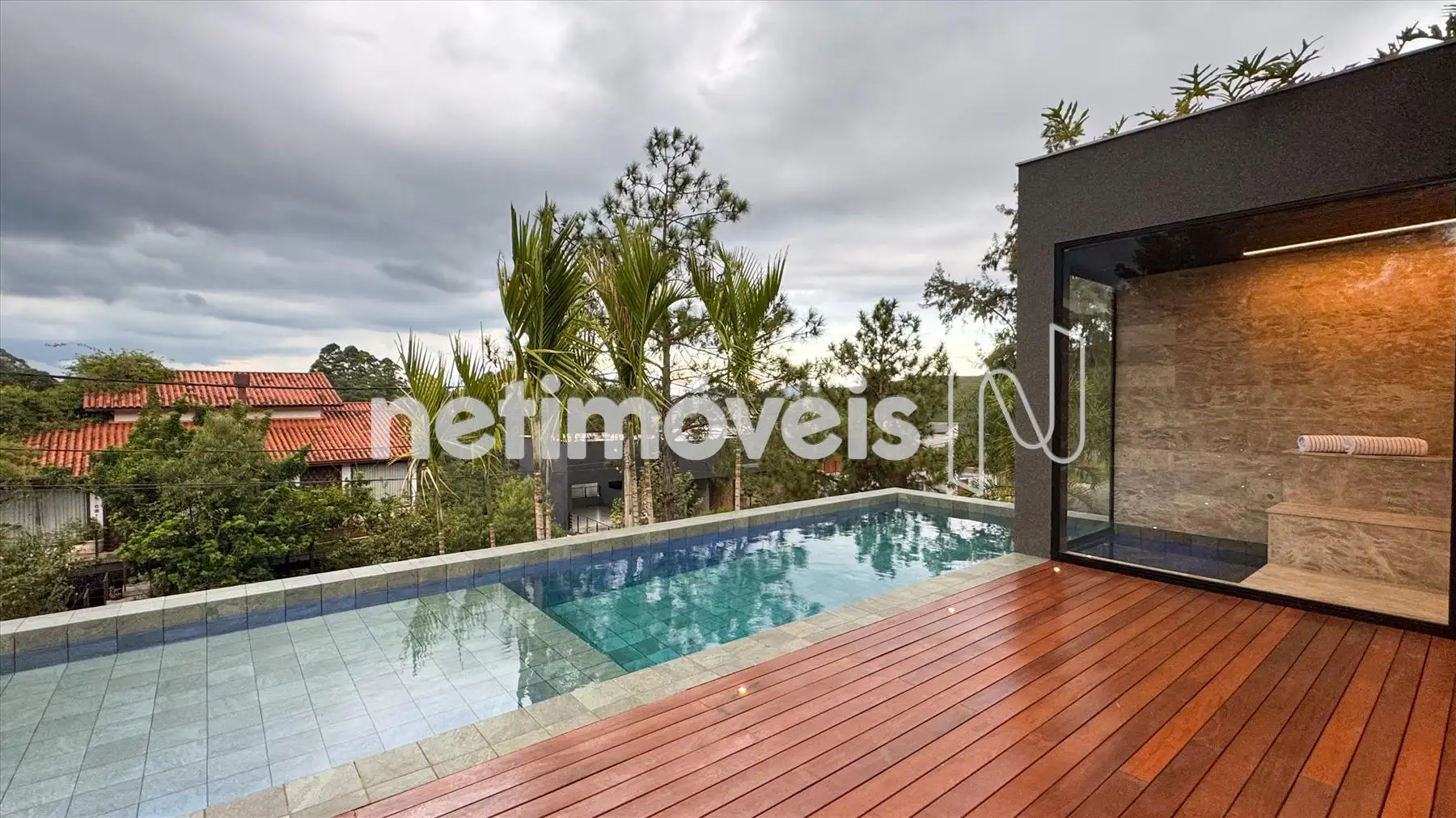 Deck em madeira, piscina aquecida e sauna elétrica com vista para mata e montanhas;