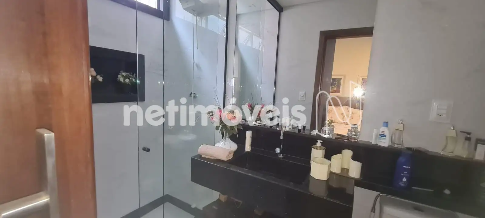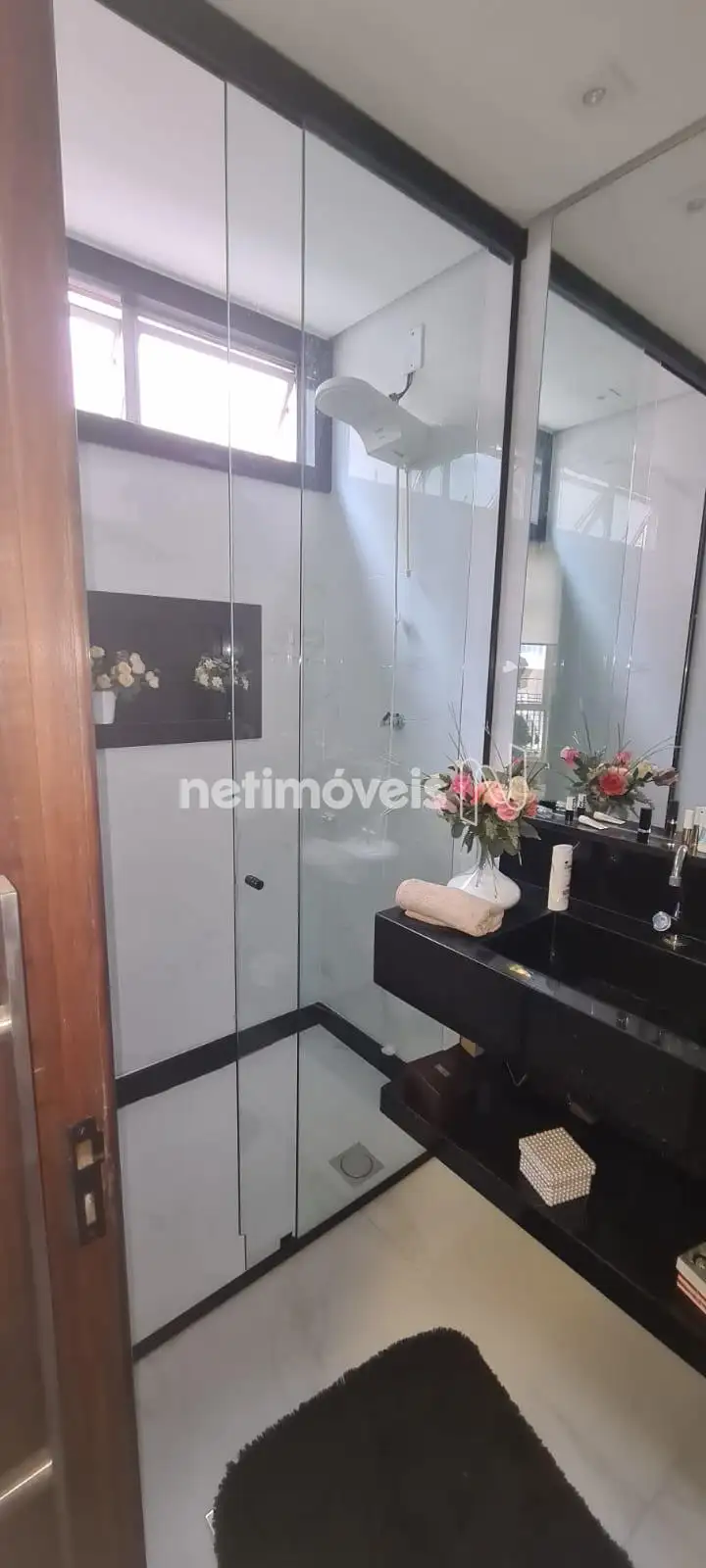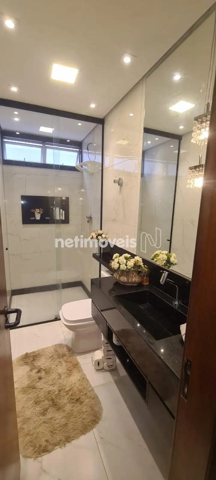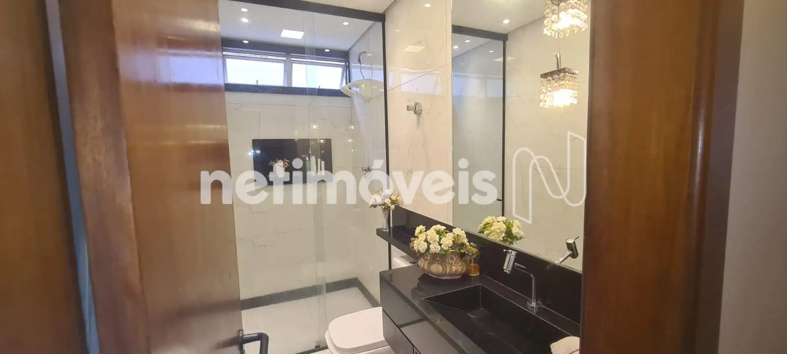 3 banheiros: 1 social, 1 suíte e 1 de serviço (DCE). Box em vidro temperado e armários.