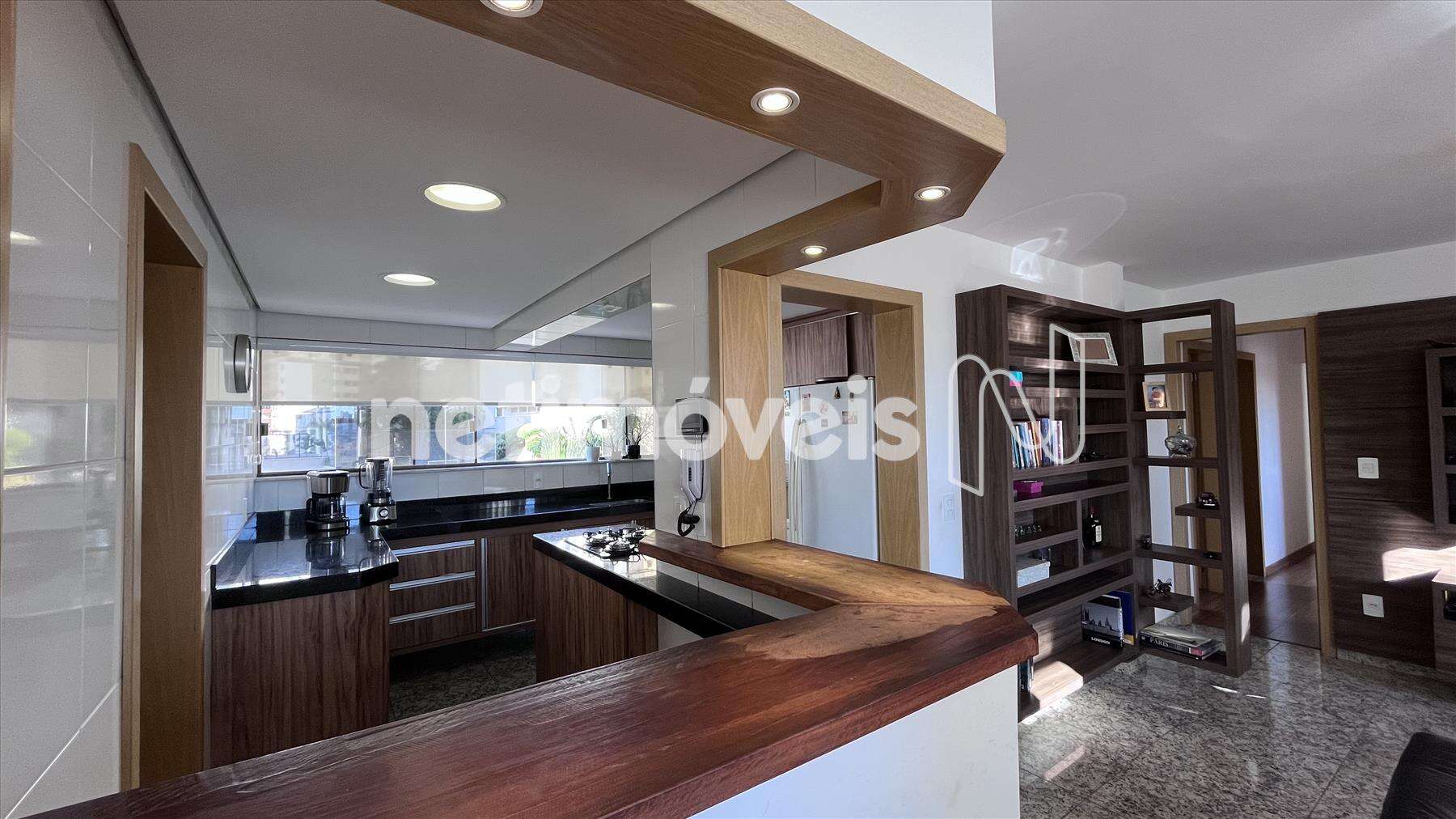 Cozinha tipo americana, aberta para sala de jantar com detalhe em madeira e iluminação planejada, cooktop e forno elétrico na bancada de granito preto e armários planejados.