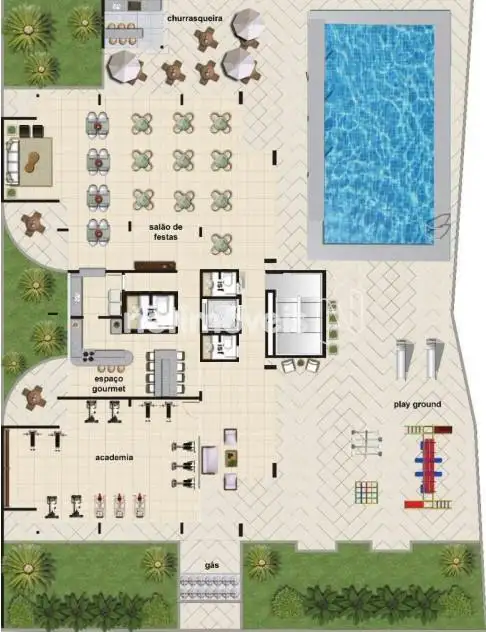 Lazer com salão de festas, espaço gourmet interno, piscina climatizada, área gourmet aberta com churrasqueira, academia e playground.