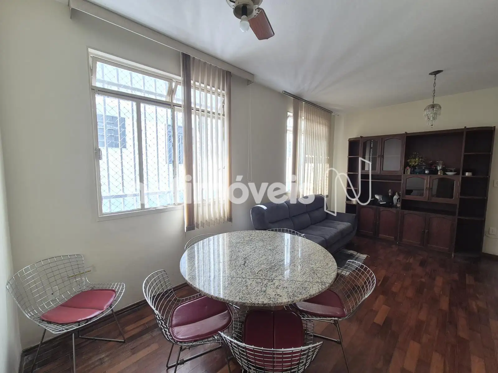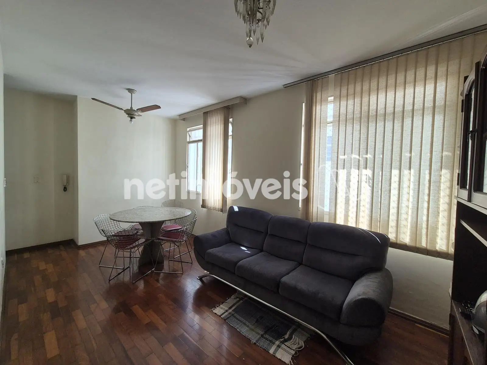 - Sala ampla para dois ambientes, cortinas, iluminação, ventilador, piso de taco