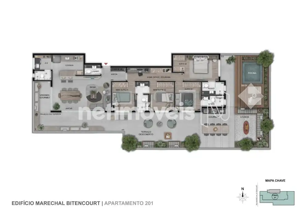 Com um design diferenciado, explorando elementos naturais e atemporais, o Reserva Gutierrez possui um incrível paisagismo que remete a verdadeiras casas suspensas.