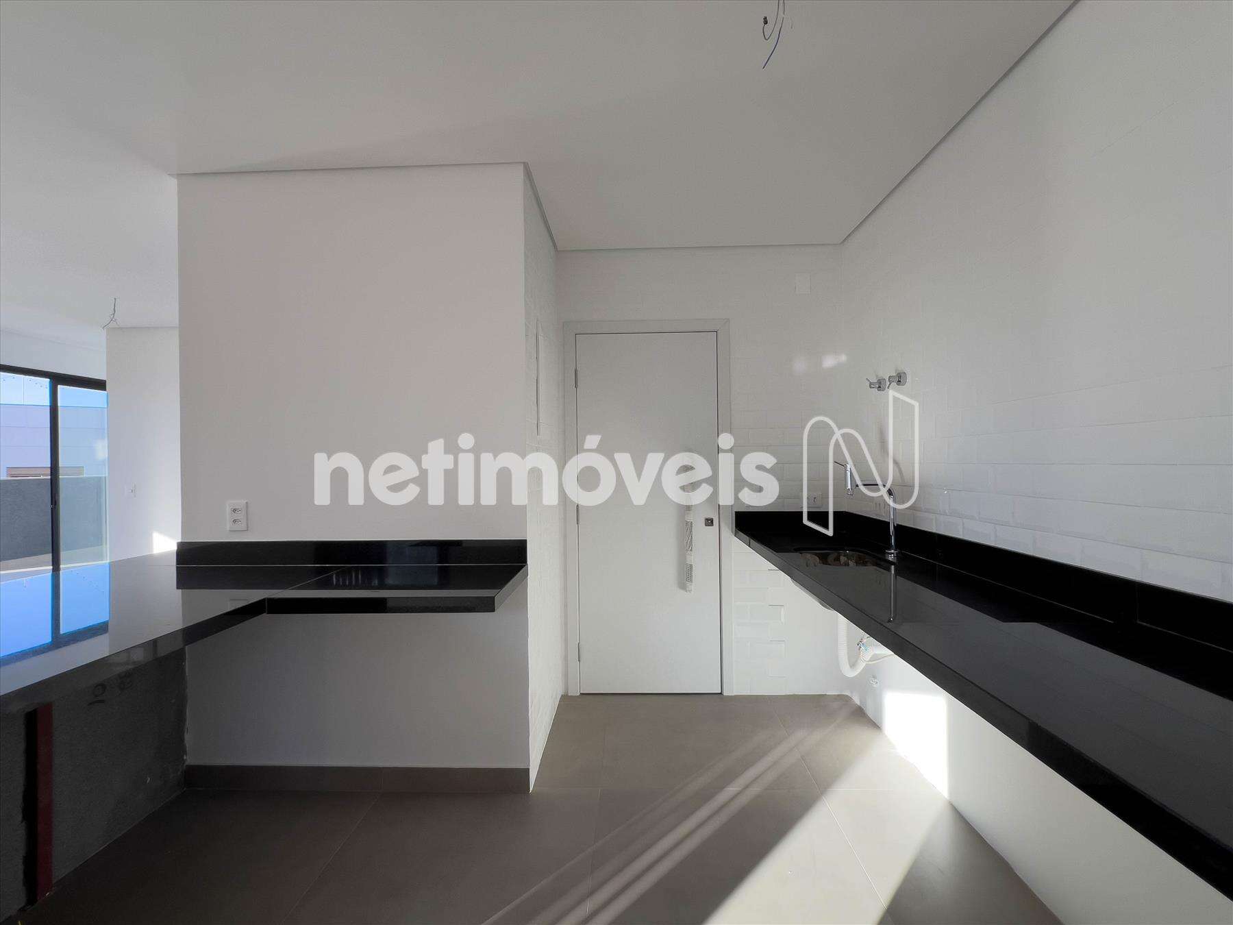 - Cozinha com pisos e paredes revestidas em porcelanato e bancadas também em granito.