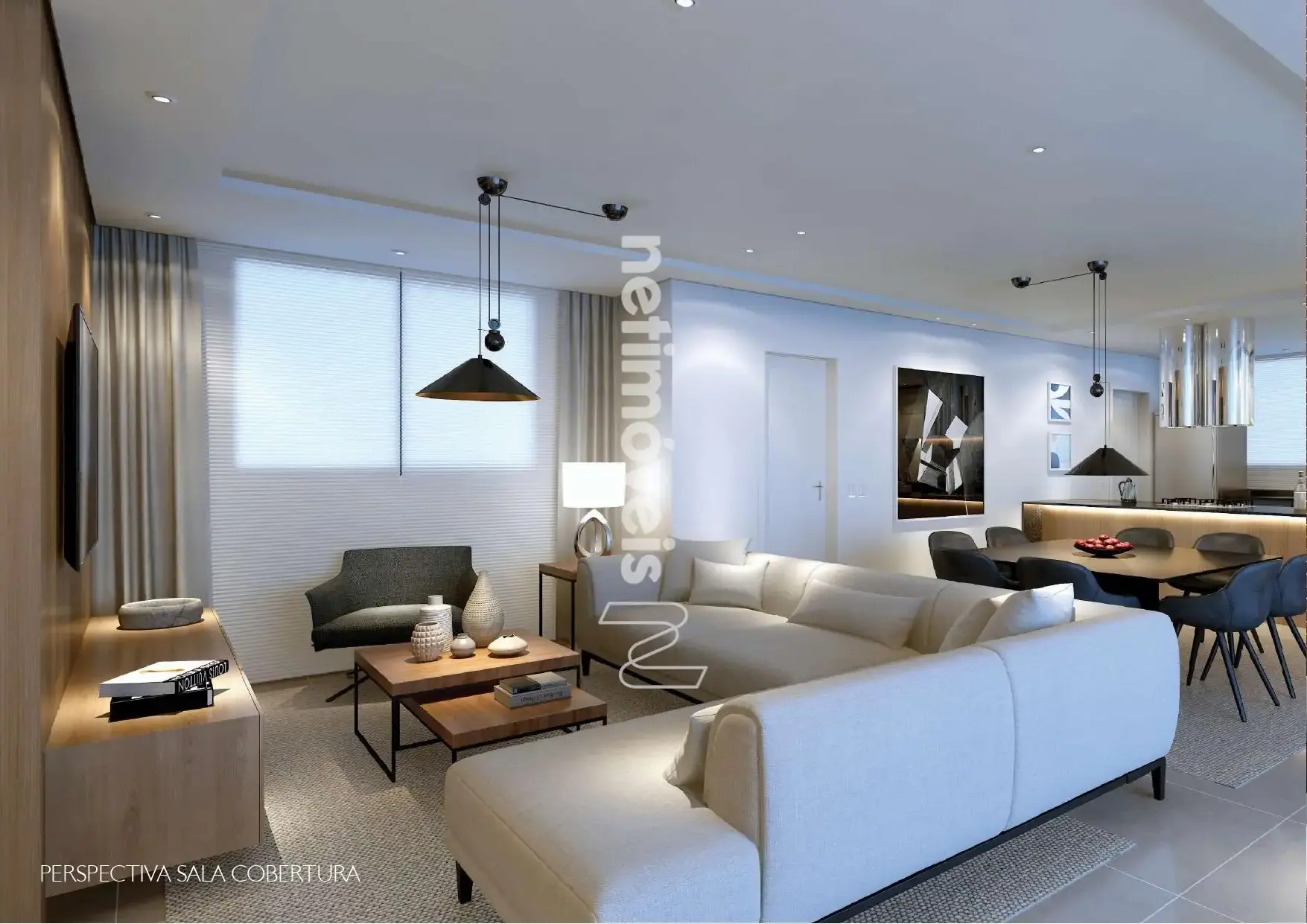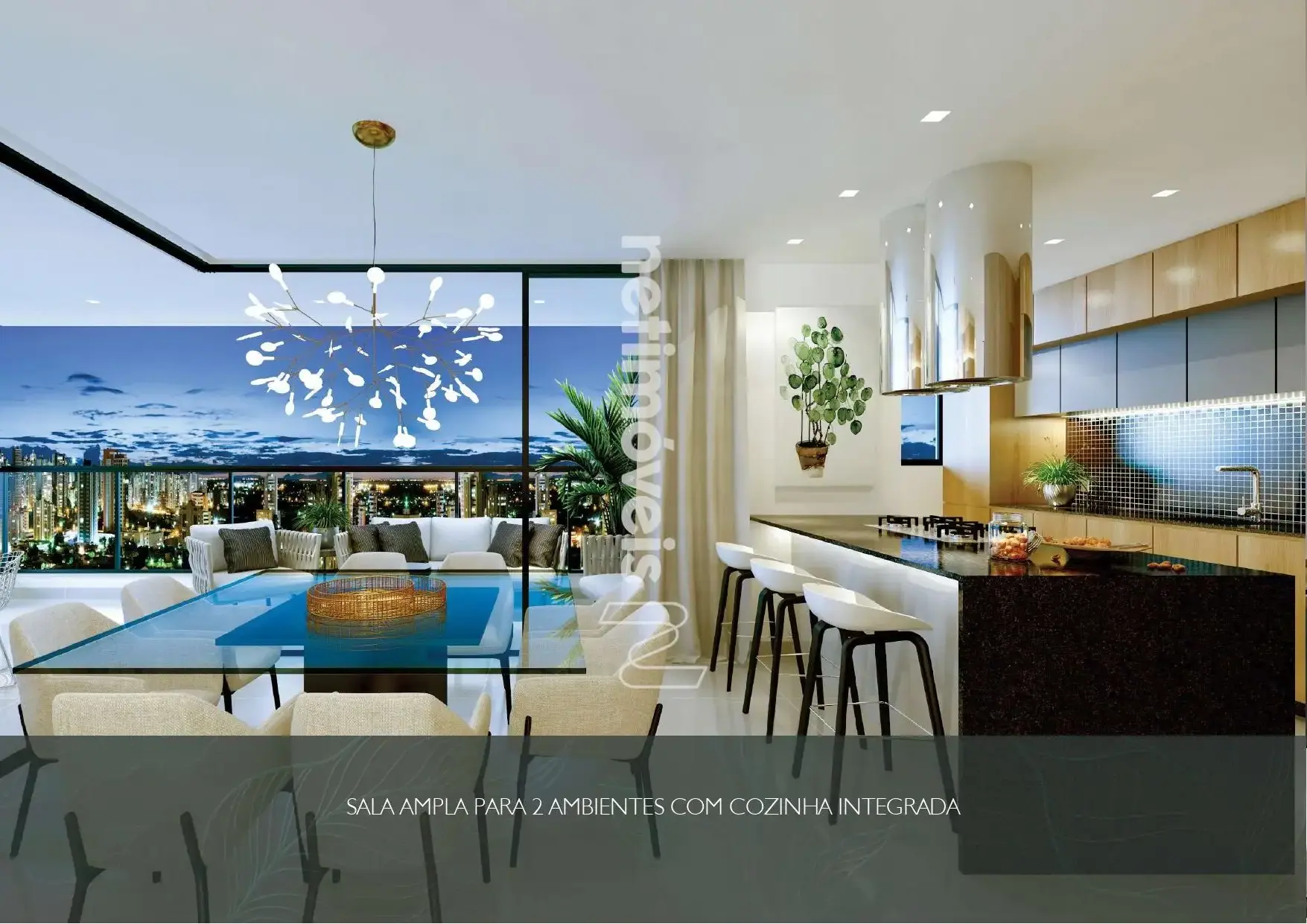 Ampla sala integrada com varanda e cozinha. O imóvel também conta com lavabo.