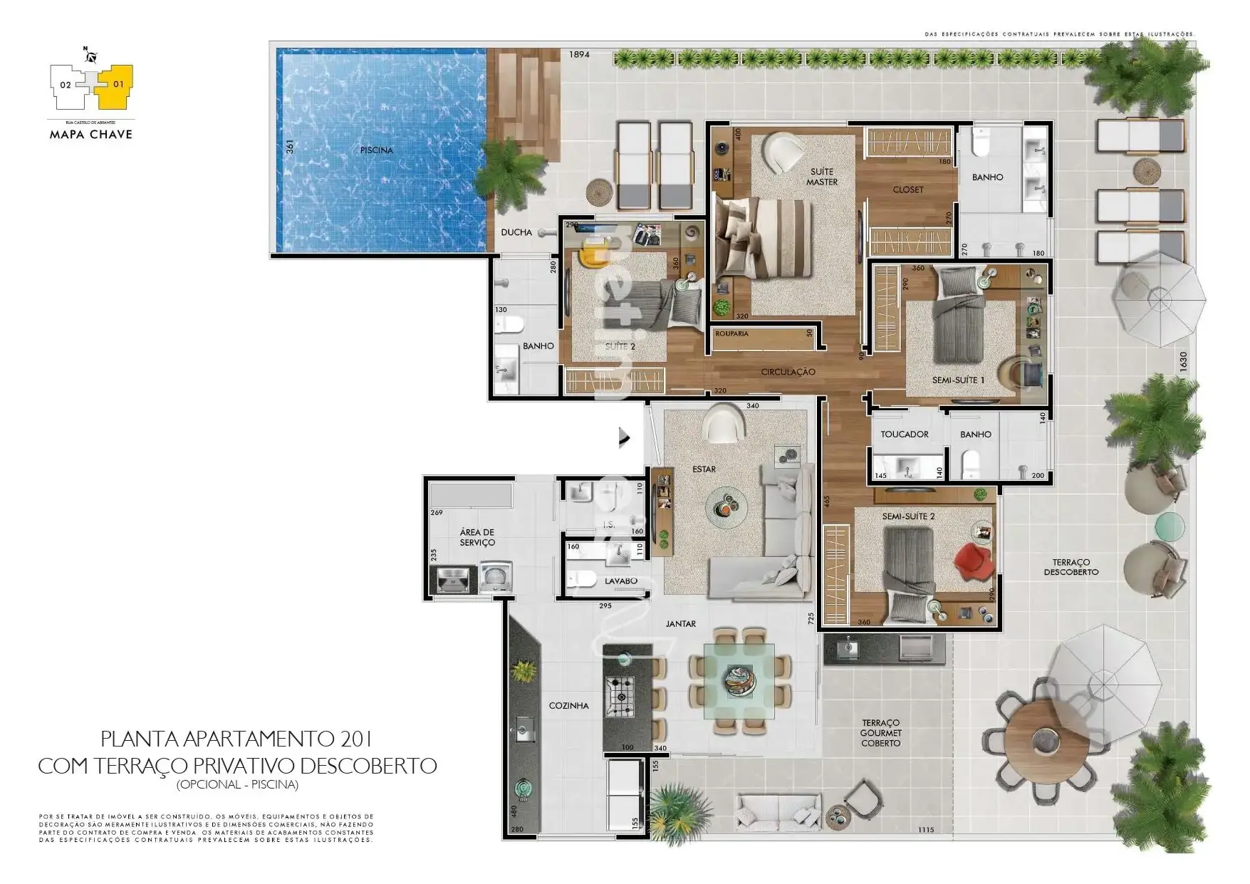 Lazer completo com salão de festas, cozinha gourmet, espaço kids, espaço fitness, piscina com raia, piscina infantil aquecida, sauna e área de jogos.