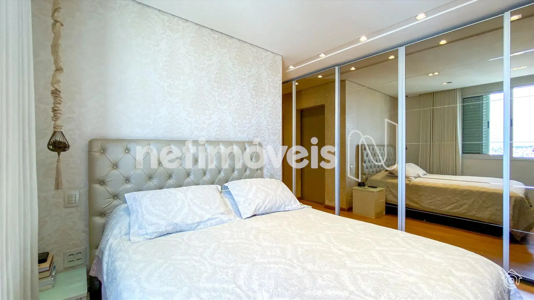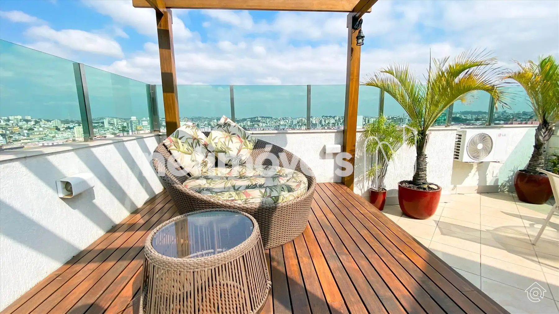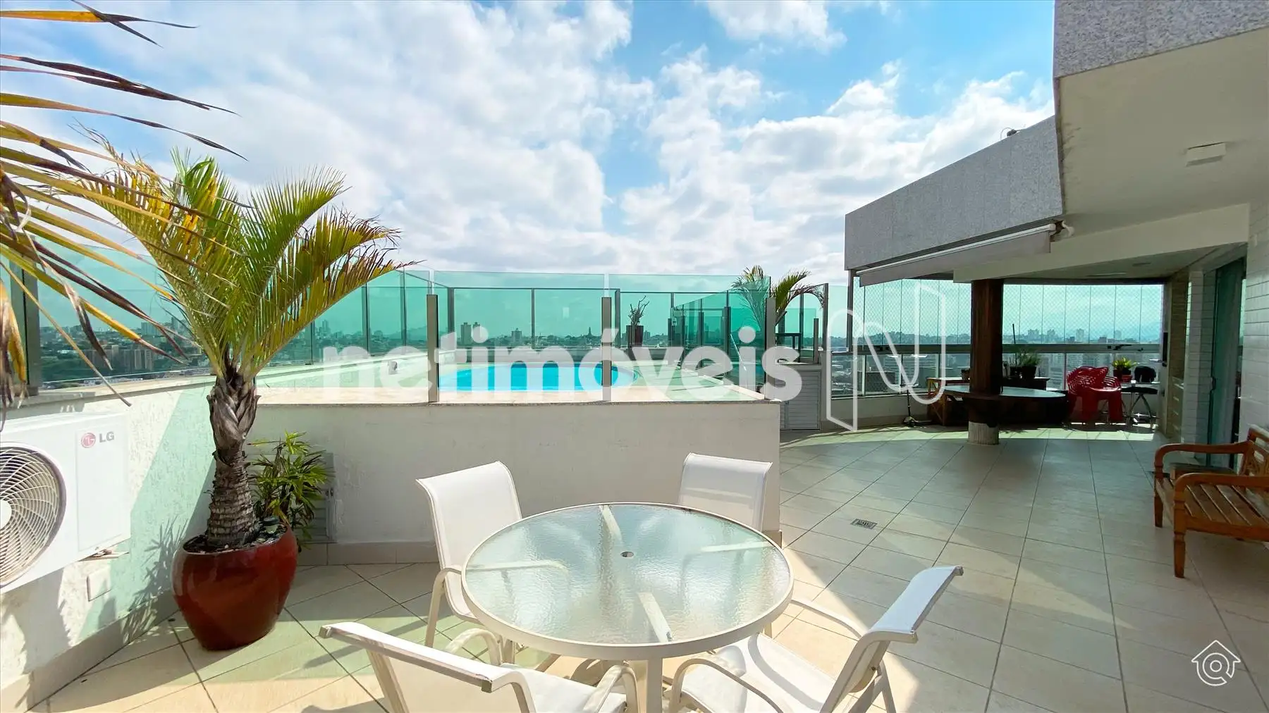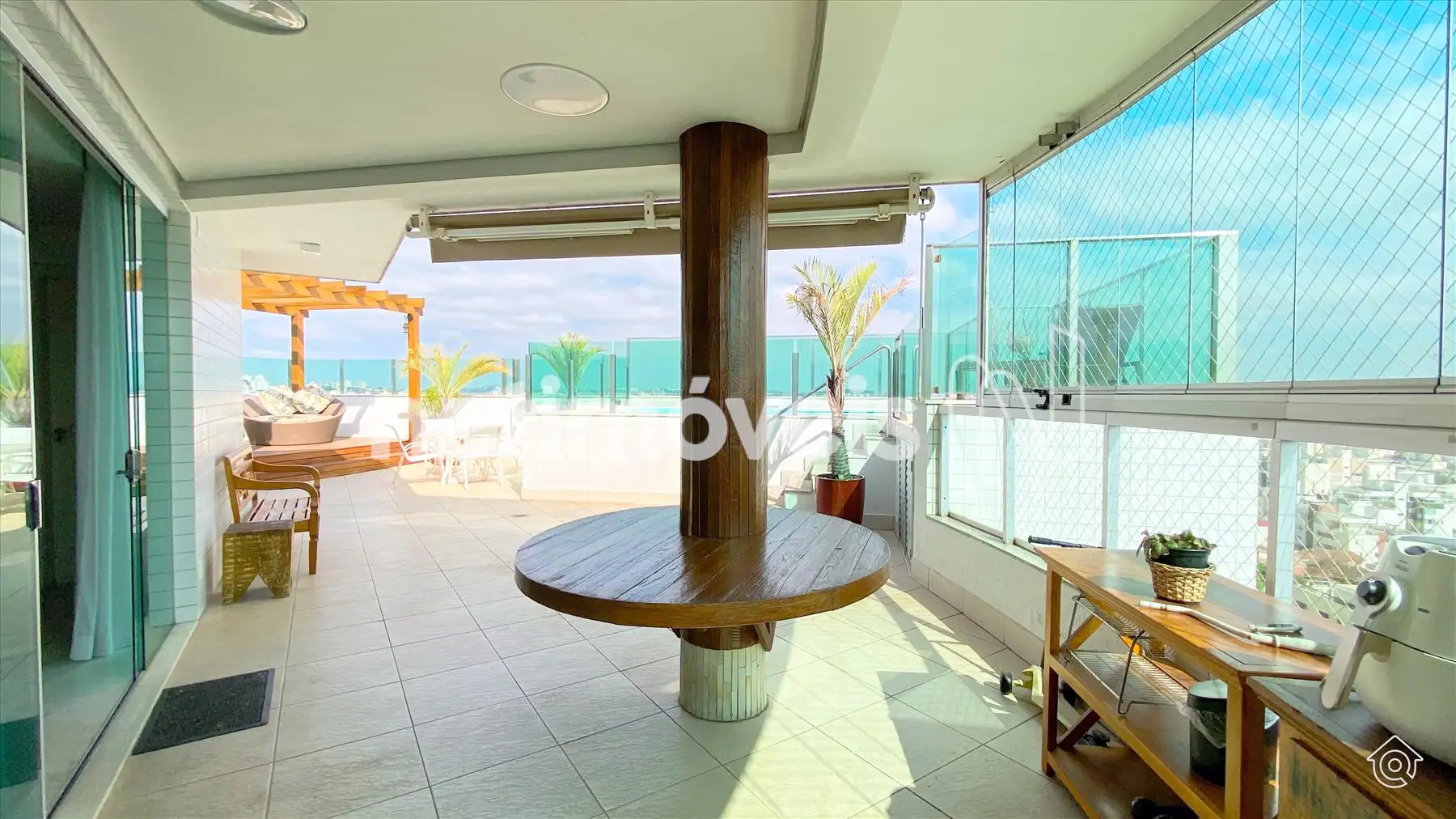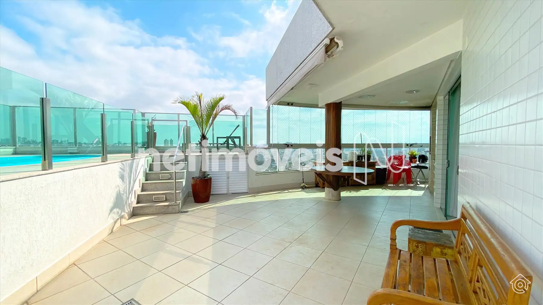 A cobertura é bem iluminada e arejada, com aquecimento solar. No 1º pavimento, possui uma ampla sala de estar climatizada, lavabo, varanda e 4 quartos, sendo 1 suíte com ar-condicionado e armários embutidos. Um dos quartos é adaptado como closet. Os banheiros têm armários e box de vidro temperado. A cozinha é equipada com bancadas em granito e armários, além de uma área de serviço com banheiro e quarto de empregada.