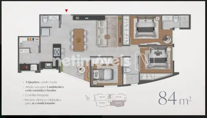 -03 Quartos sendo um com suíte, sala ampla paa dois ambientes, cozinha conceito aberto, área de serviço separada, sala ampla para dois ambientes com varanda, banho social.