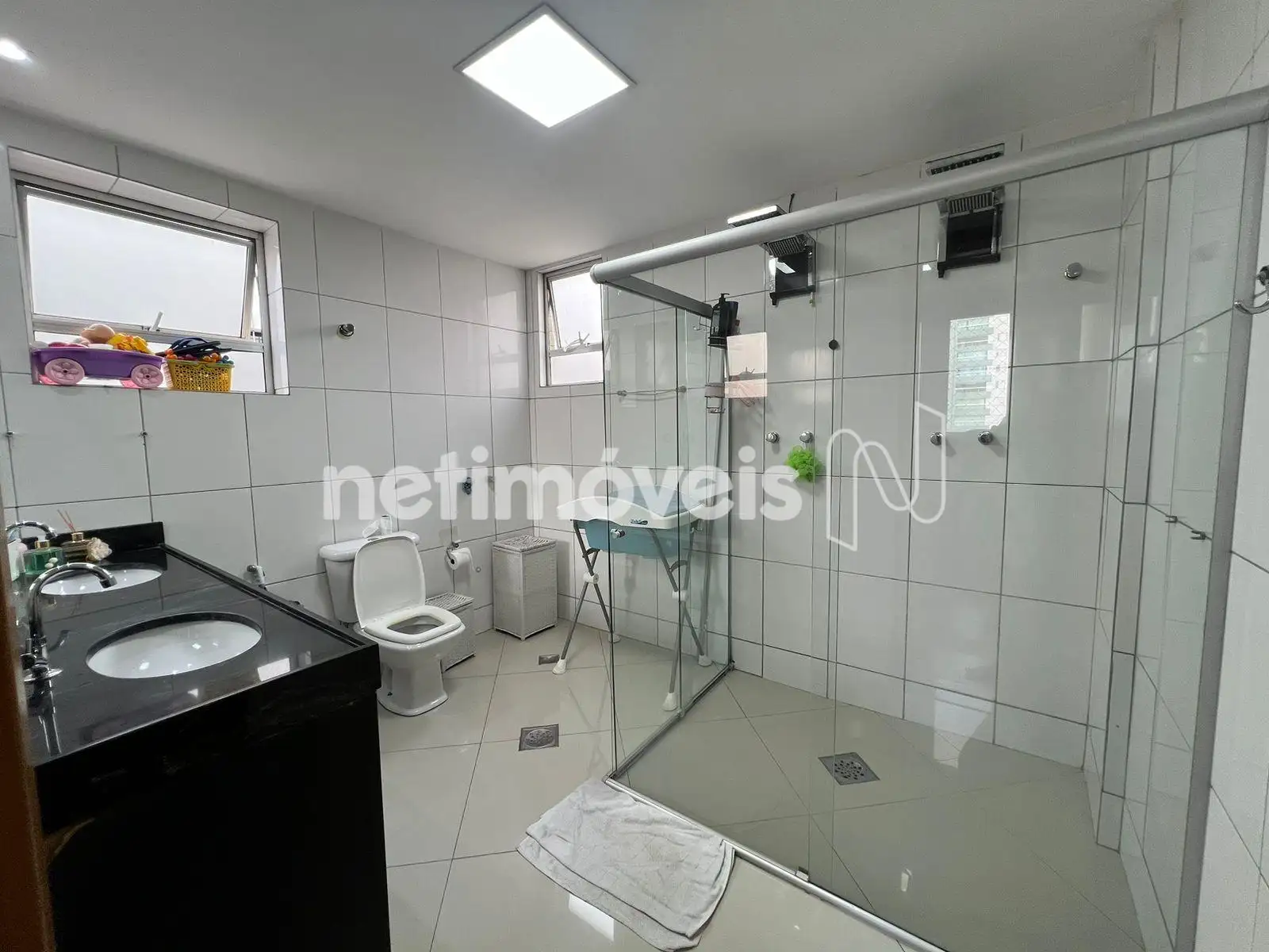 - 01 Banho social, com box e bancadas e armários;