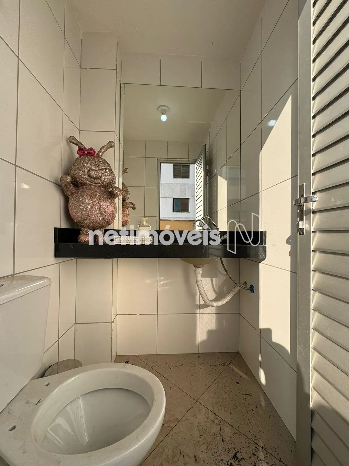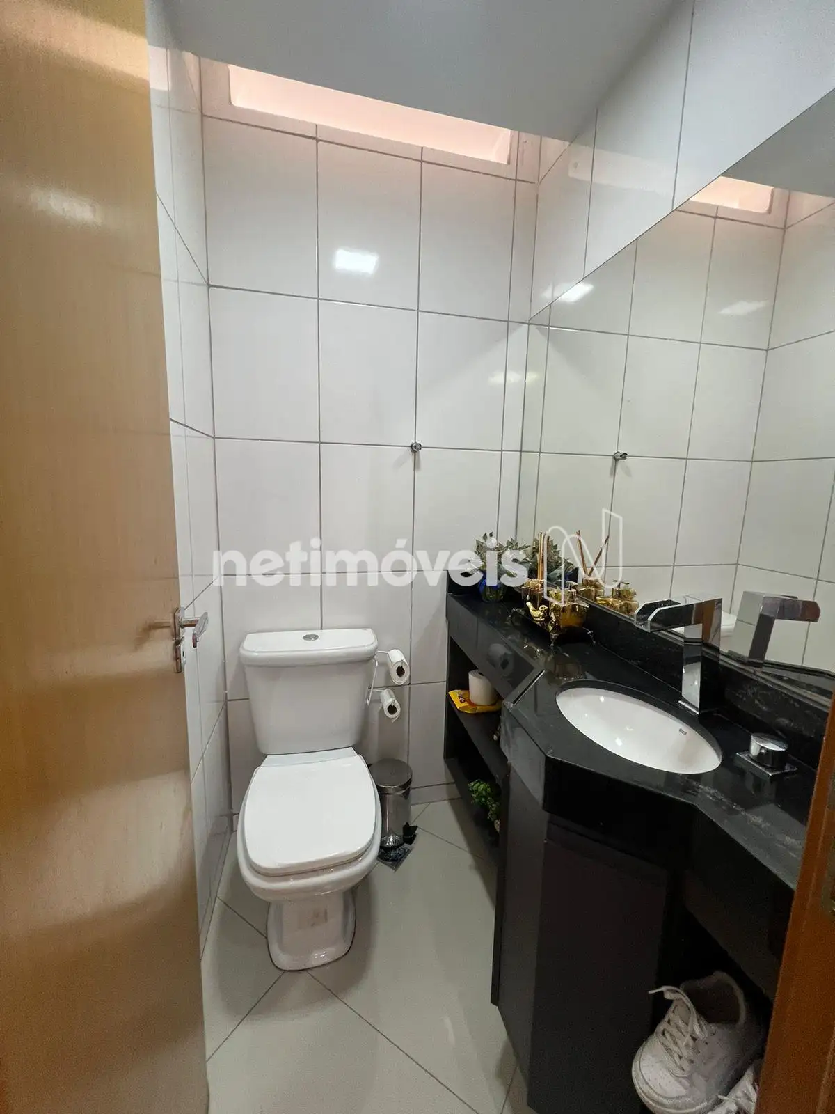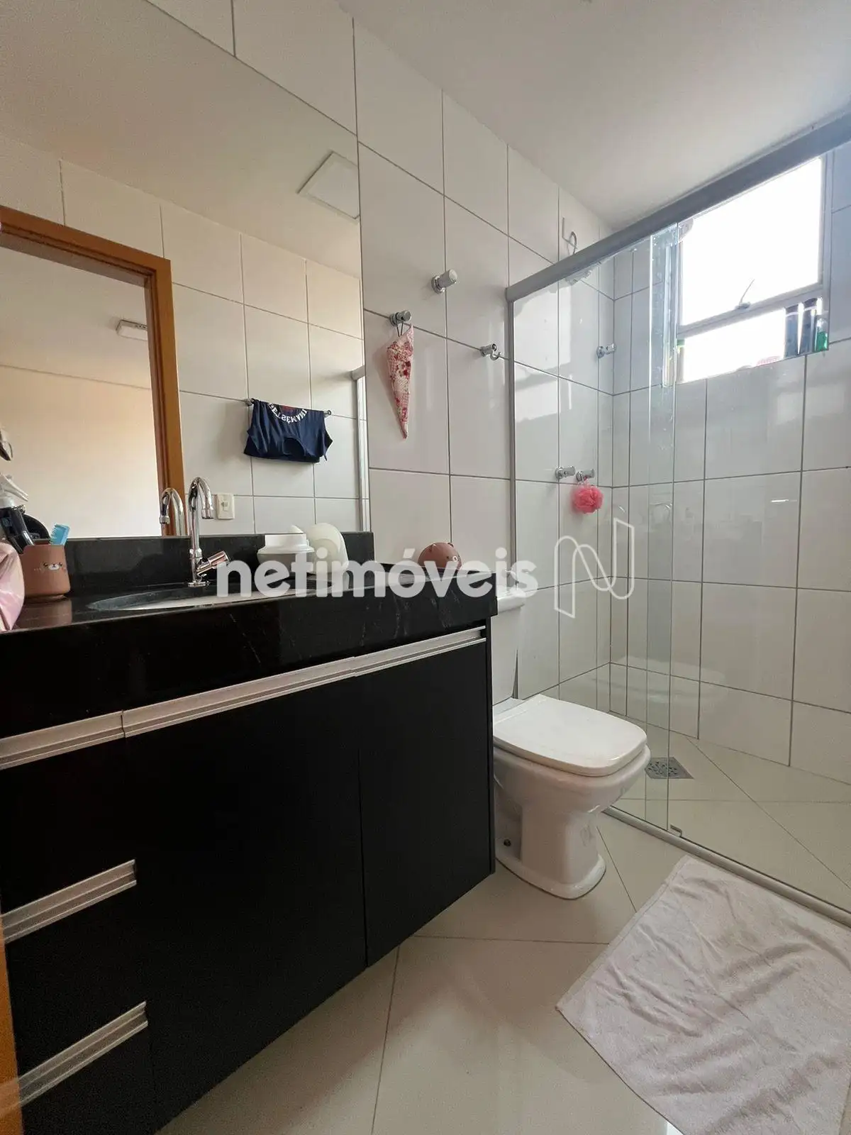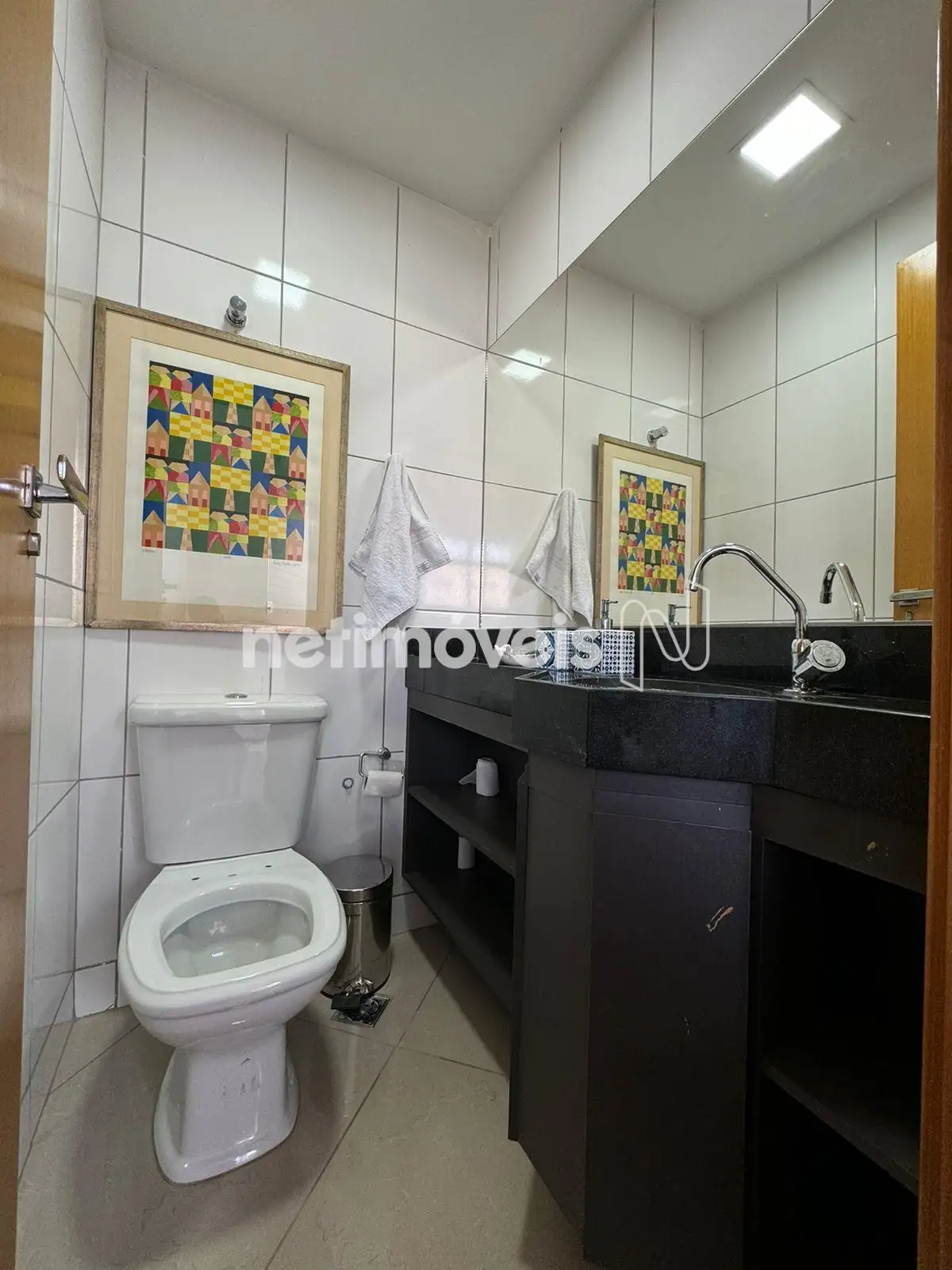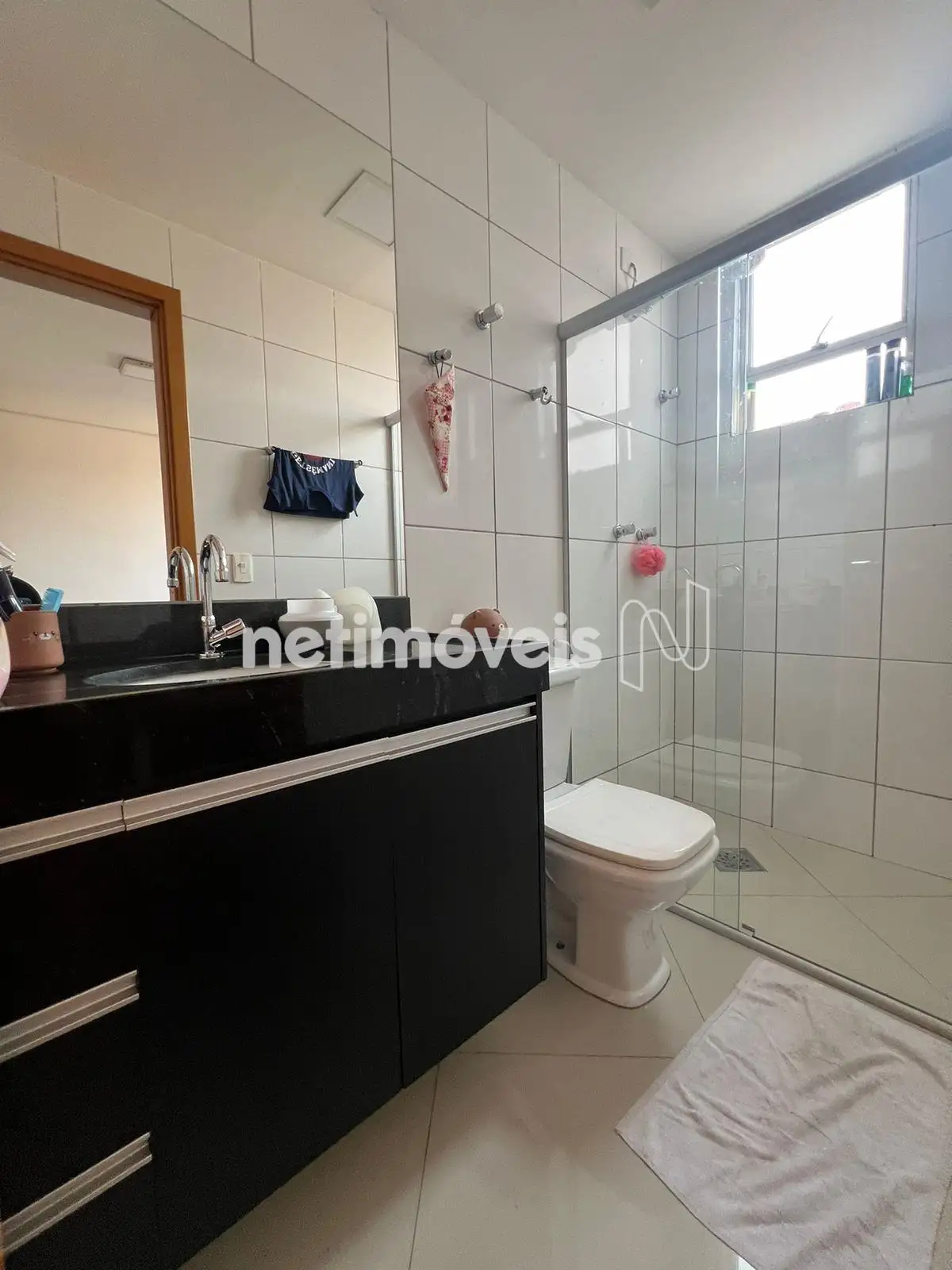 - Banho social com bancada em granito, armário e box;