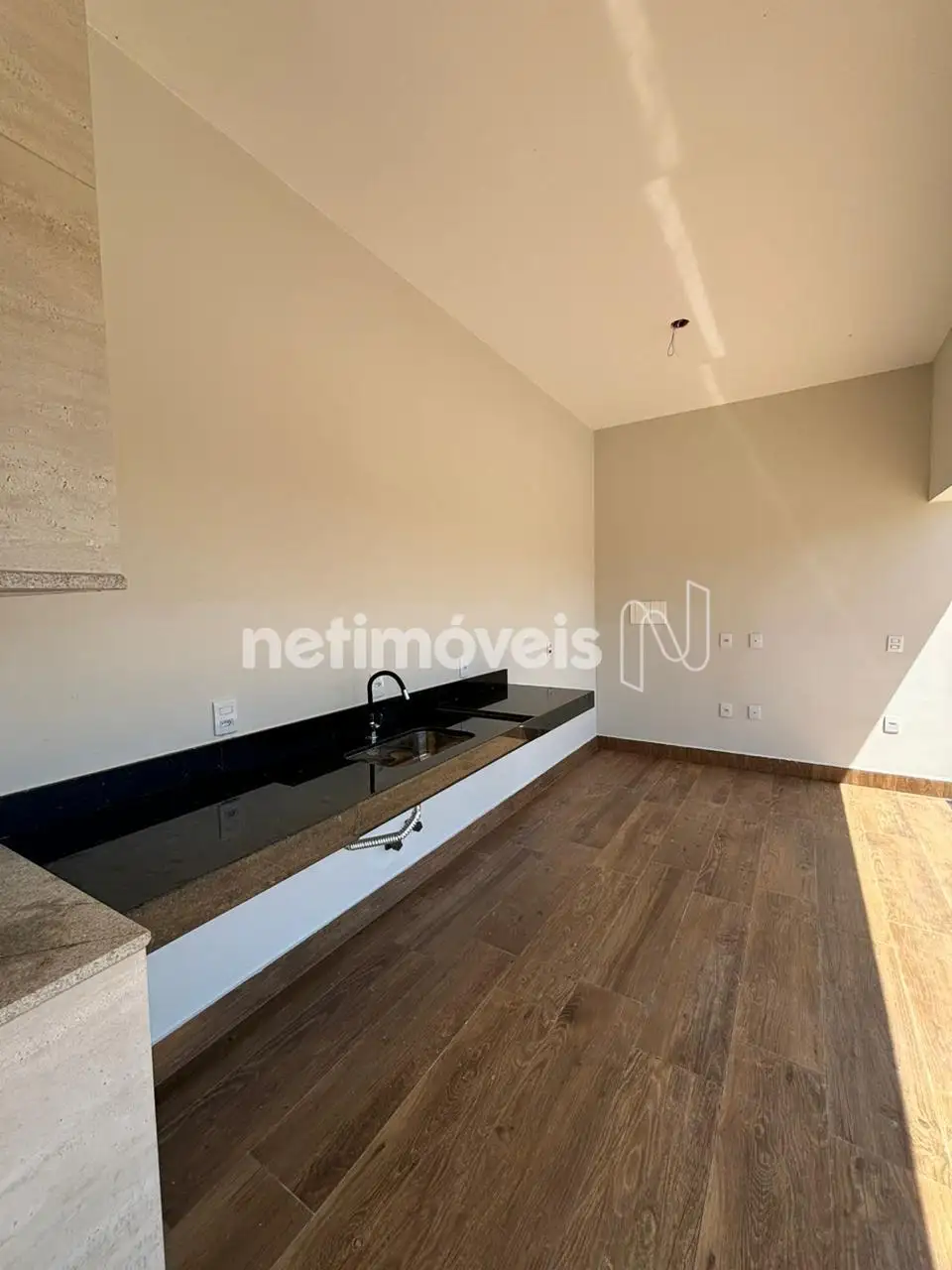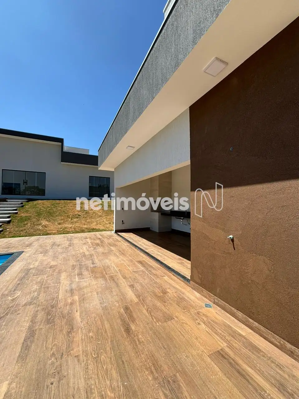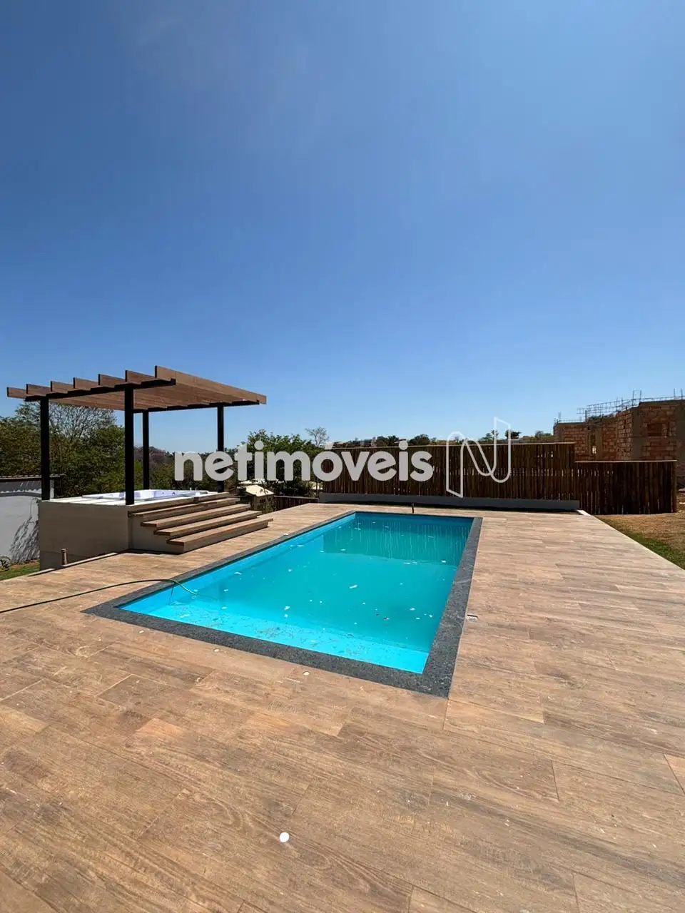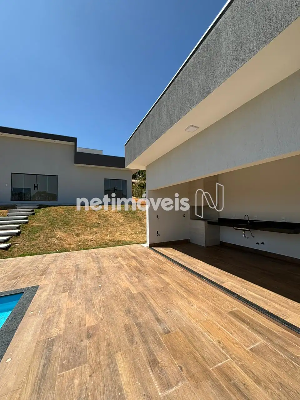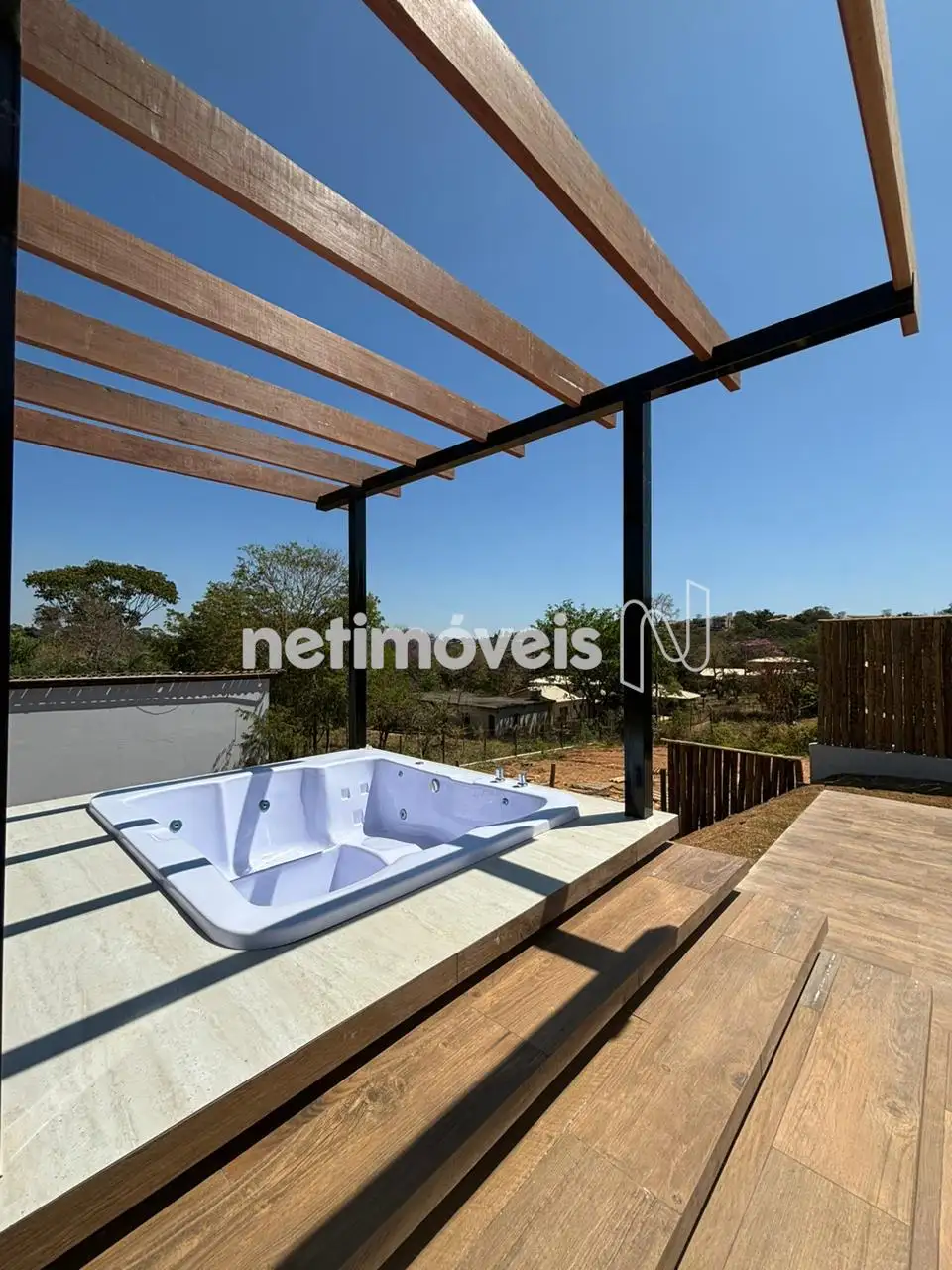 A cozinha é um convite à praticidade, equipada com cooktop, tomadas de click e bancadas em granito Verde Ubatuba, unindo beleza e Na área externa, a casa conta com uma relaxante banheira de hidromassagem sob um elegante pergolado em ferro e madeira, além de uma piscina de 7,30m x 3,40m com bicos de h