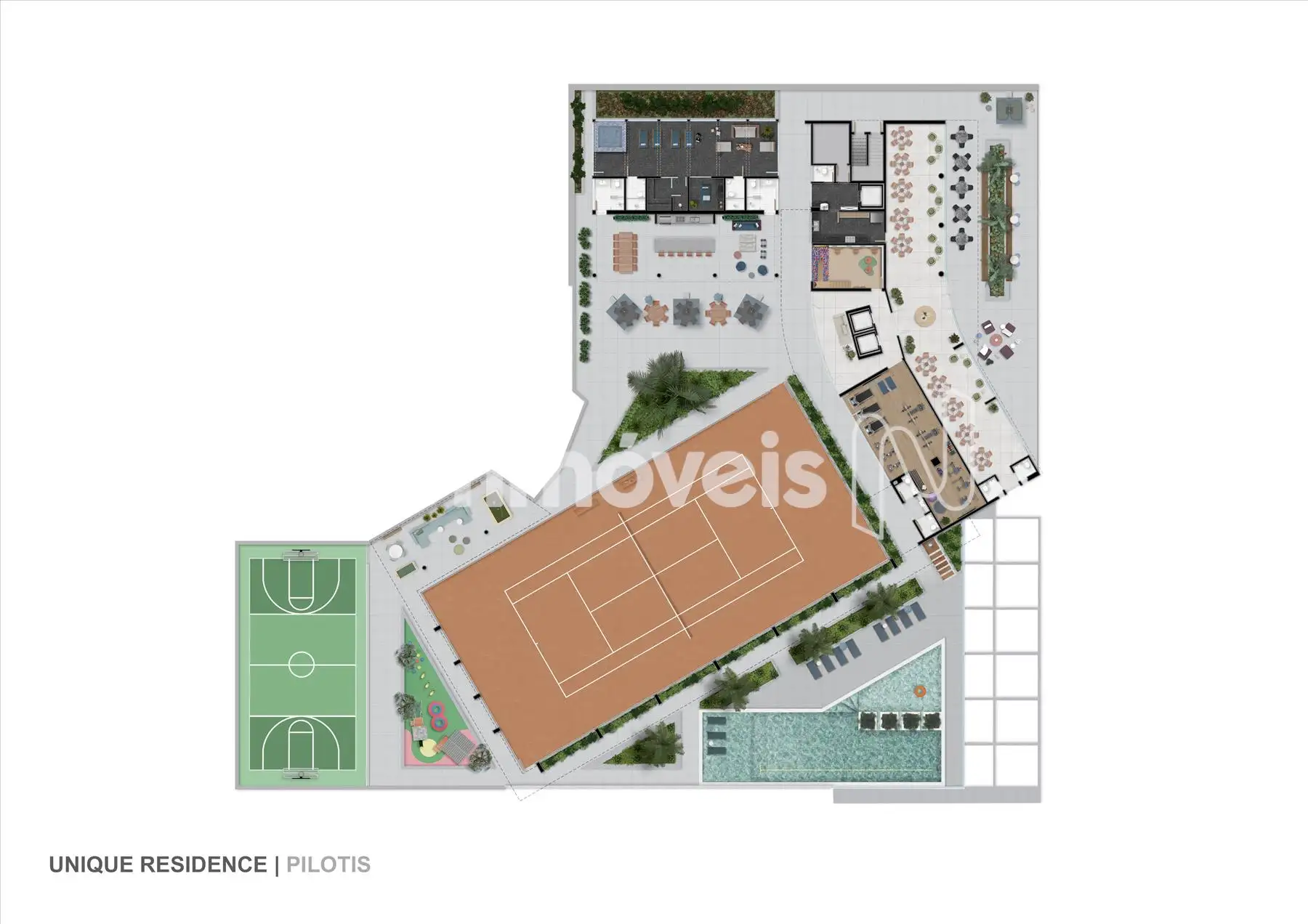 - Piscina com raia, prainha e deck, piscina infantil, quadra de tênia em saibro, salão de festas, espaço fitness, spa, sauna, sala de massagem, espaço kids, playground, quadra esportiva, espaço de jogos.