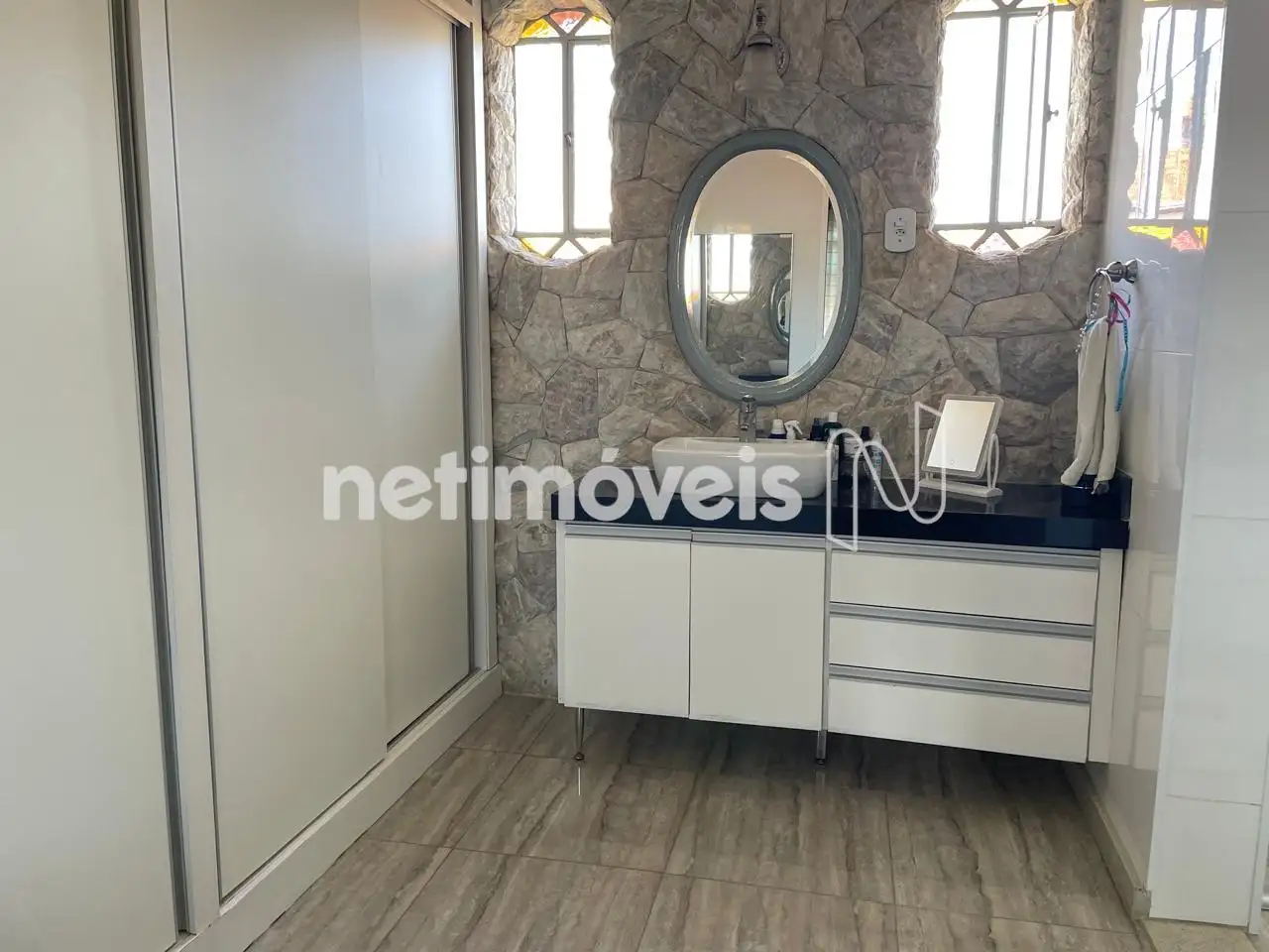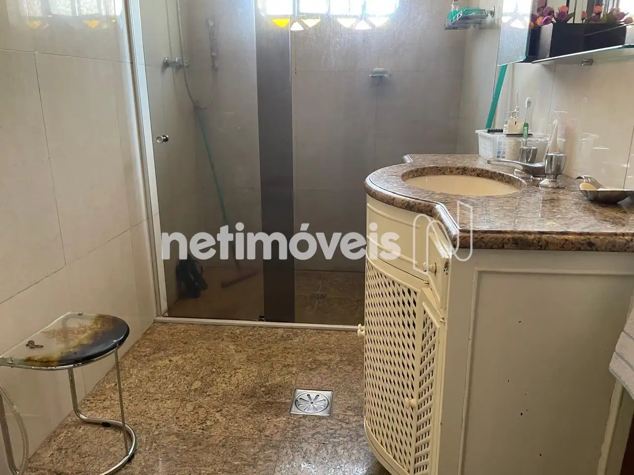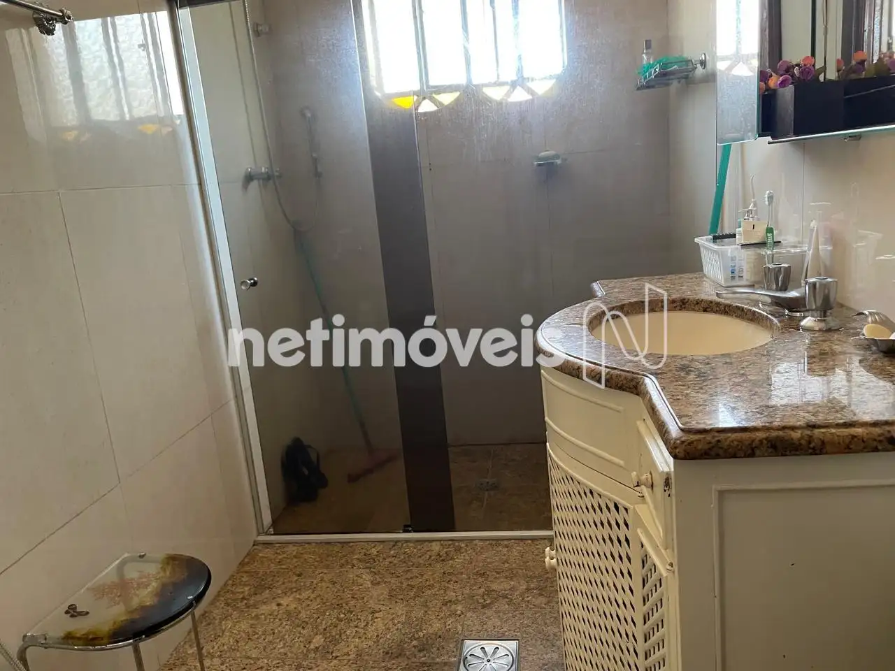 - Banho suíte com piso em porcelanato, pia com bancada em granito, com armário e box em vidro temperado;