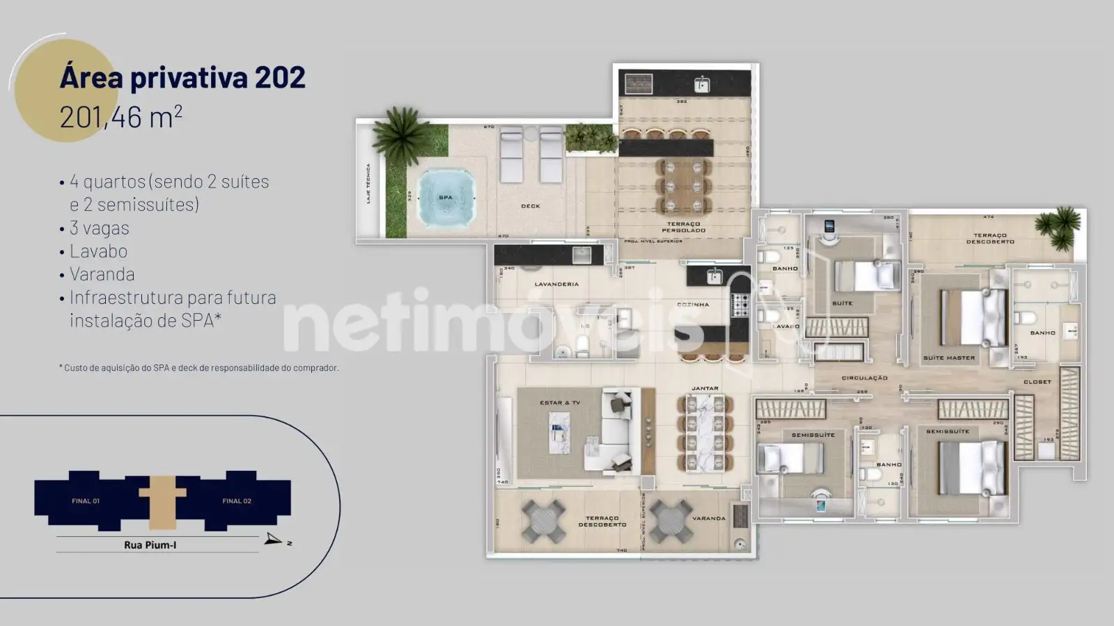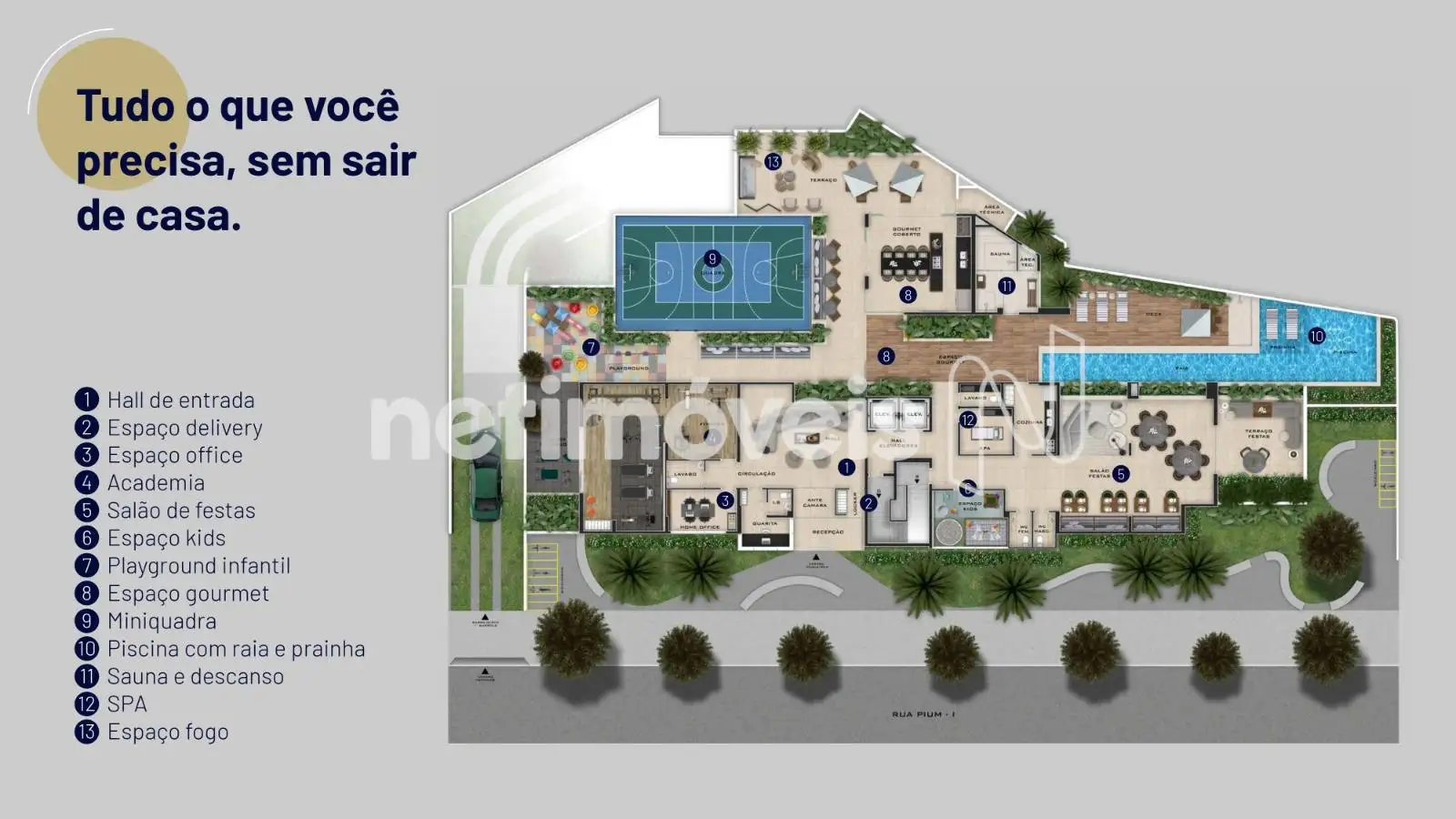 - Hall social, espaço delivery,02 elevadores inteligentes, elevador tem acesso ao 2º pavimento das coberturas, salão de festas, espaços: Office, Kids, Fitness, Gourmet, Fogo . Miniquadra, piscina com raia e prainha, sauna e descanso, Spa, infraesturura para carregamento de carro elétrico 1 pto por apto, 03 vagas.