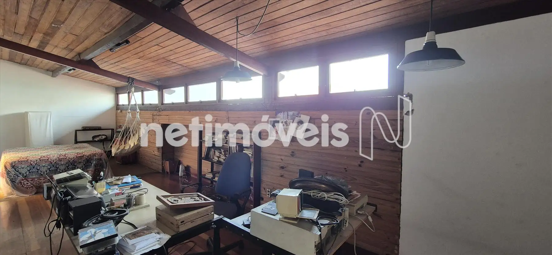 Acima da sala de jantar, o mezanino oferece um espaço versátil que pode ser utilizado como sala de leitura, TV ou descanso.