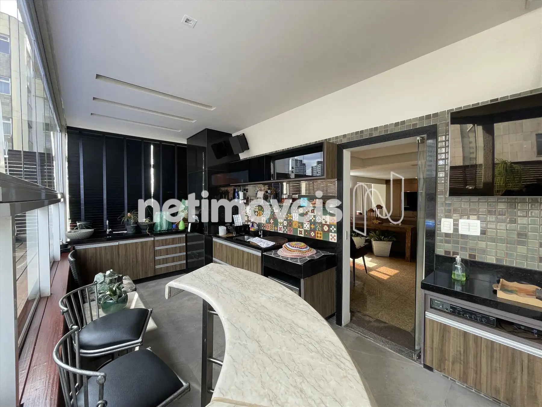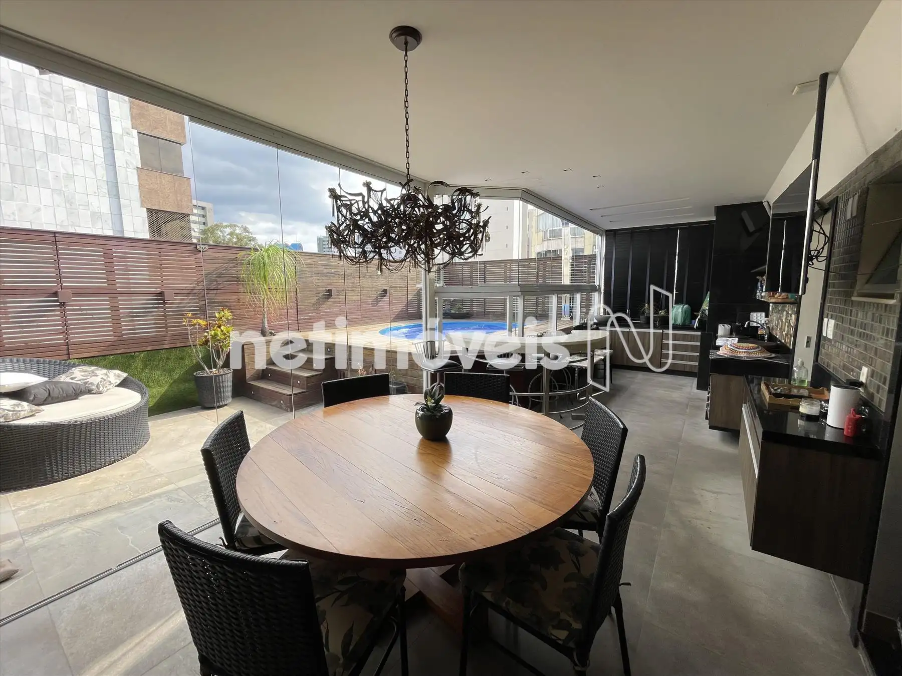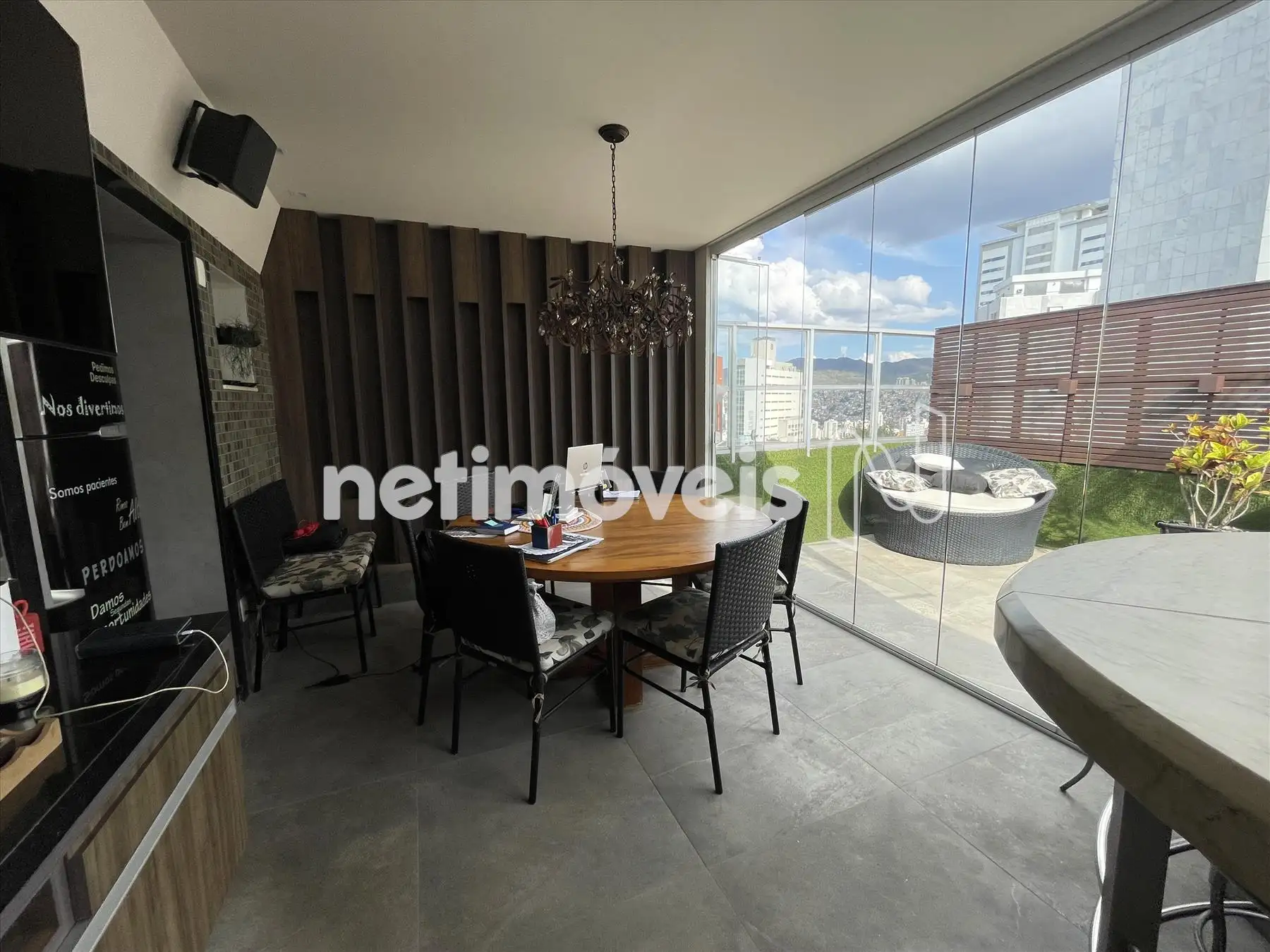Área externa fechada com cortina de vidro, churrasqueira, lavabo;