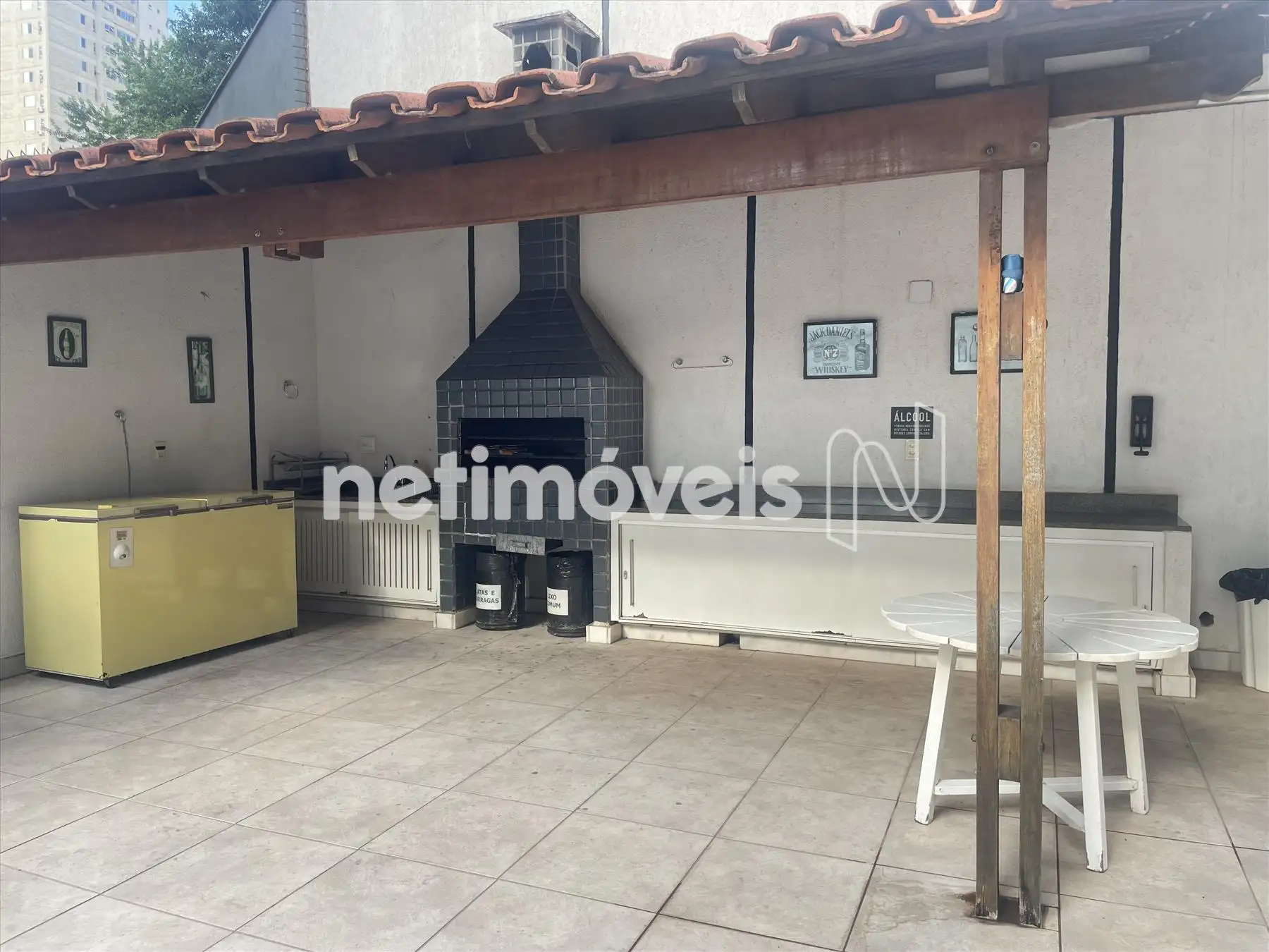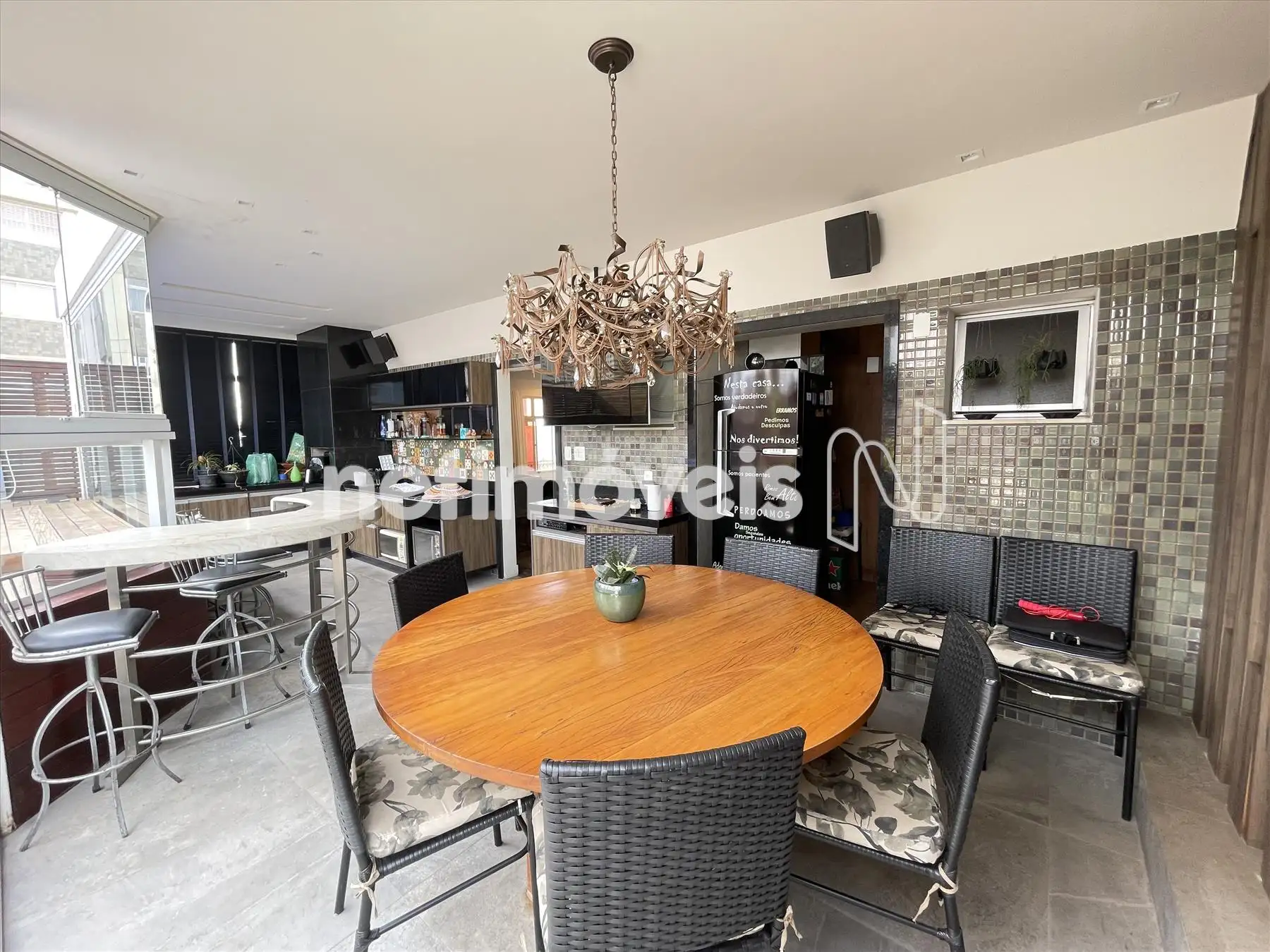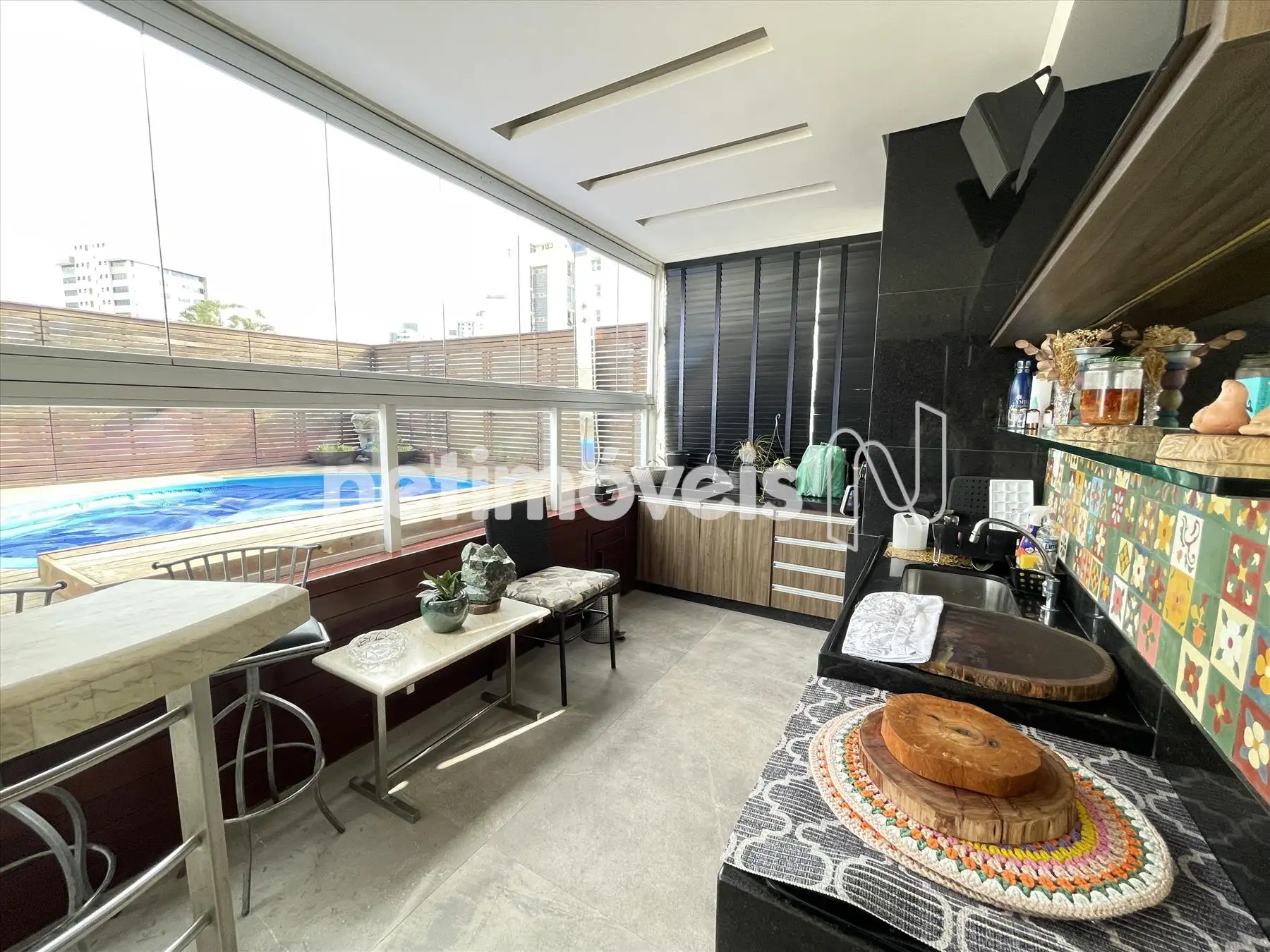 Área externa fechada com cortina de vidro, churrasqueira, lavabo;