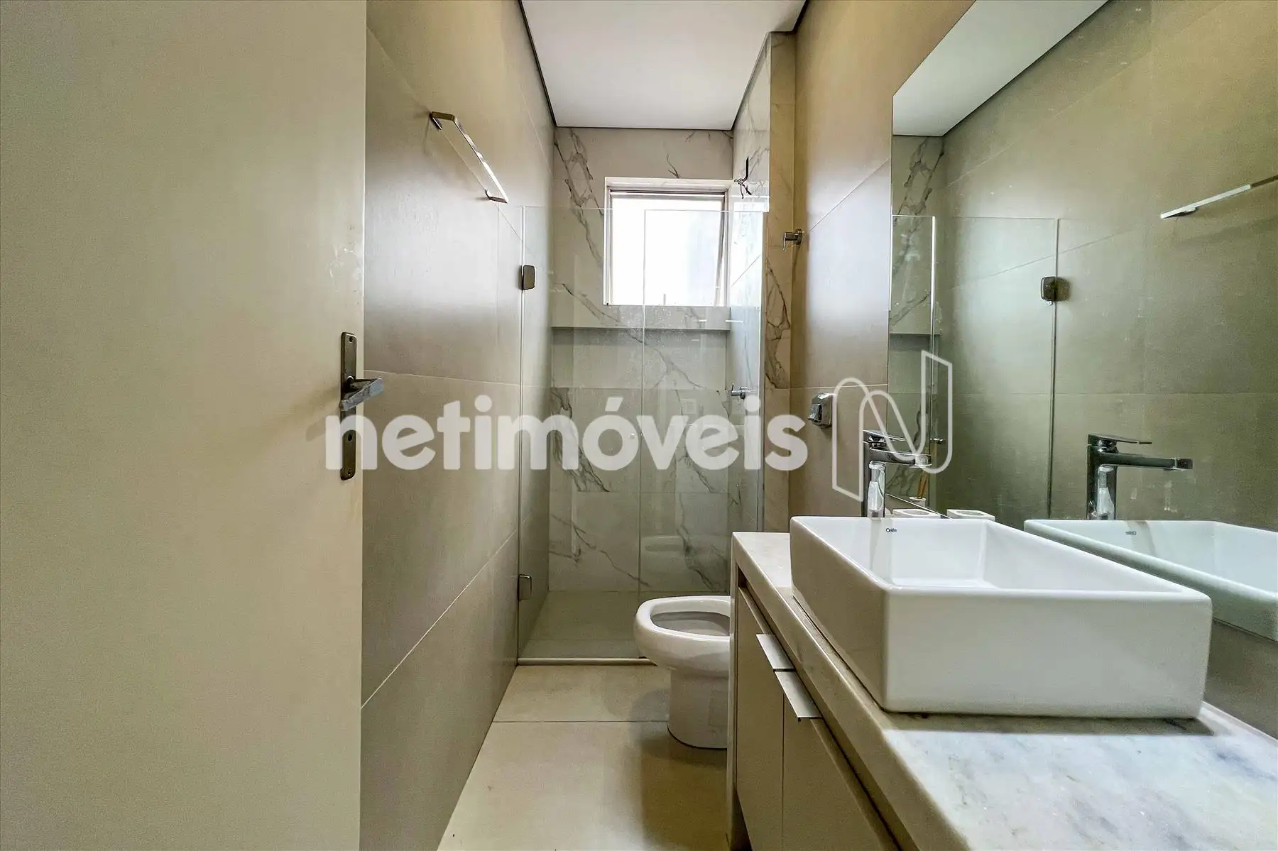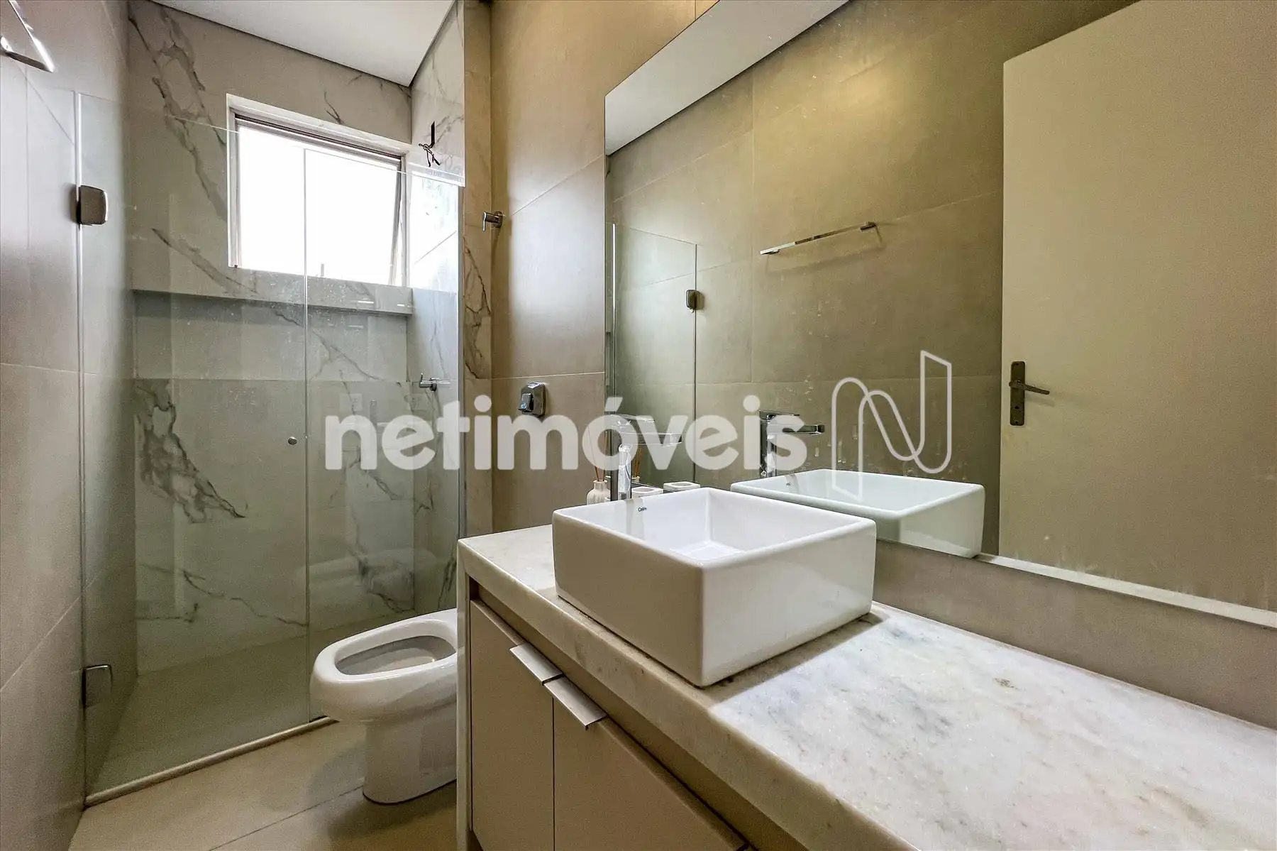 - Banhos suíte e social com piso em porcelanato, pia com bancada em mármore, com armário, espelho e box em vidro temperado;