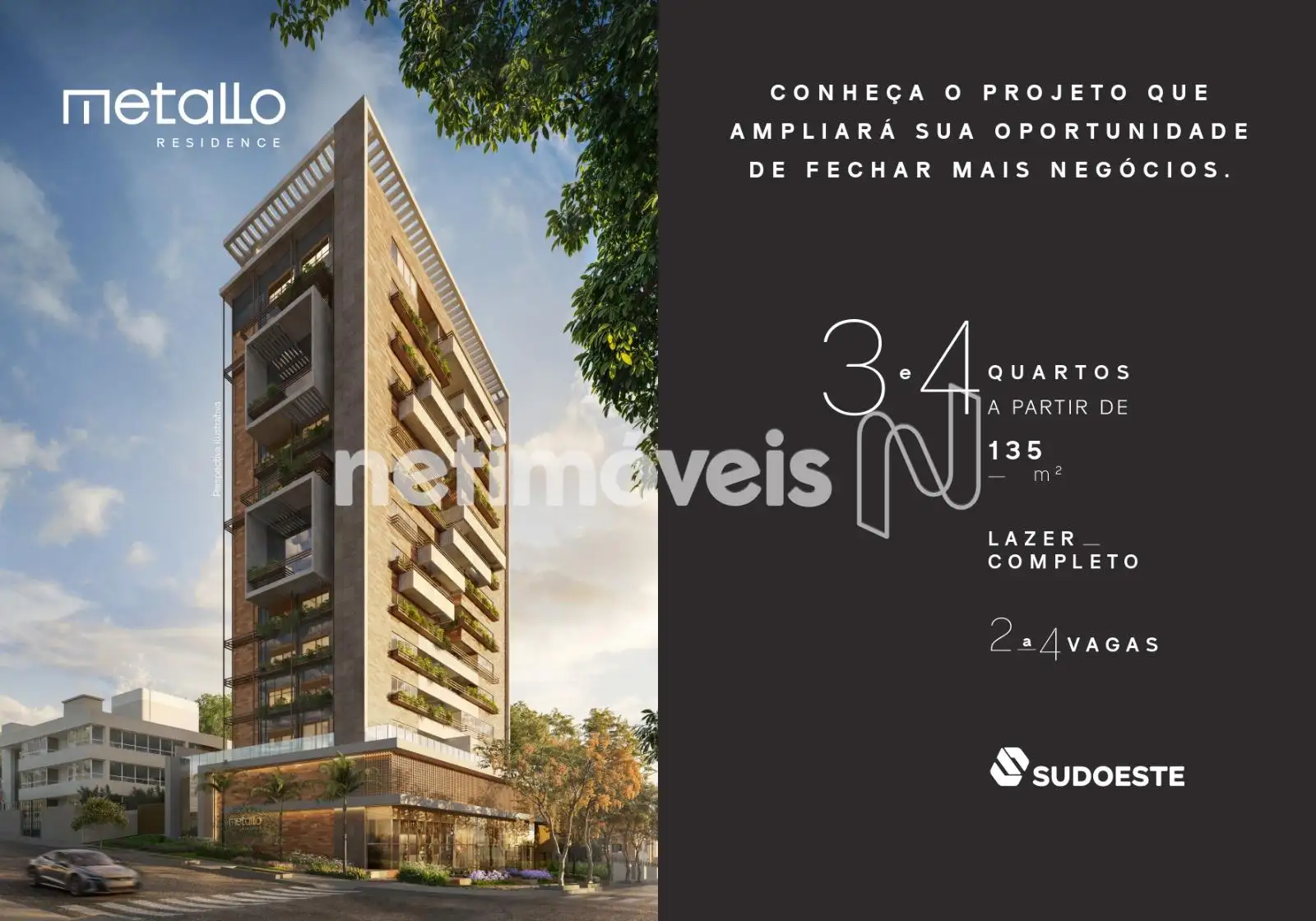 - Metallo Residence 4 quartos a partir de 135m2 com varanda, lazer completo, 2 a 4 vagas, padrão SUDOESTE com diferenciais em segurança, tecnolocia, sustentabilidade e bem-estar. Com localização estratégica tem fácil acesso a região centro-sul, comércio diversificado, ideal para quem procura praticidade e qualidade de vida. Medidores de água e gás individualizados, preparação para ar condicionado, personalização para projetos de 3qts com 3 suites.