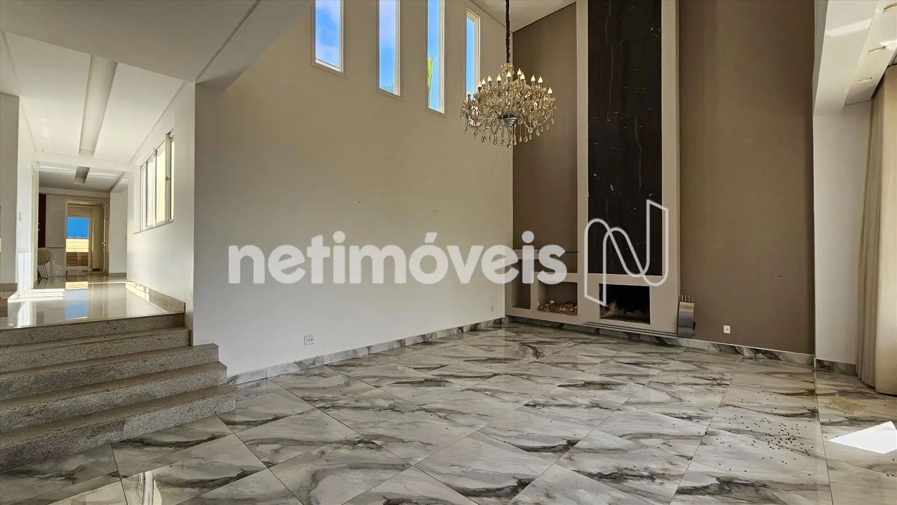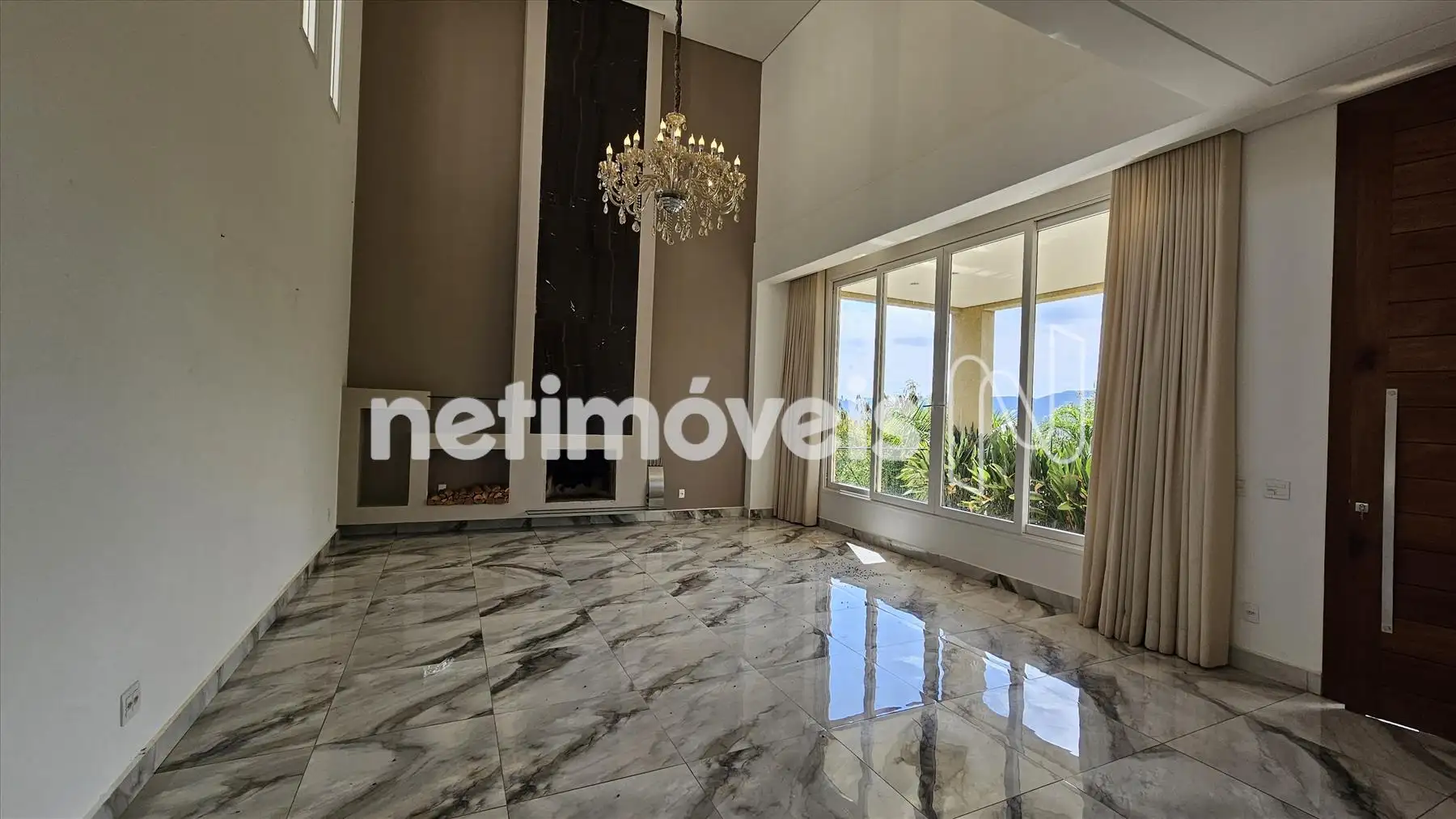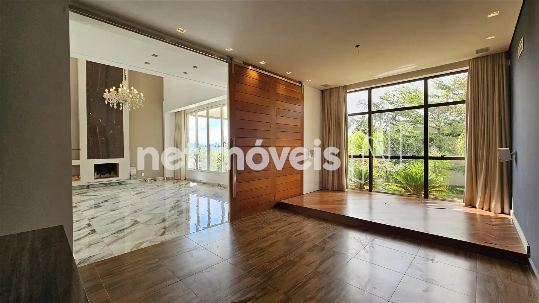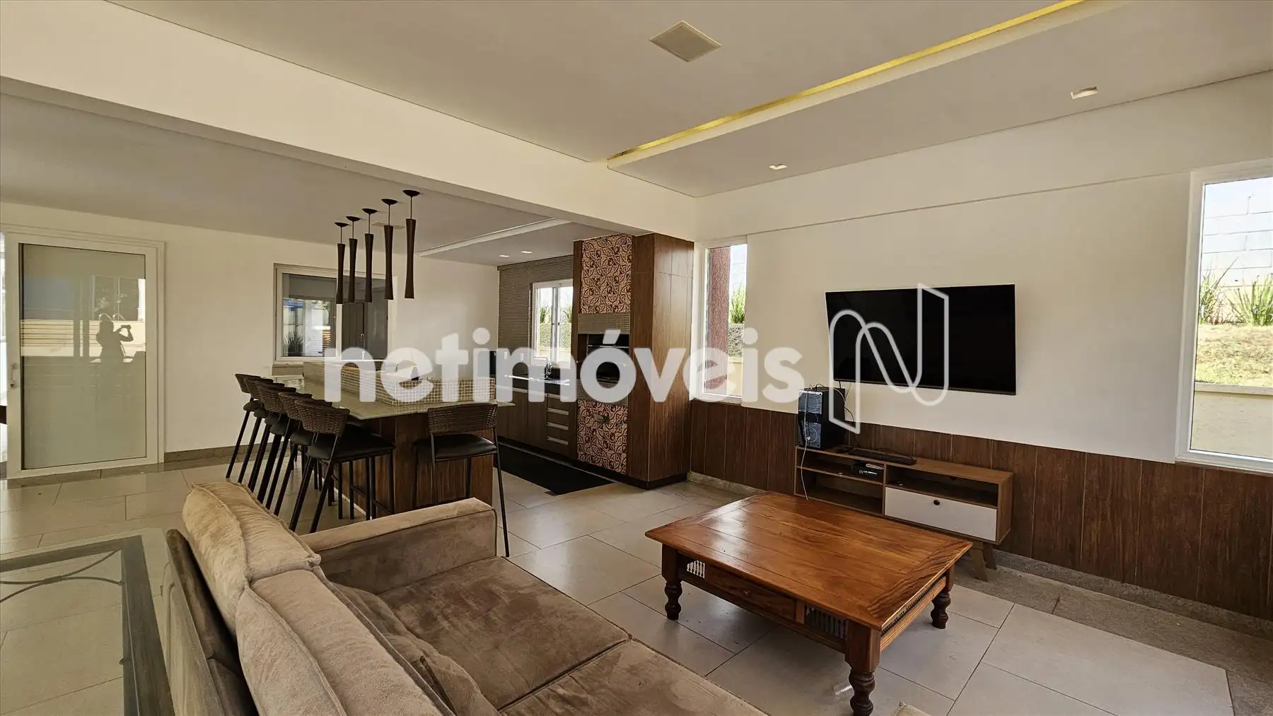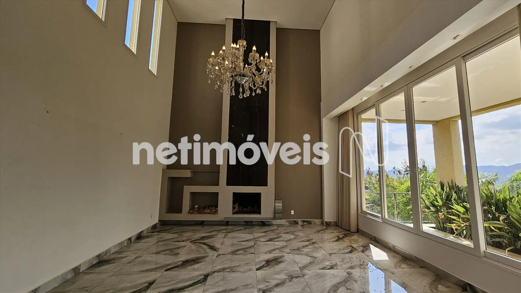 1° pavimento: Ampla e aconchegante sala com pé direito duplo, piso em táboa corrida e lareira a carvão, sala de cinema com telão, projetor e preparação para ar condicionado.
