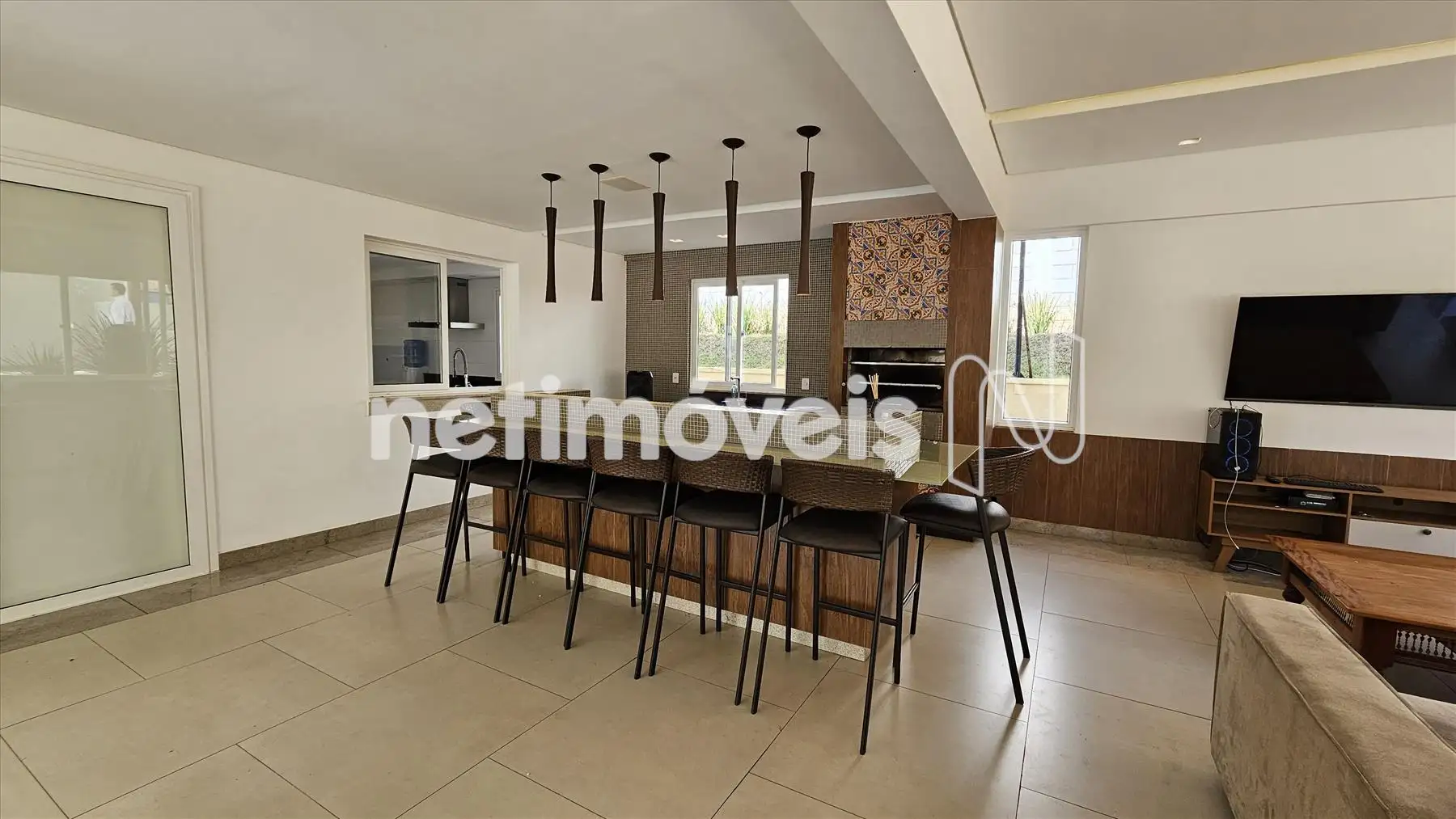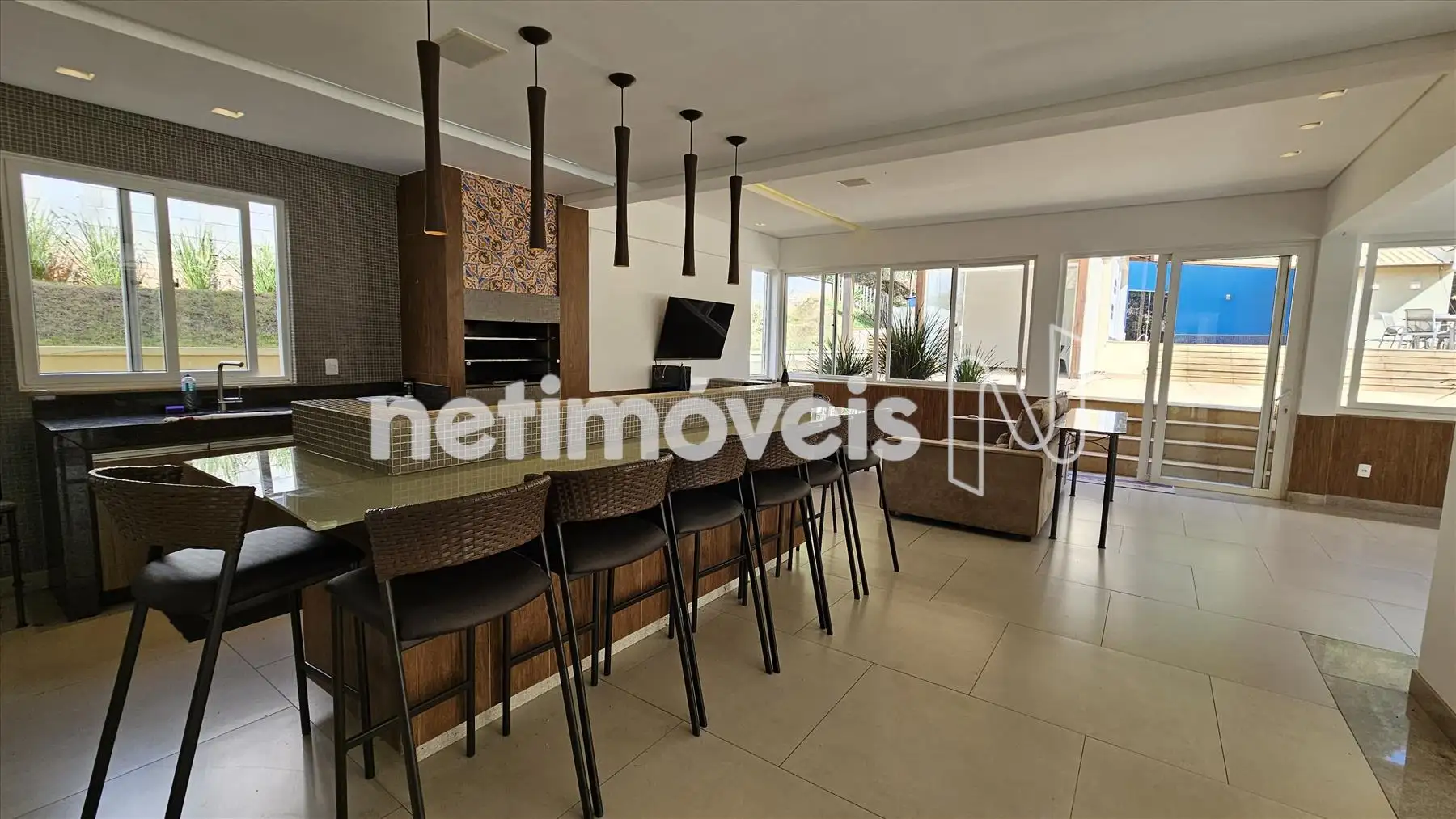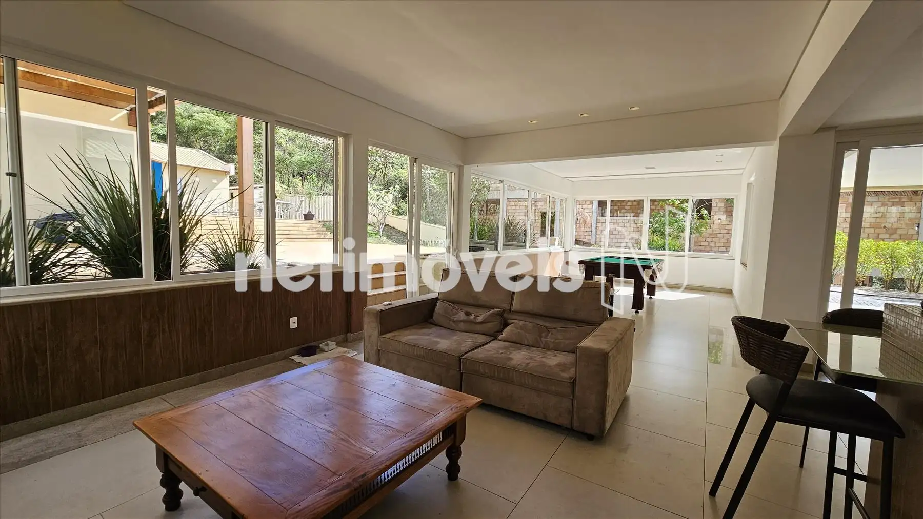 Adega, bar com apoio de pia, lavabo, sala de jantar com saída para o jardim de inverno e linda vista para as montanhas.