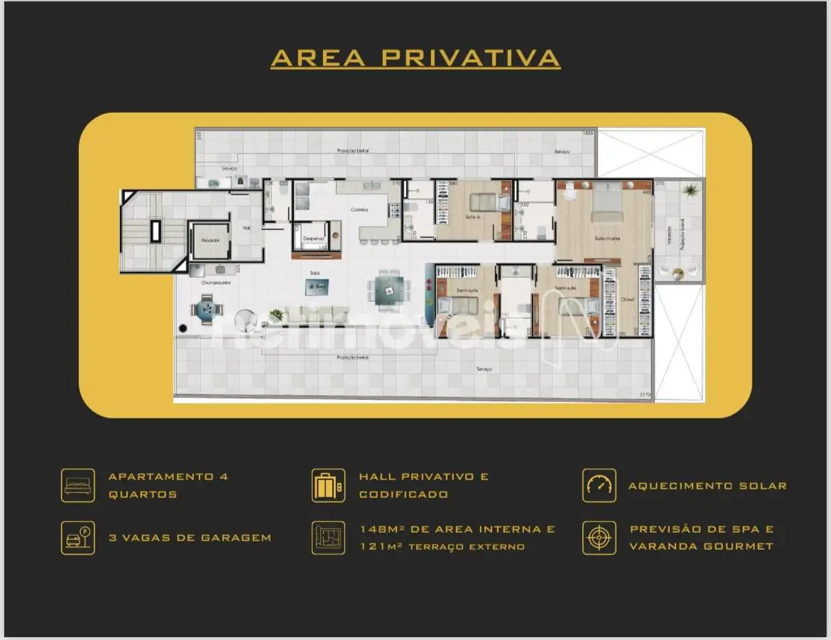- 4 Quartos, sendo 2 suítes e 2 semi-suítes, garantindo conforto e privacidade para toda a família.