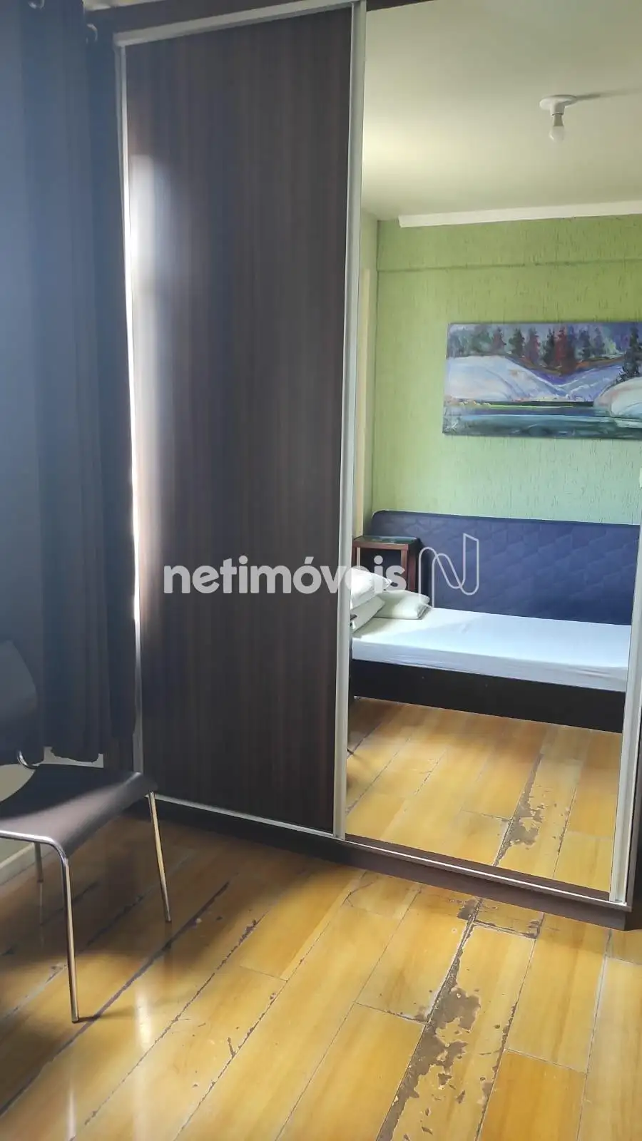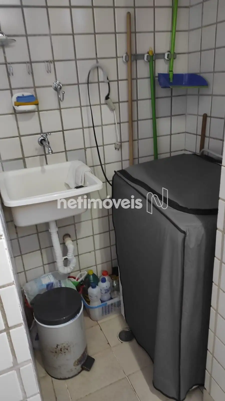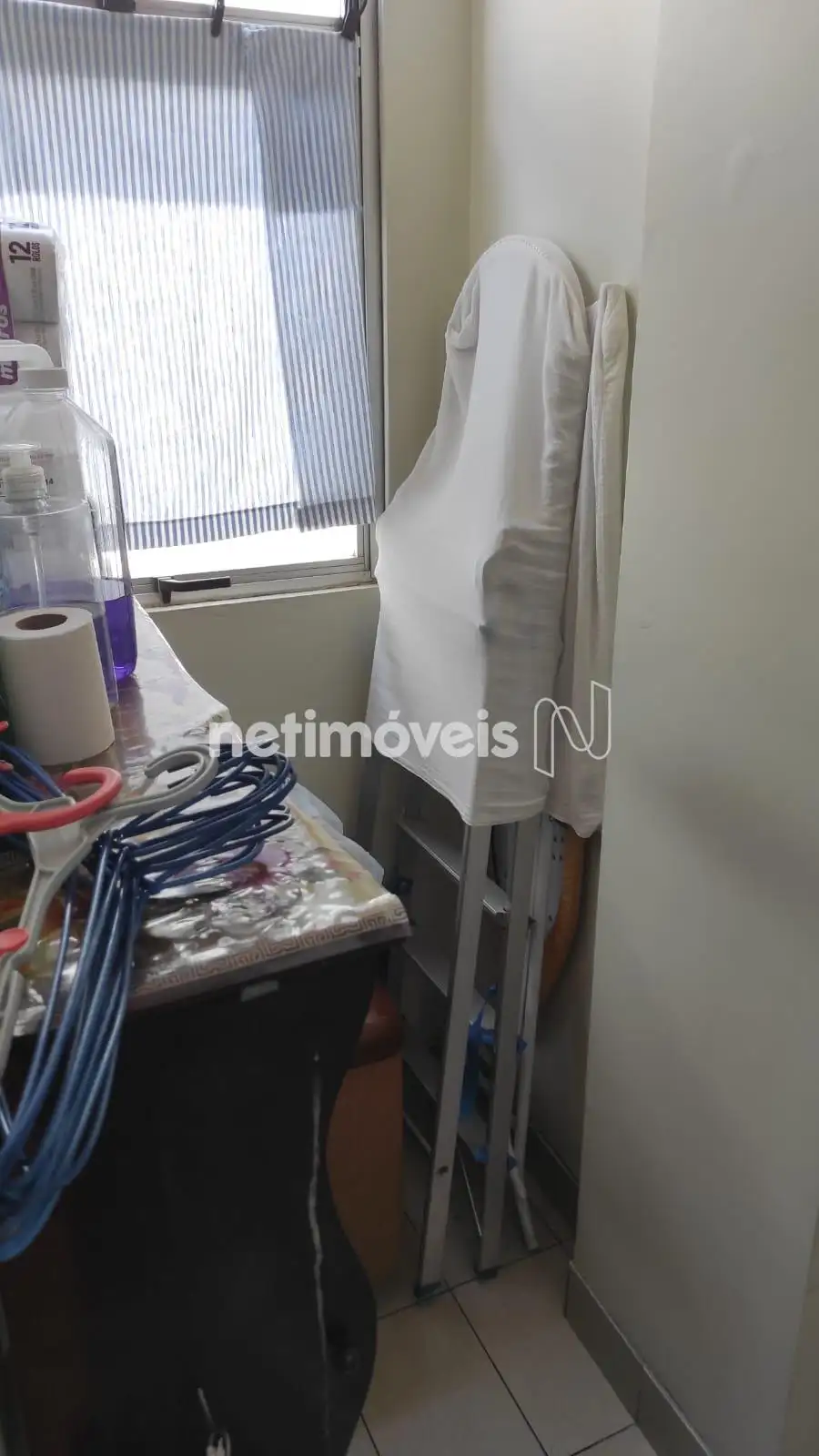 O apartamento possui duas amplas salas com piso laminado, três quartos, sendo um deles uma suíte com armário e portas espelhadas. O banheiro social conta com box blindex. A cozinha é funcional, equipada com armários planejados e piso em cerâmica. O imóvel ainda dispõe de uma área de serviço e um banheiro de empregada.