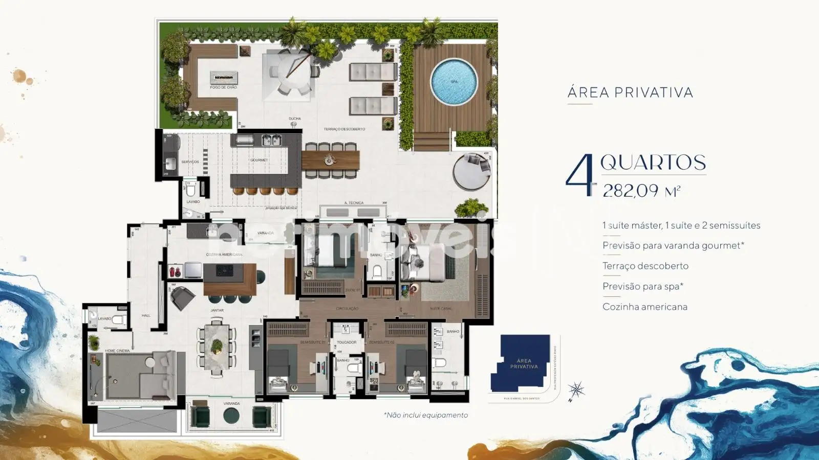 - 1 suíte máster, 1 suíte, 2 semissuítes;