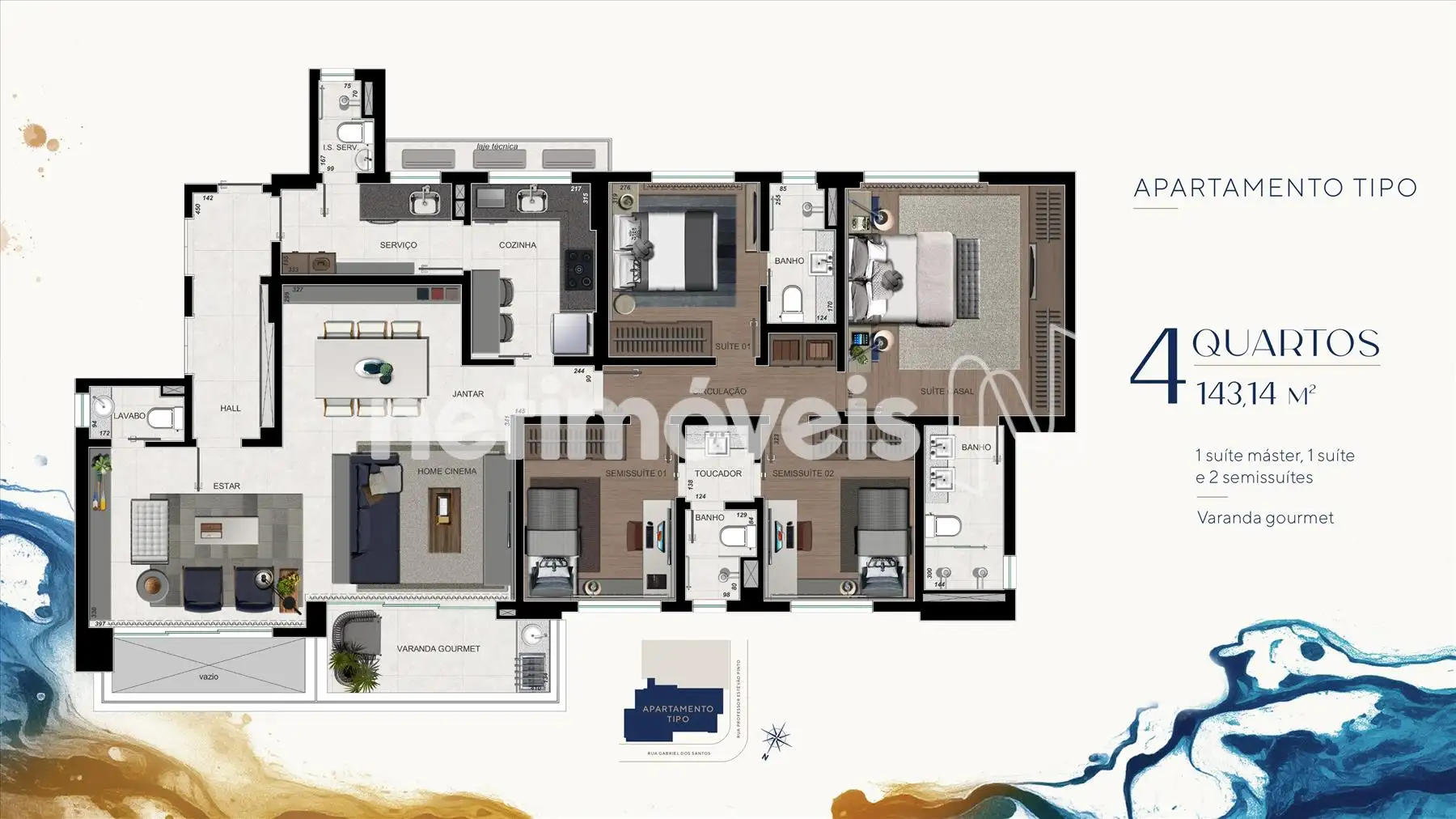 - Varanda Gourmet 4 quartos sendo 1 suíte máster, 1 suíte, 2 semissuítes com toucador;